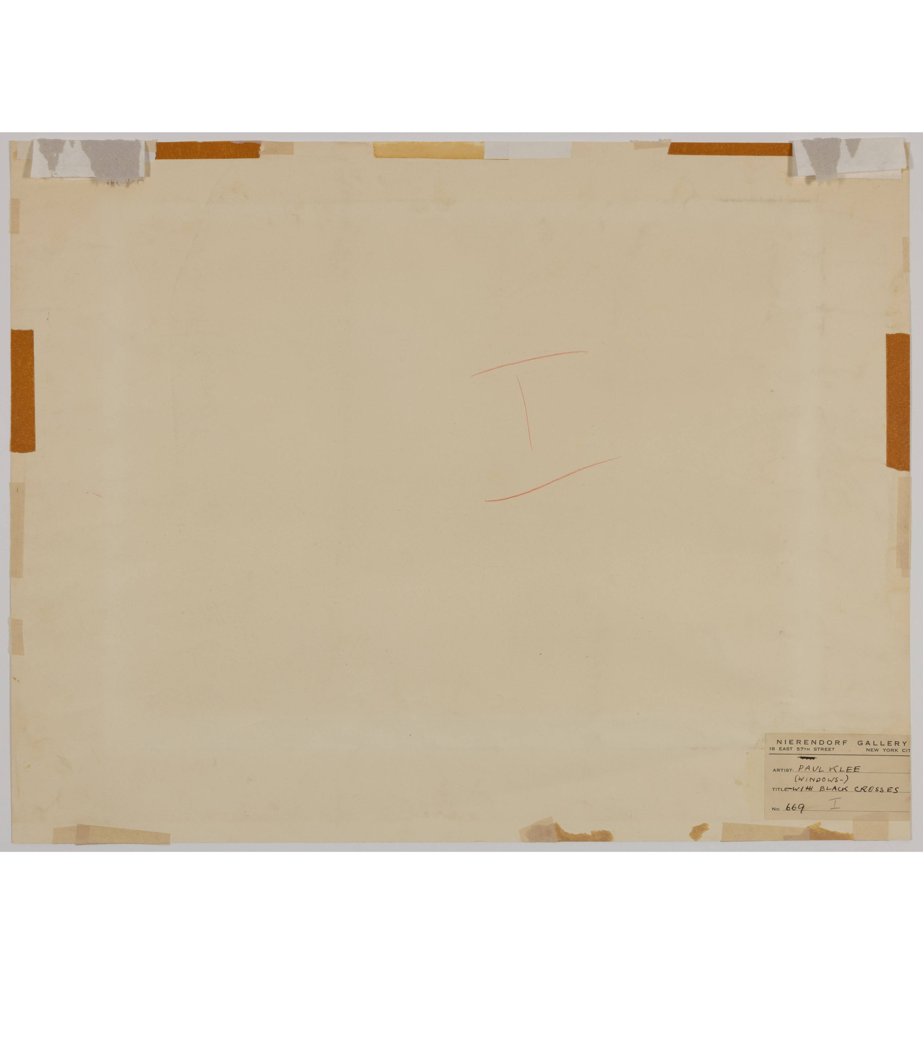 Oben rechts vom Künstler in Tusche signiert "Klee", auf Unterlage über Abschlussstrich unten links datiert und mit der Werknummer "1938 G 18", rechts betitelt "schwarze Fenster-Kreuze"