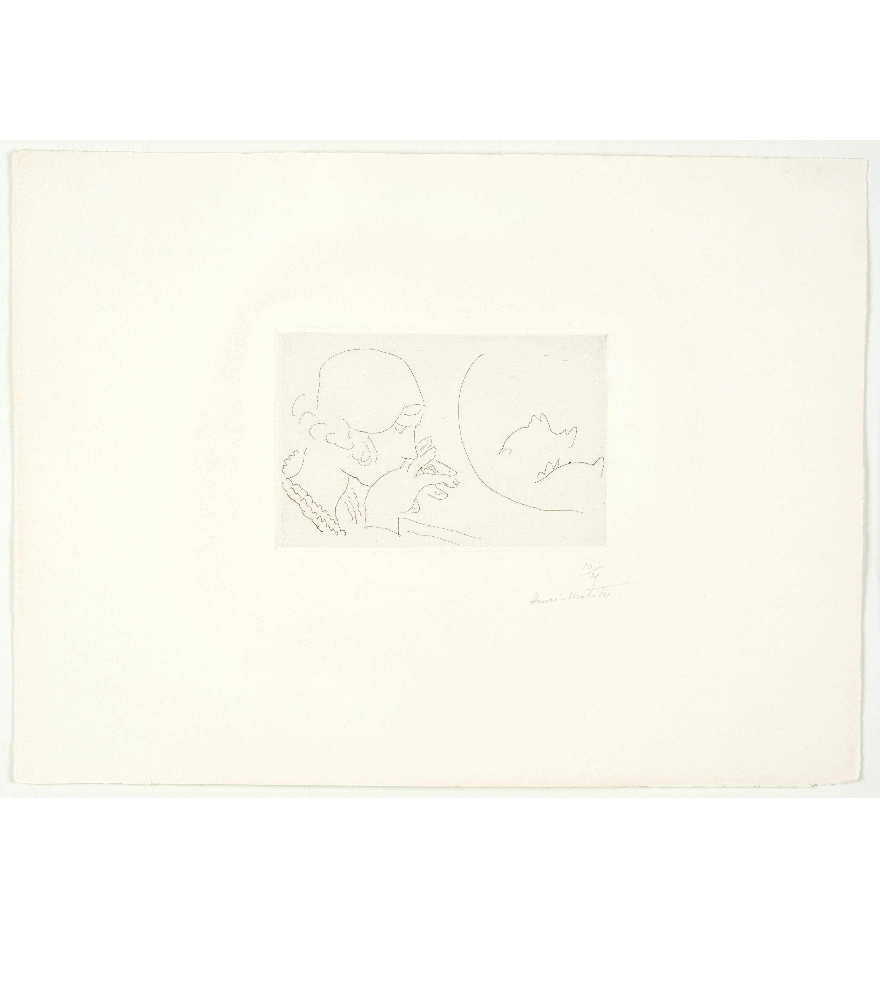 Included: Jeune femme contemplant un bocal de poissons rouges. 1929. etching on chine appliqué, on wove paper. 10x15.1 cm, plate edge; 28.2x38 cm, sheet size. Duthuit 172. numbered "10/25" in pencil lower right by the artist, signed "Henri Matisse" below.