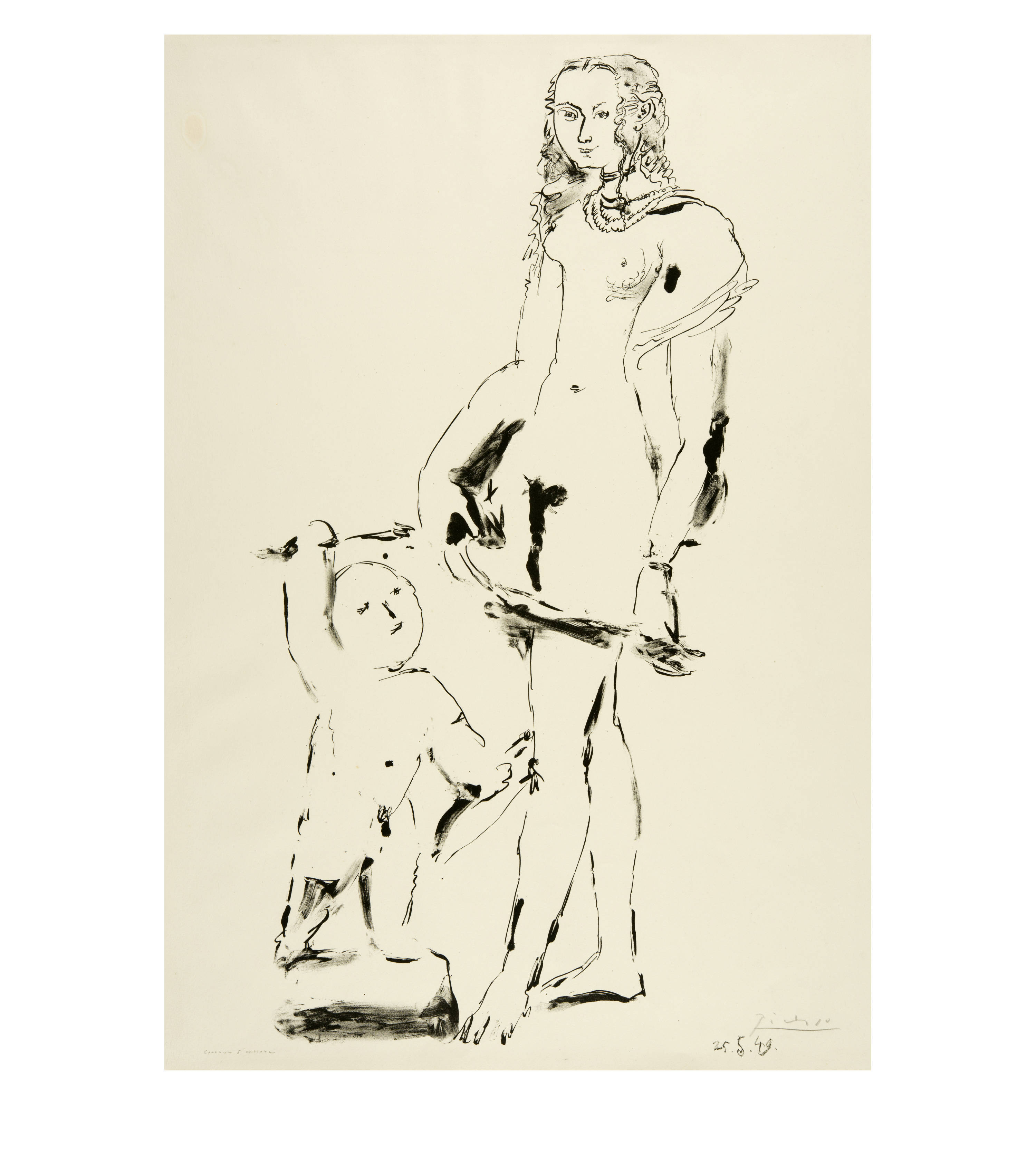One of Pablo Picasso's various graphic adaptations of "Venus und Amor" by Lucas Cranach the Elder. Cranach (probably 1472-1553) had realised the motif in several paintings and a woodcut. Picasso was inspired by a postcard sent to him by Daniel-Henry Kahnweiler (1884-1979), on which the painting "Venus und Amor", now in the Gemäldegalerie in Berlin, was depicted.