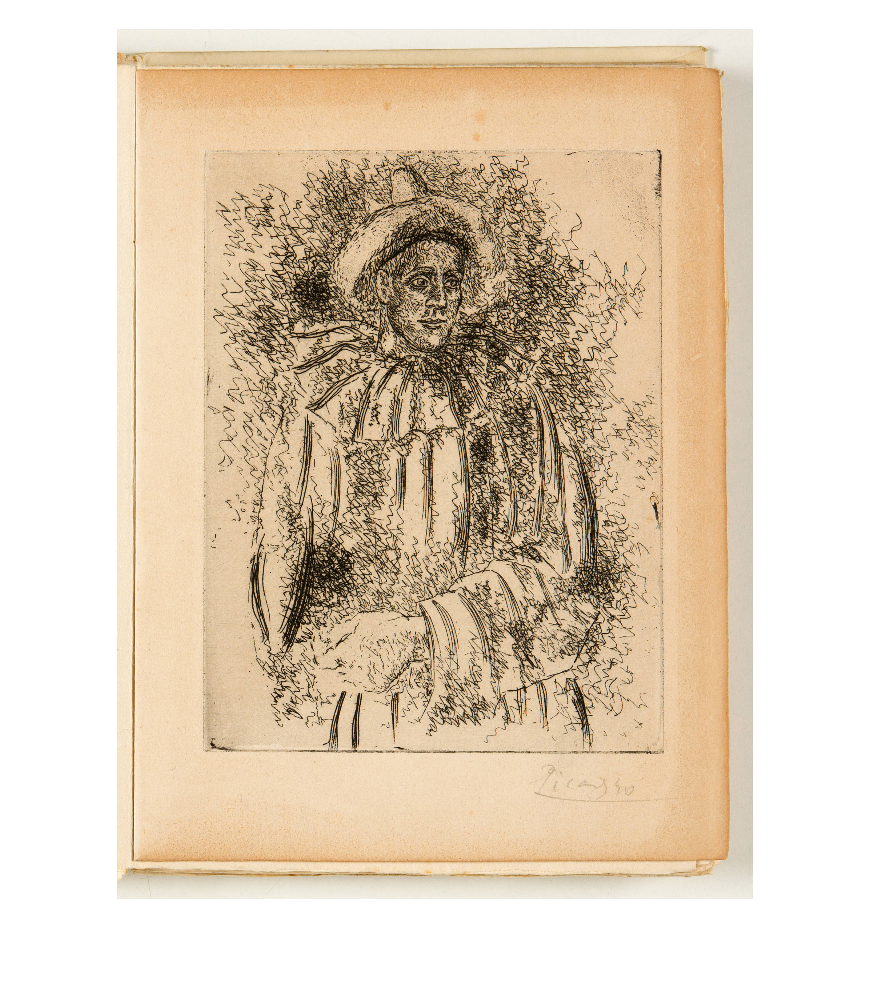 Wichtiges Buch von Max Jacob mit einer eingebundenen Radierung "Pierrot (Massine en Pierrot)" als Beitrag von Picasso. Jacob kannte den Künstler schon lange, er teilte mit ihm sogar eine Weile ein Zimmer am Boulevard Voltaire.