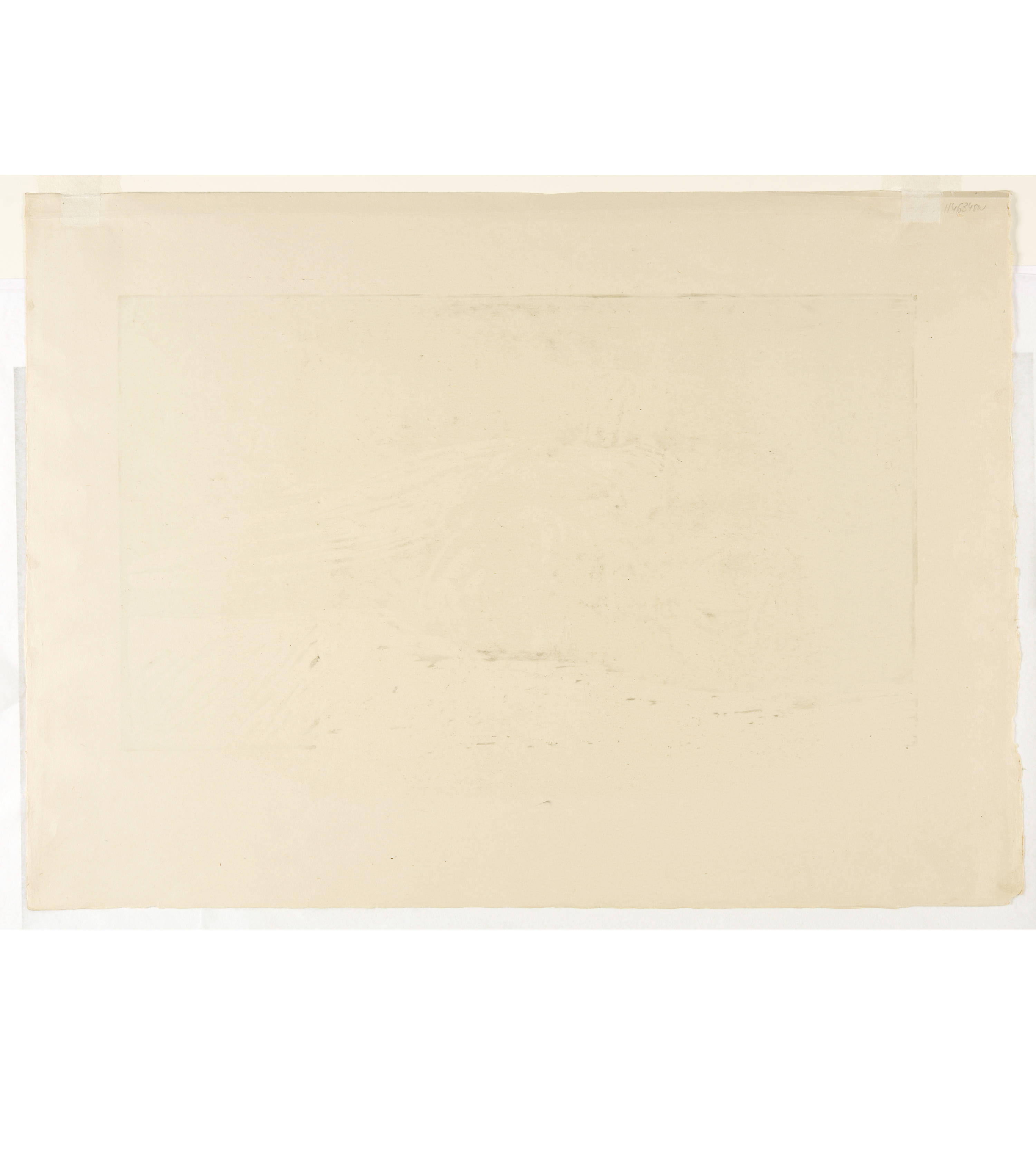 Horizontal fold at top margin. Vertical trace in the black from the printing process