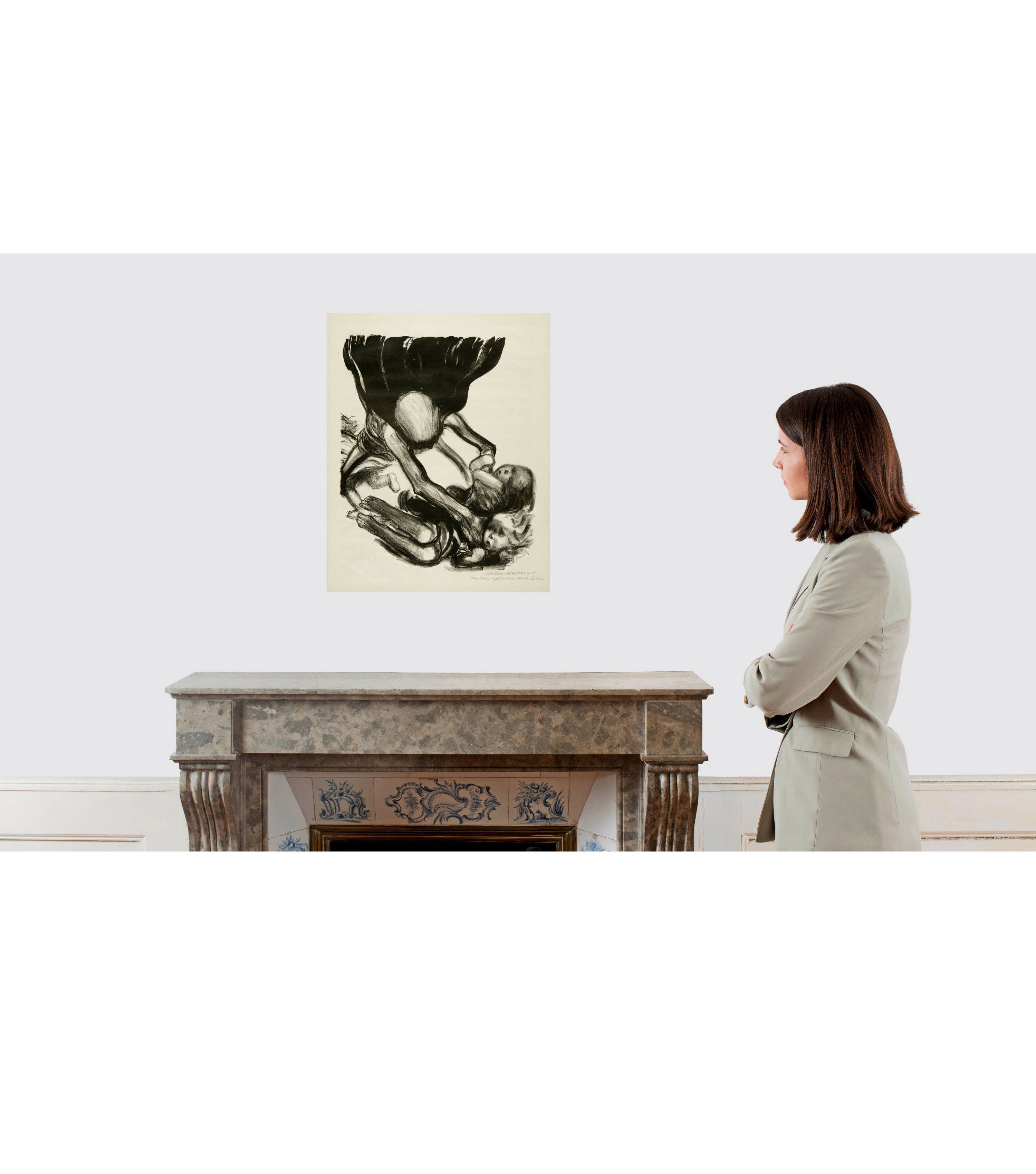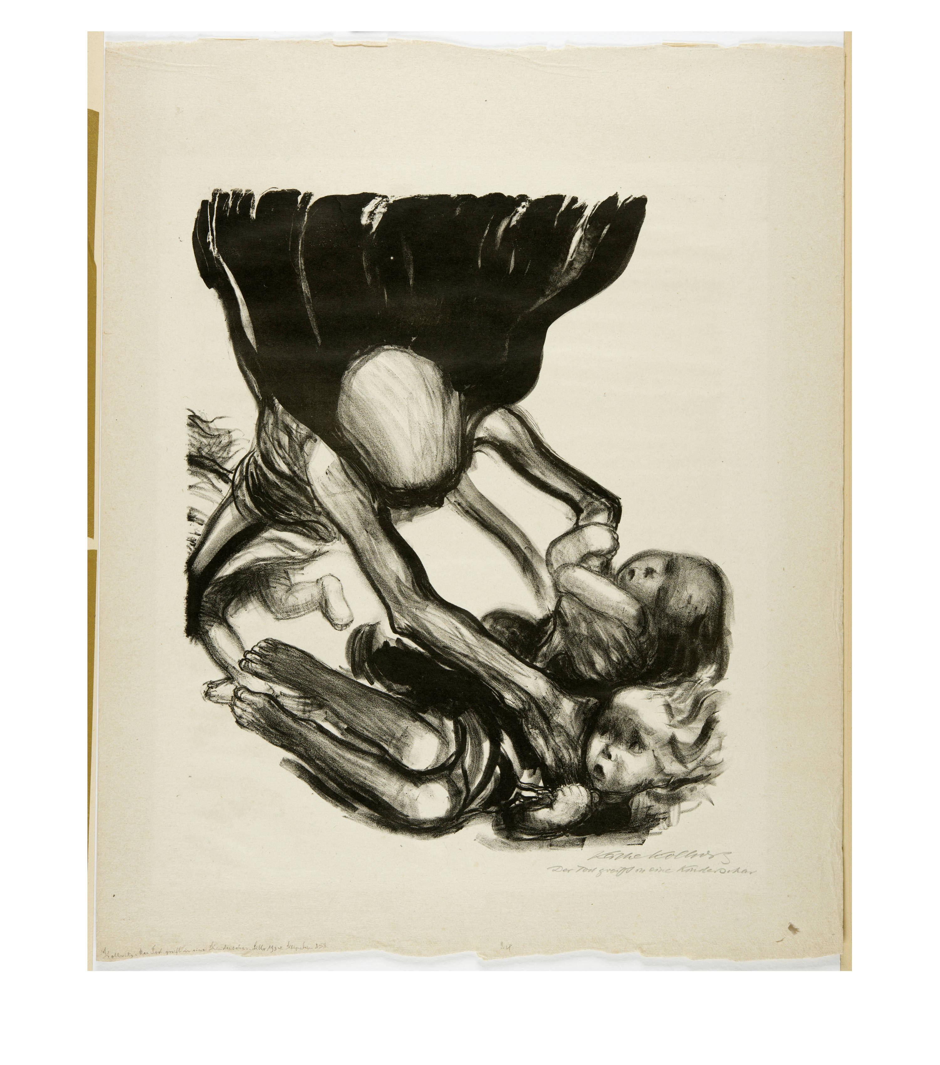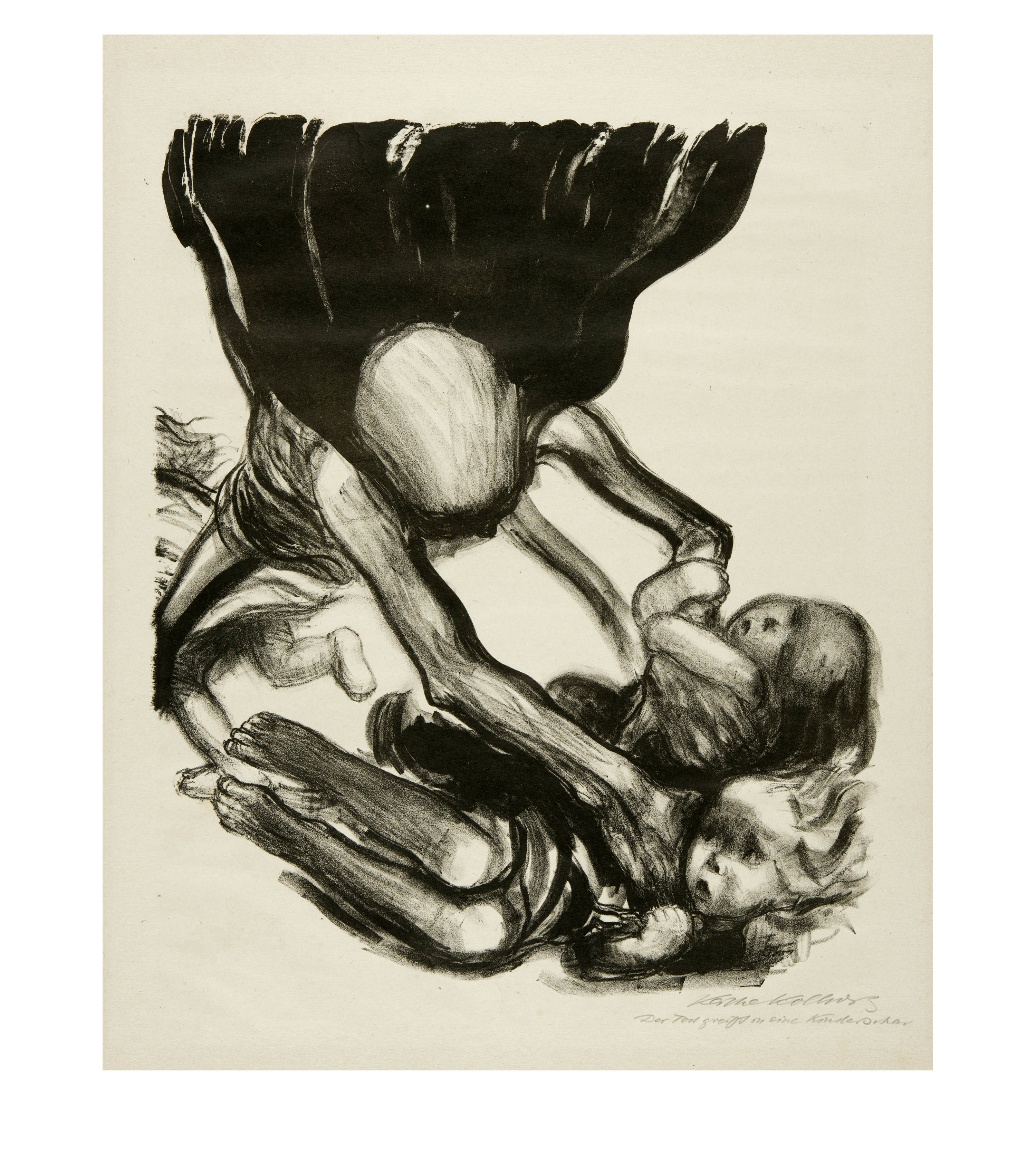 Unten rechts von der Künstlerin in Bleistift signiert "Käthe Kollwitz" und darunter eigenhändig betitelt "Der Tod greift in eine Kinderschar"