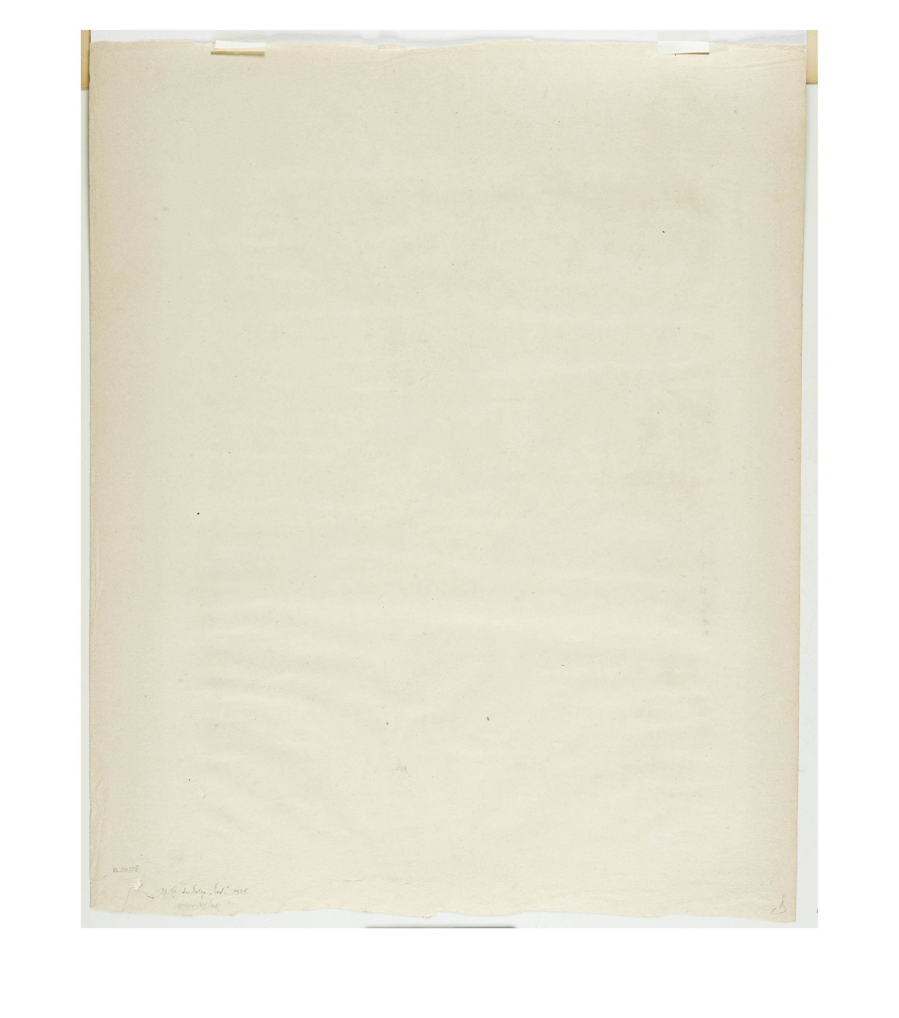 Mit breitem Rand, der untere Blattrand unregelmässig geschnitten, rechts in der unteren Ecke mit einem kleinen Loch im Papier. Der untere Rand wohl unsachgemäss von einer Unterlage abgelöst, Papierreste sichtbar. Das ganze Blatt leicht faltig