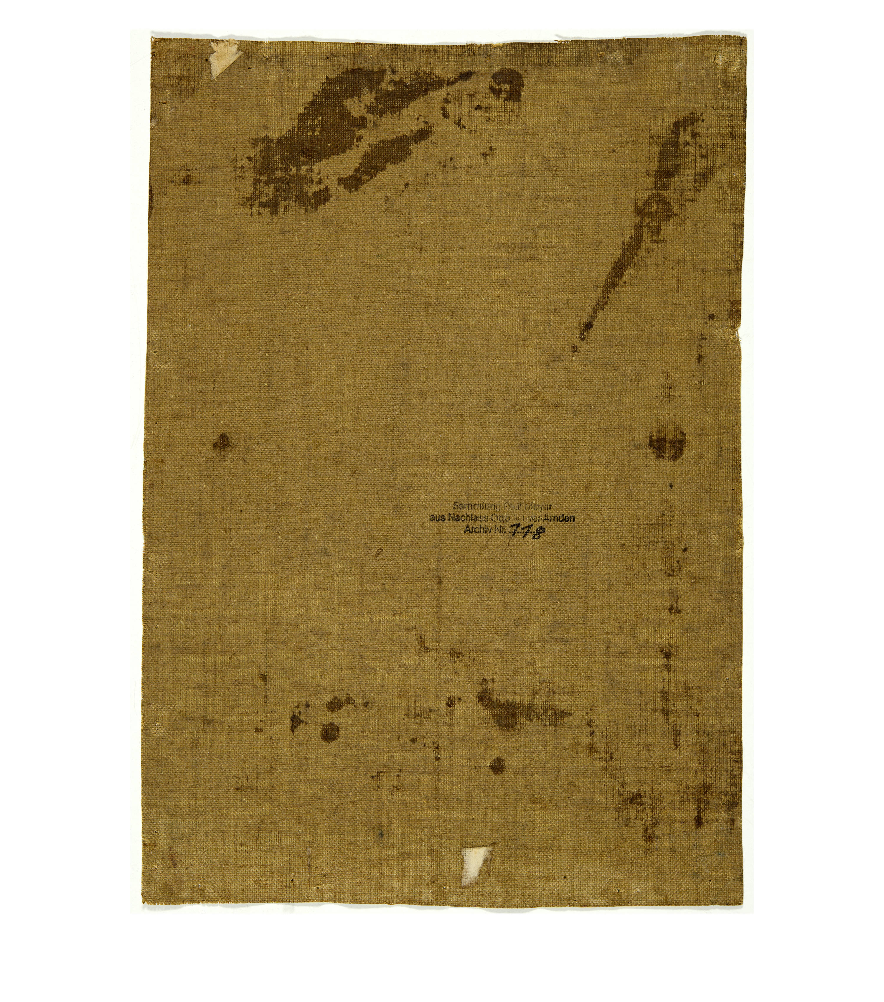 Die Leinwand wurde vom Keilrahmen abgenommen sowie auf allen vier Seiten beschnitten und durchstochen. Mit mehreren Farbverlusten