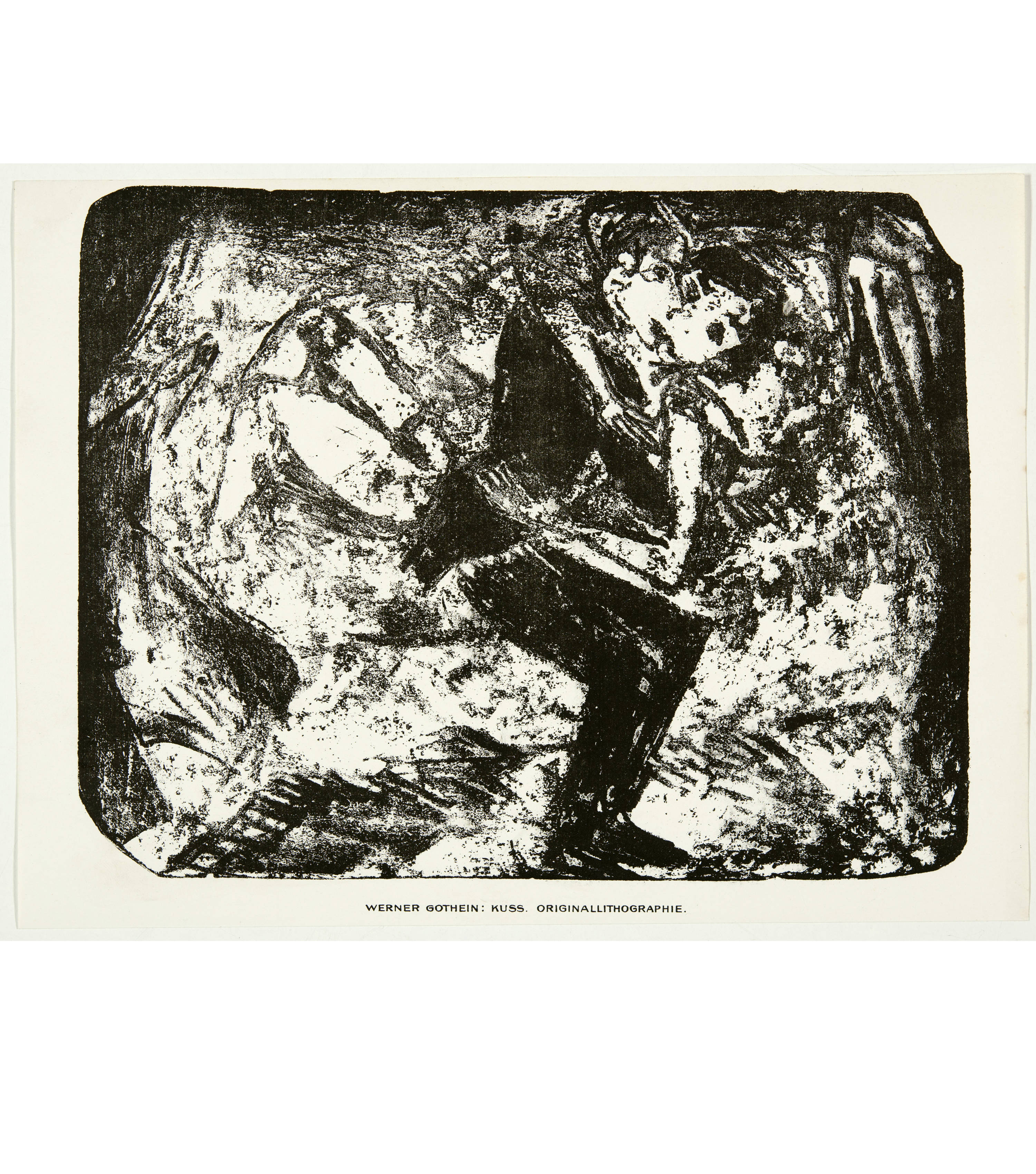 Included: Werner Gothein. Kiss. 1918. lithograph Included typographic underprint. 20.5x27.2 cm. As a supplement in "Das Kunstblatt", II. 1918, issue 5. - Hermann Max Pechstein. Bathers. 1918. lithograph Included typographic underprint. 27.2x20.5 cm, sheet size. Krüger L 266. as supplement in "Das Kunstblatt", II, 1918, no. 11. Included tear at upper right margin.