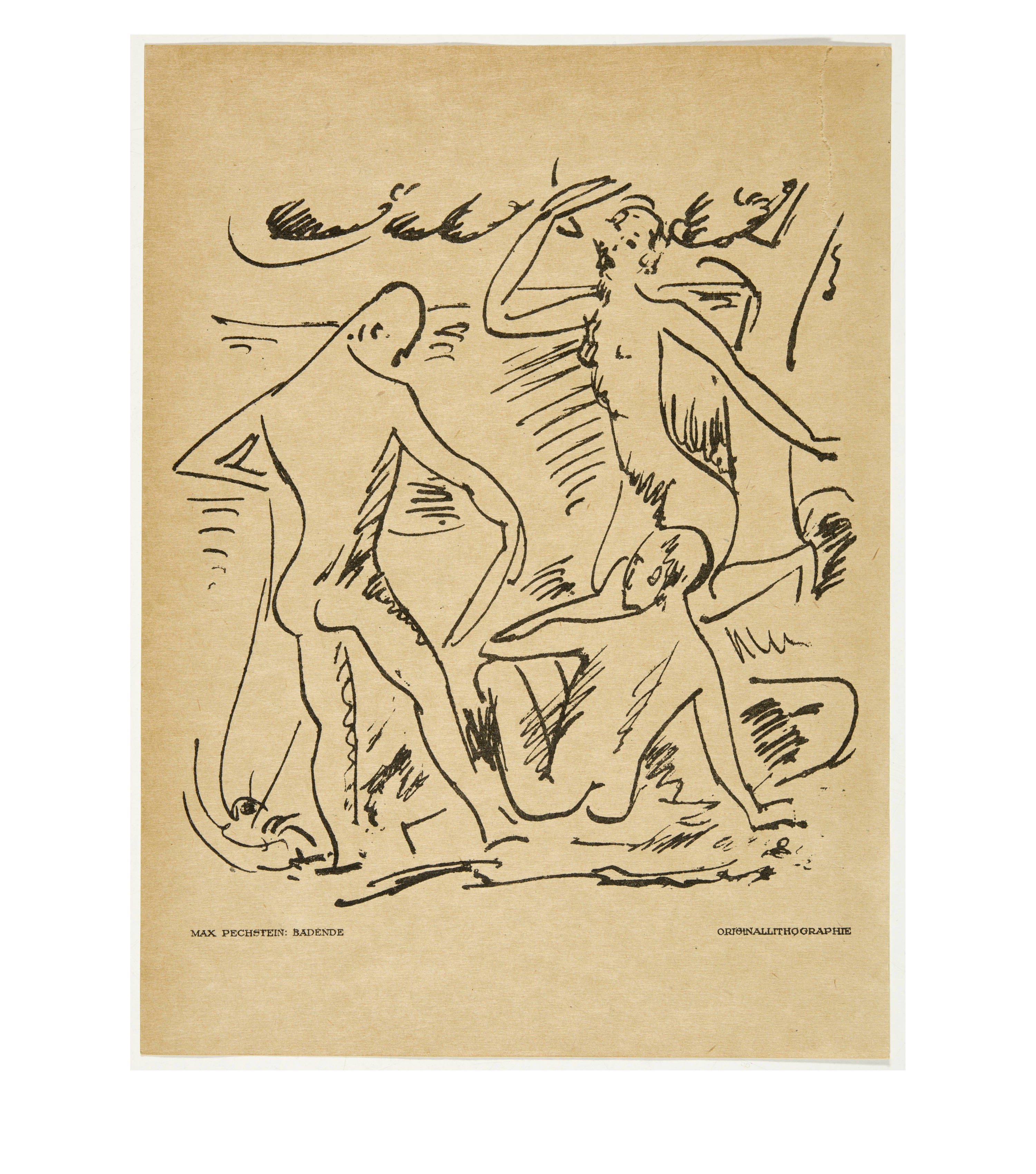 Dabei: Werner Gothein. Kuss. 1918. Lithographie mit typographischem Unterdruck. 20,5x27,2 cm. Als Beilage in "Das Kunstblatt", II. 1918, Heft 5. - Hermann Max Pechstein. Badende. 1918. Lithographie mit typographischem Unterdruck. 27,2x20,5 cm, Blattgrösse. Krüger L 266. Als Beilage in "Das Kunstblatt", II, 1918, Heft 11. Am oberen rechten Rand mit Einriss.