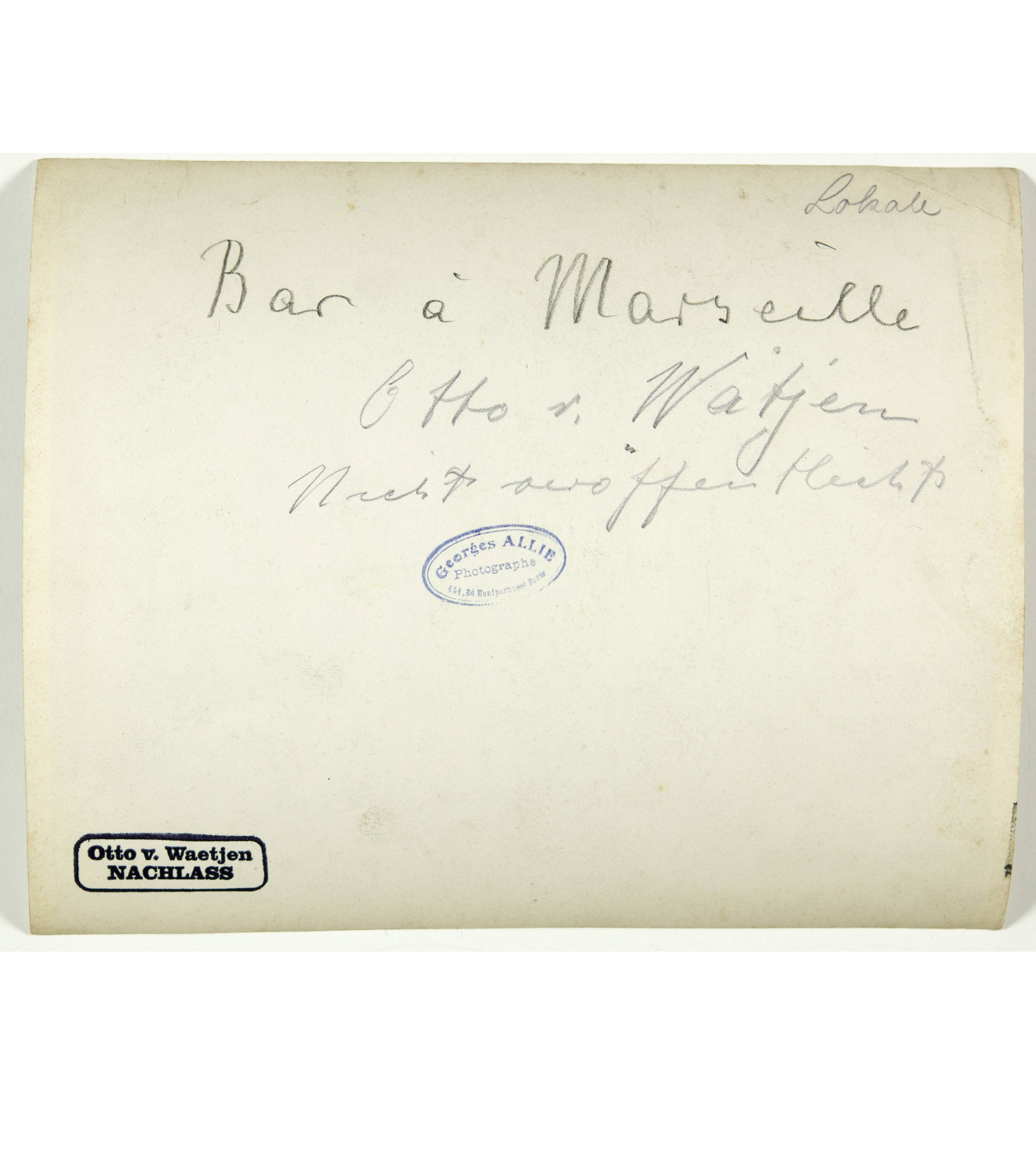 Ausgearbeitete Studie zum Gemälde "Bar à Marseille", 1928, von dem eine Fotografie dem Los beiliegt, Fotograf Georges Allie, 151 BD du Montparnasse, Paris. Fotografie rückseitig vom Künstler bezeichnet und signiert, mit dem Nachlassstempel "Otto v. Waetjen / NACHLASS" und dem Stempel des Fotografen.