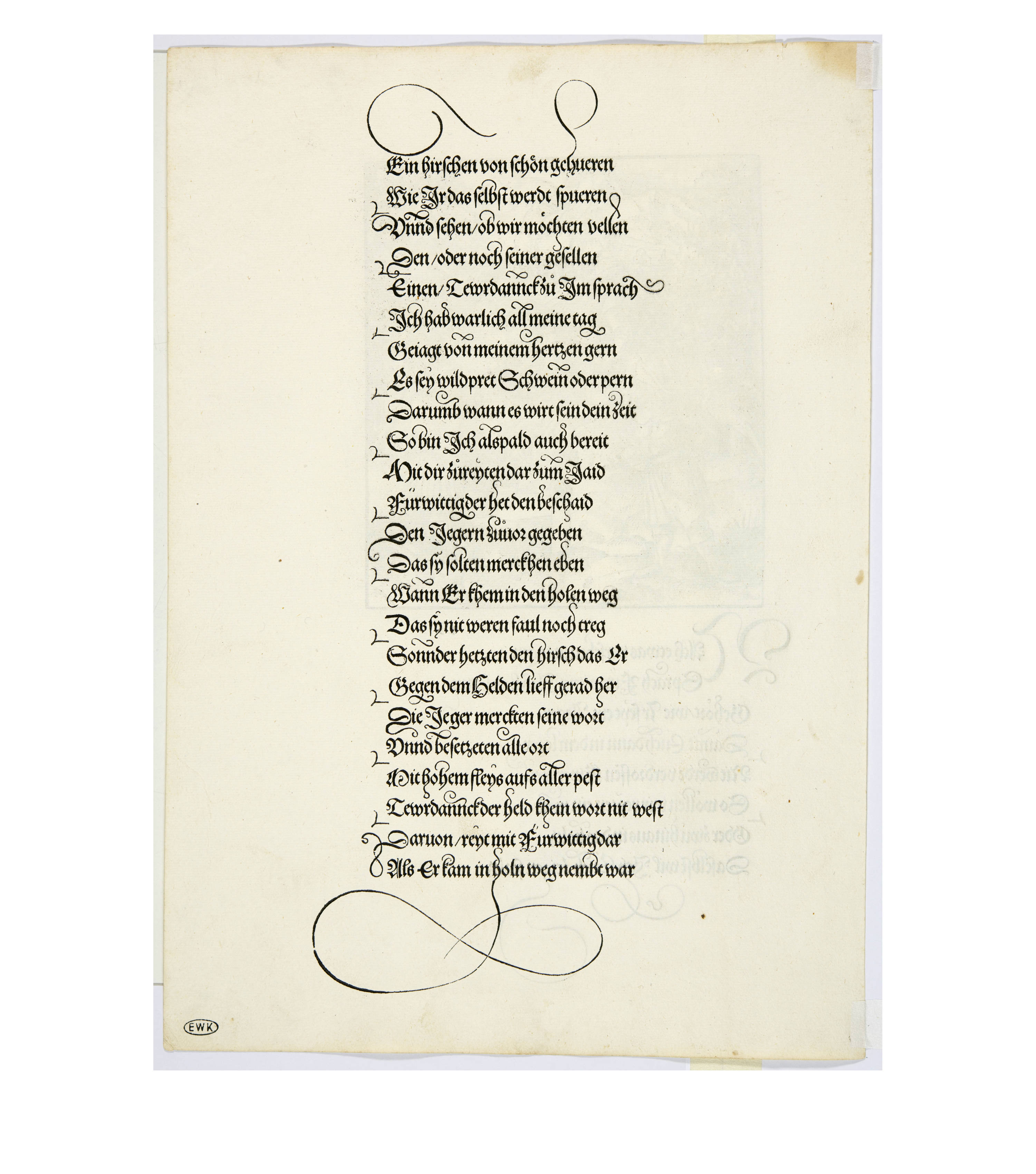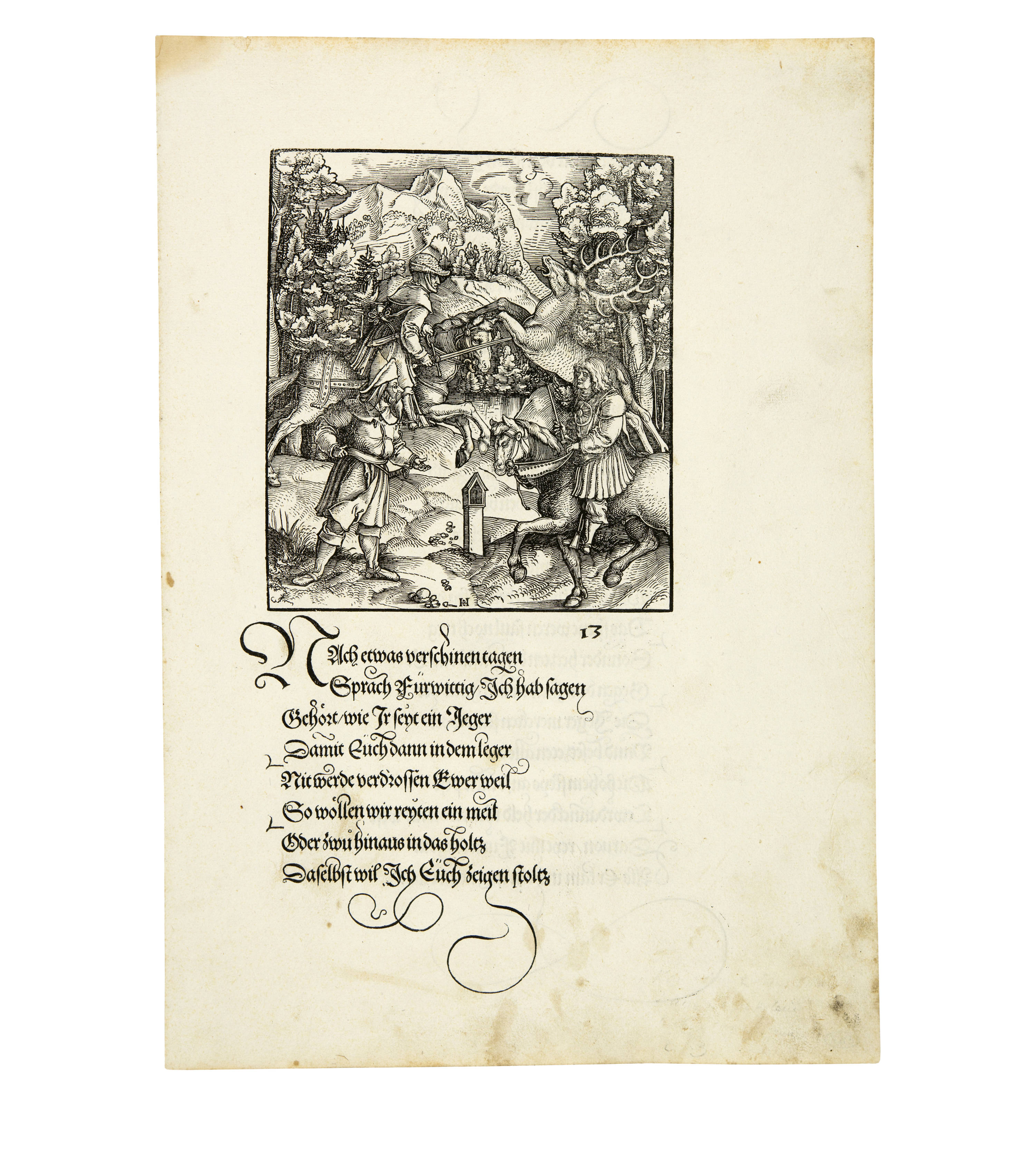 2. sheet 13: Hans Schäufelein. Theuerdank is brought into danger by Fürwittig on a deer hunt. Schreyl 824