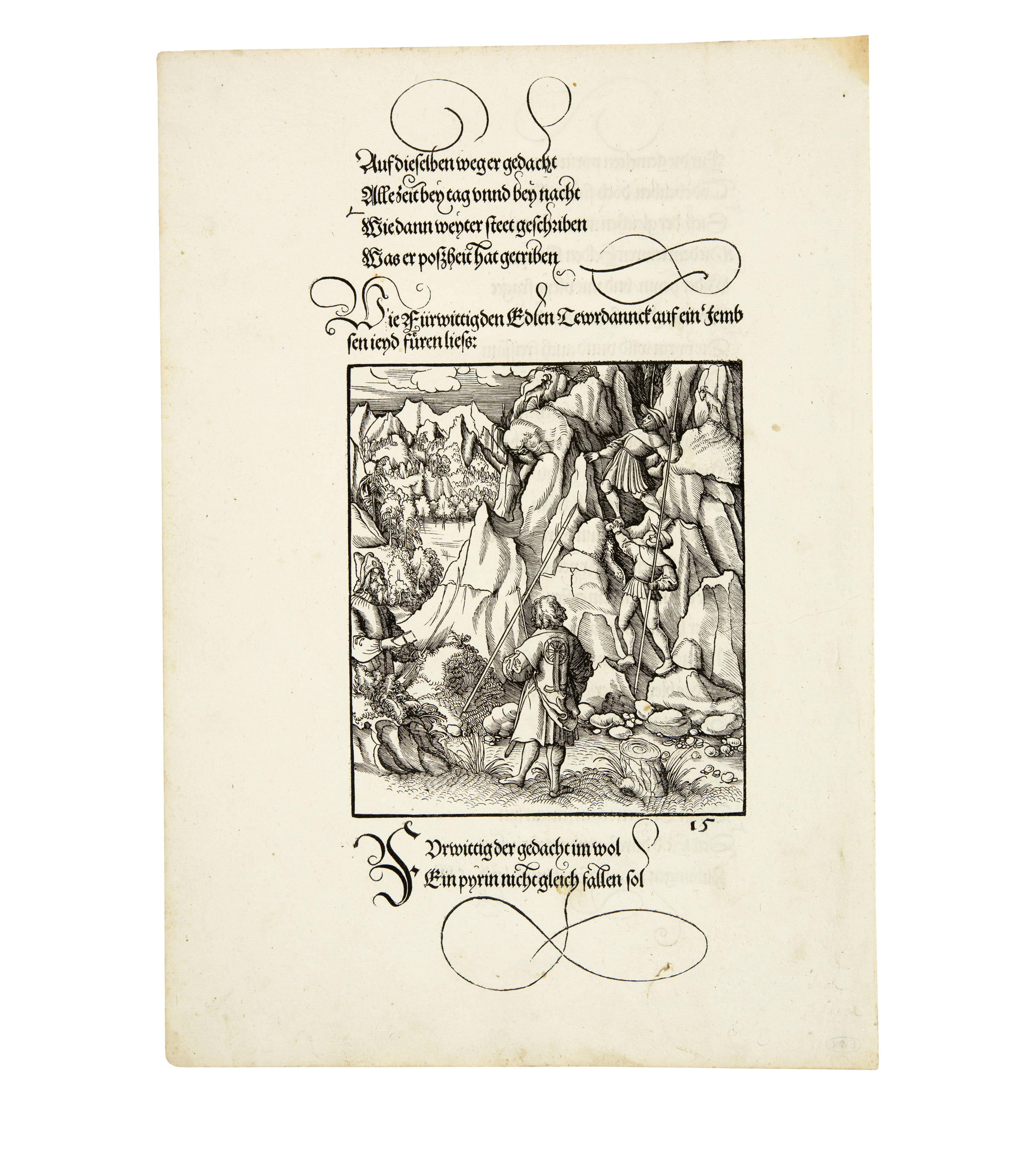 3. Blatt 15. Leonhard Beck. Theuerdank wird auf der Gemsjagd in Gefahr gebracht. Hollstein