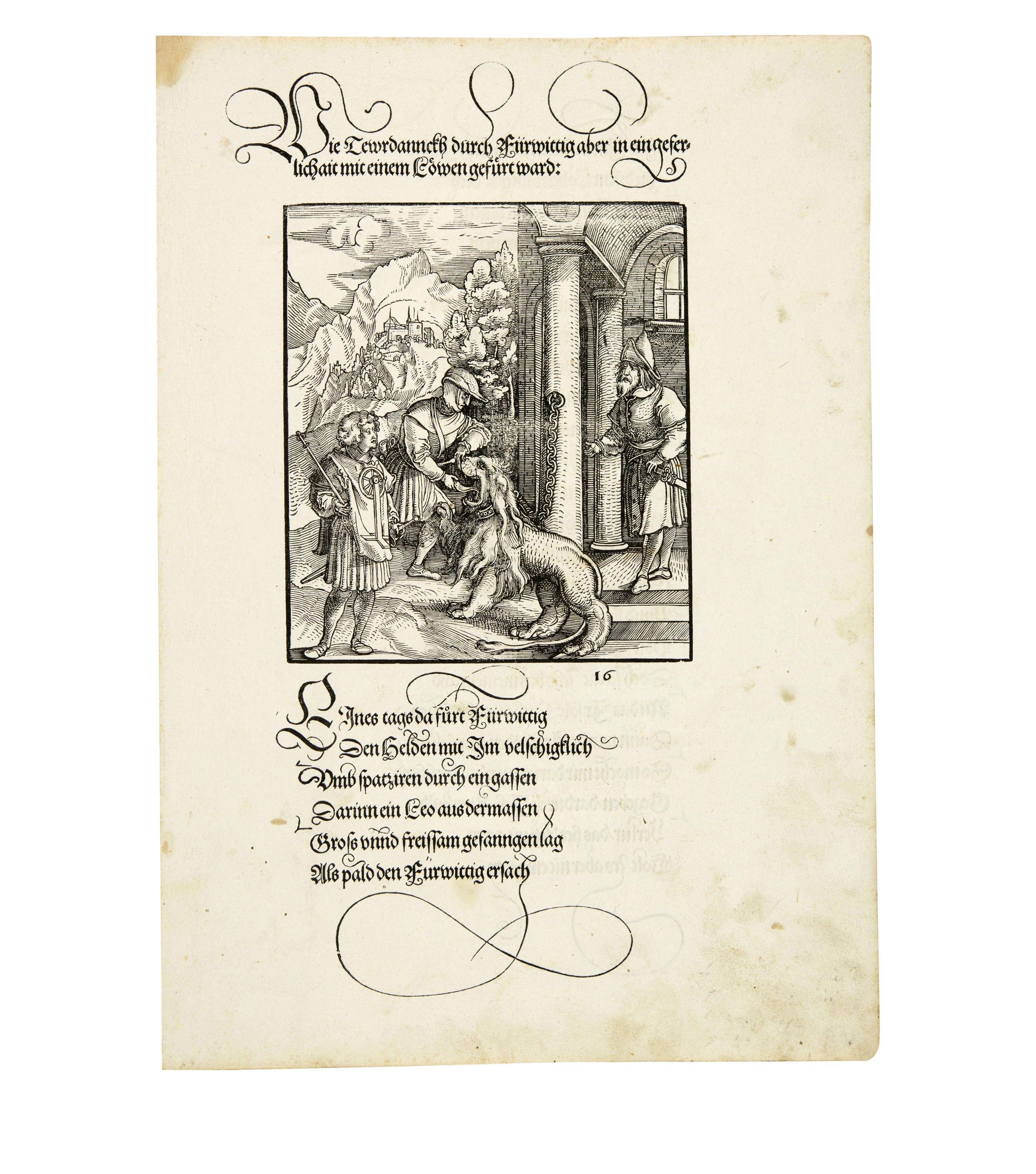 4. Blatt 16. Hans Schäufelein. Theuerdank wird durch Fürwittig veranlasst, einem Löwen in den Schlund zu greifen. Schreyl 825