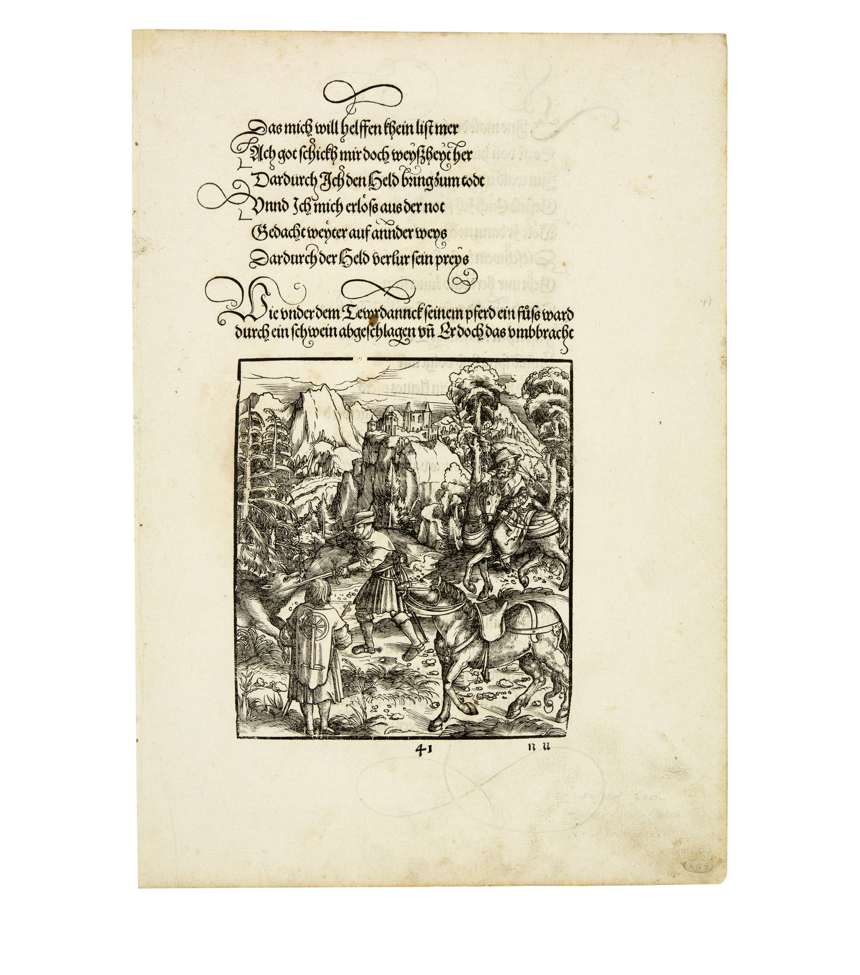 5. sheet 41 Leonhard Beck. Theuerdank kills a wild boar that has wounded his horse. Hollstein no. 306