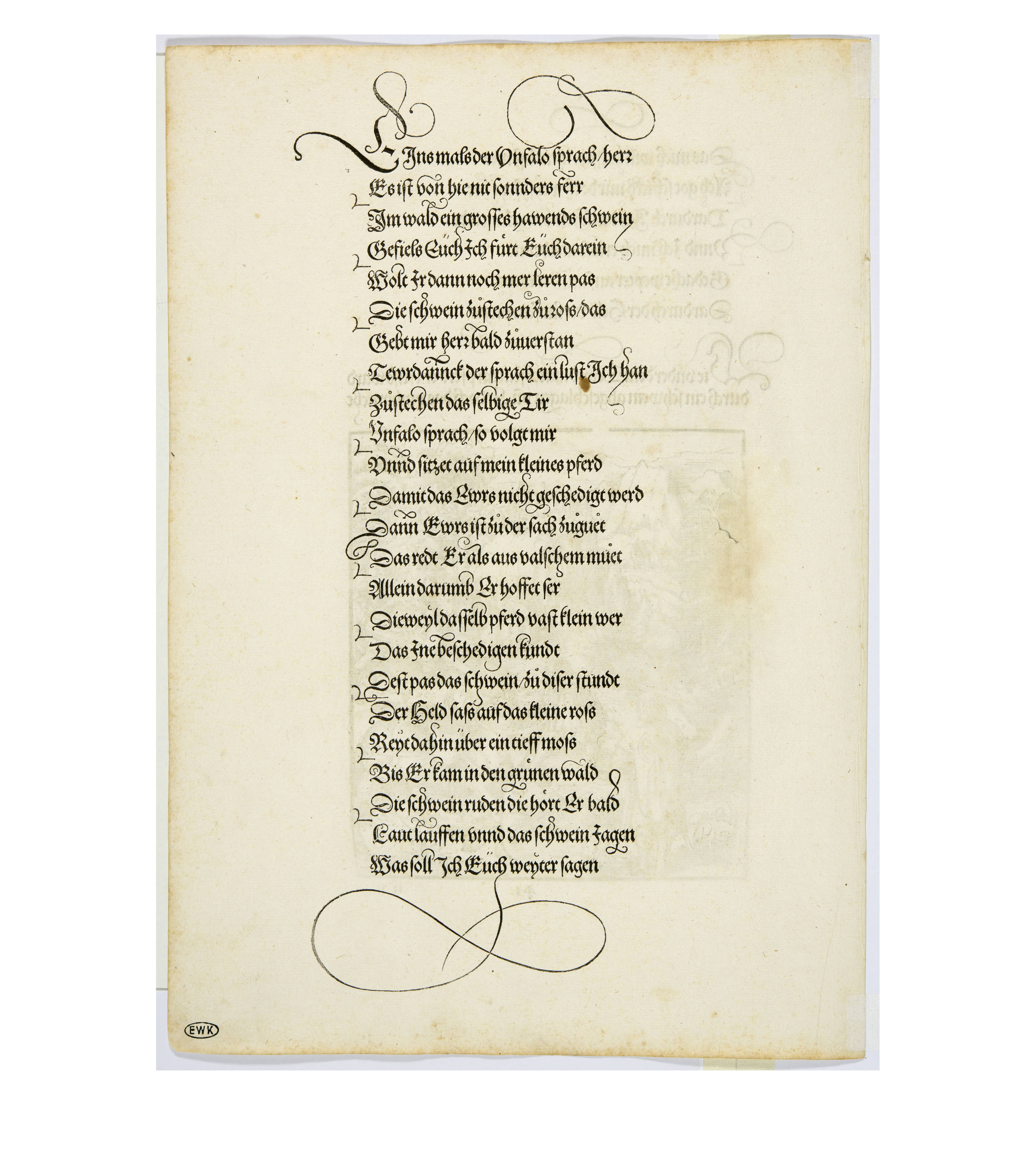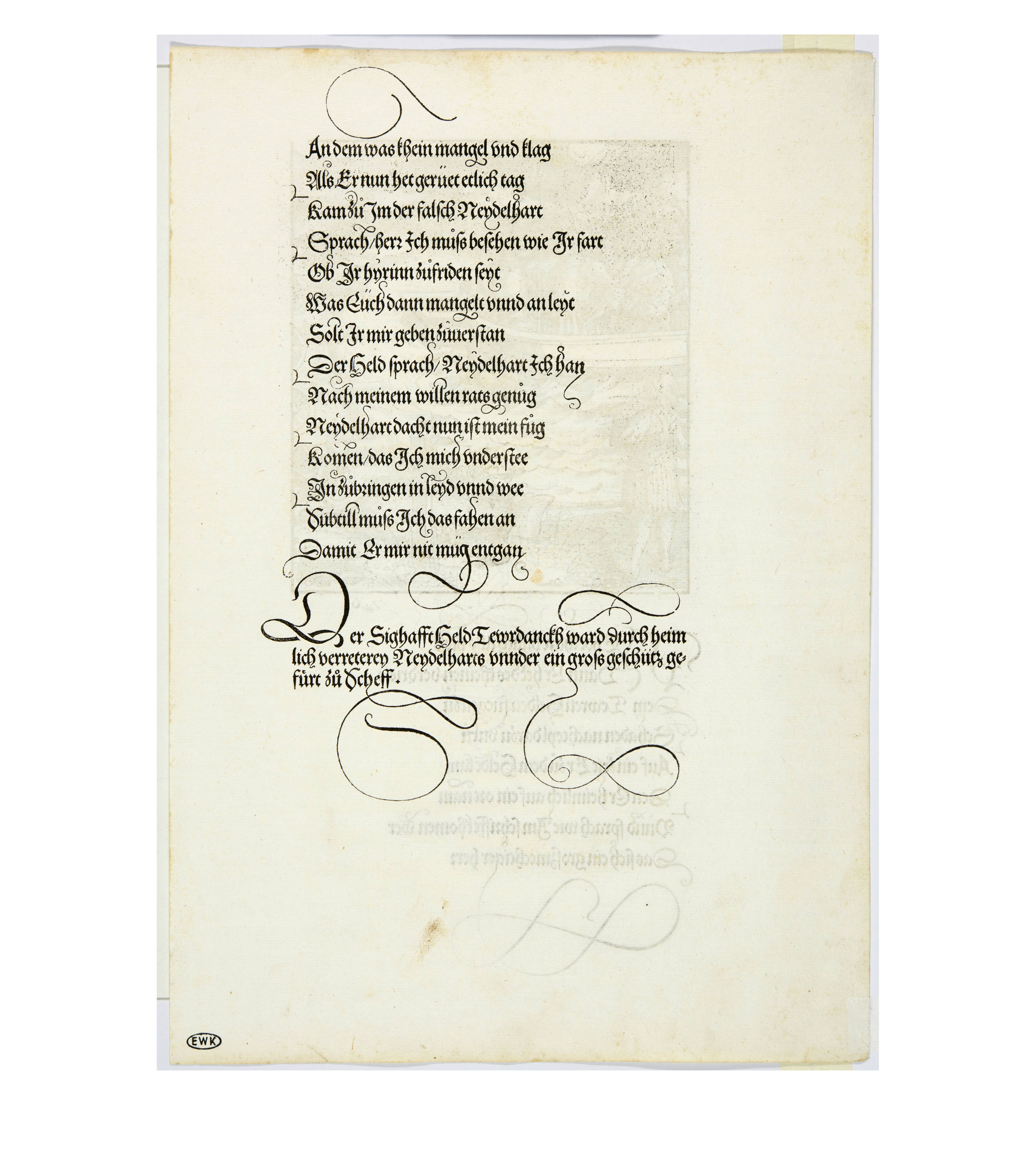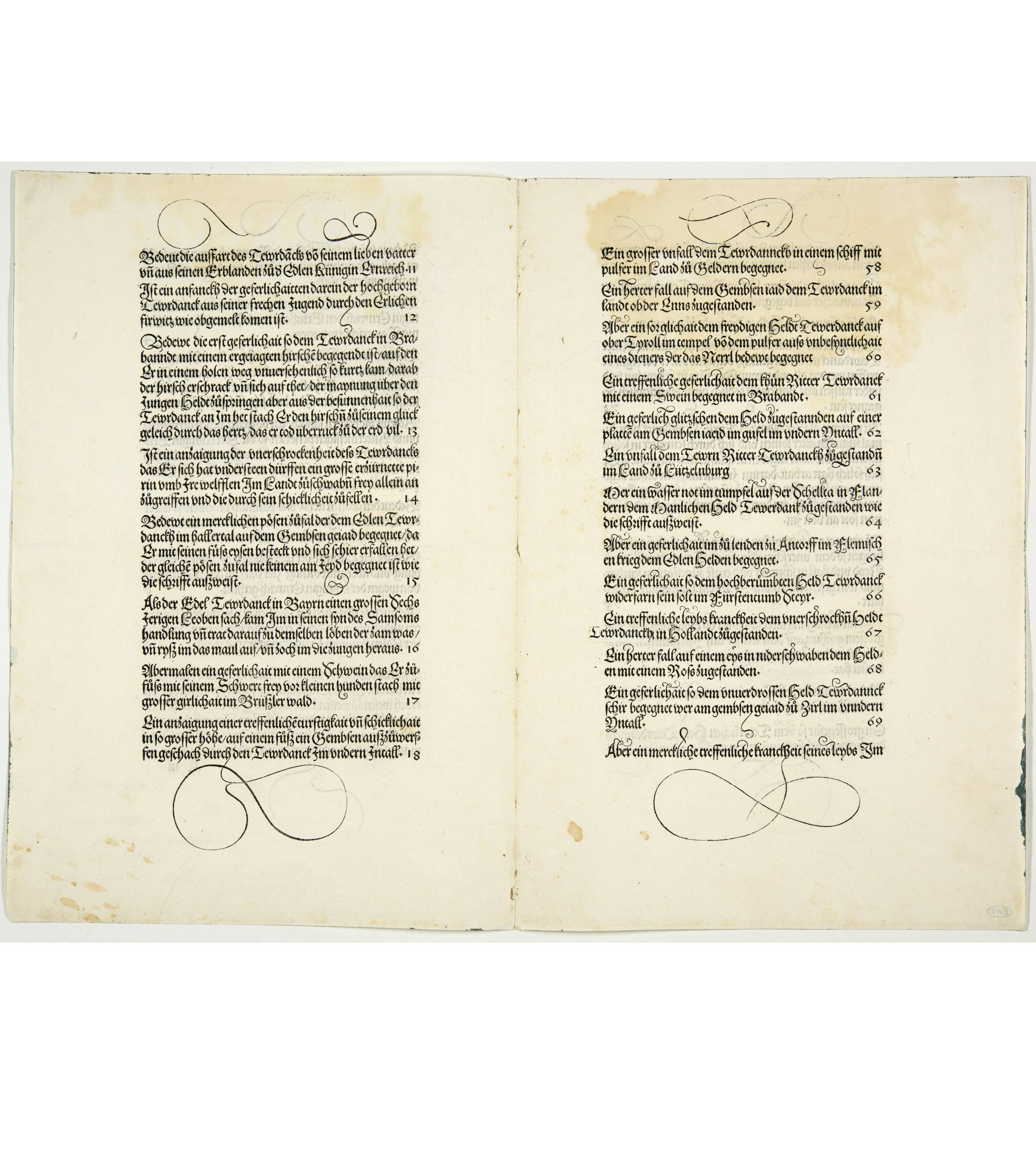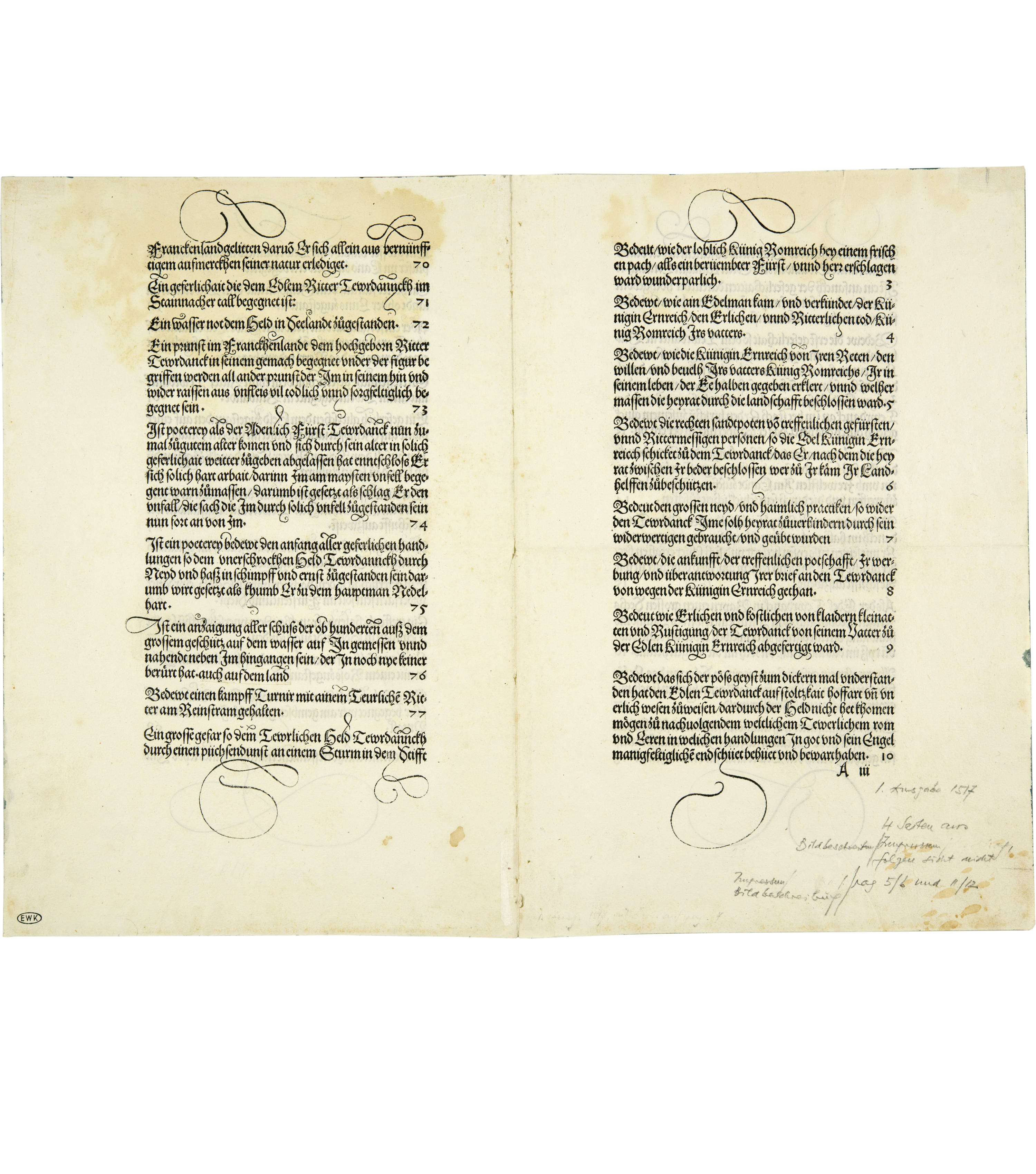 The "Theuerdank" is one of the magnificent works with woodcut sequences with which Emperor Maximilian I wanted to secure his posthumous fame. In 116 verses, it describes the heroic deeds he had to endure on his bridal journey to Ghent to marry Mary of Burgundy in 1477. Planning began in 1505 and the finished text was available in 1512. The first edition was not sold, it was only intended as a gift.