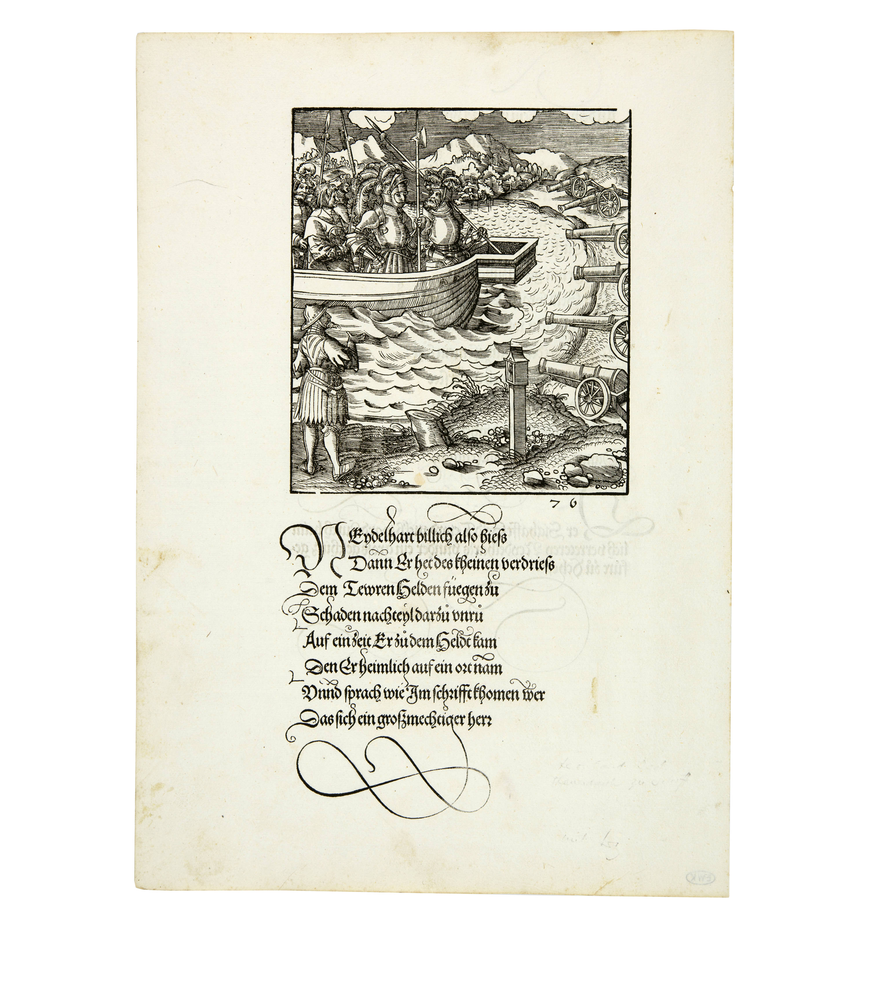6. sheet 76, Leonhard Beck. During a night-time sea crossing, Theuerdank's ship runs directly into the enemy guns. Hollstein no. 326/II