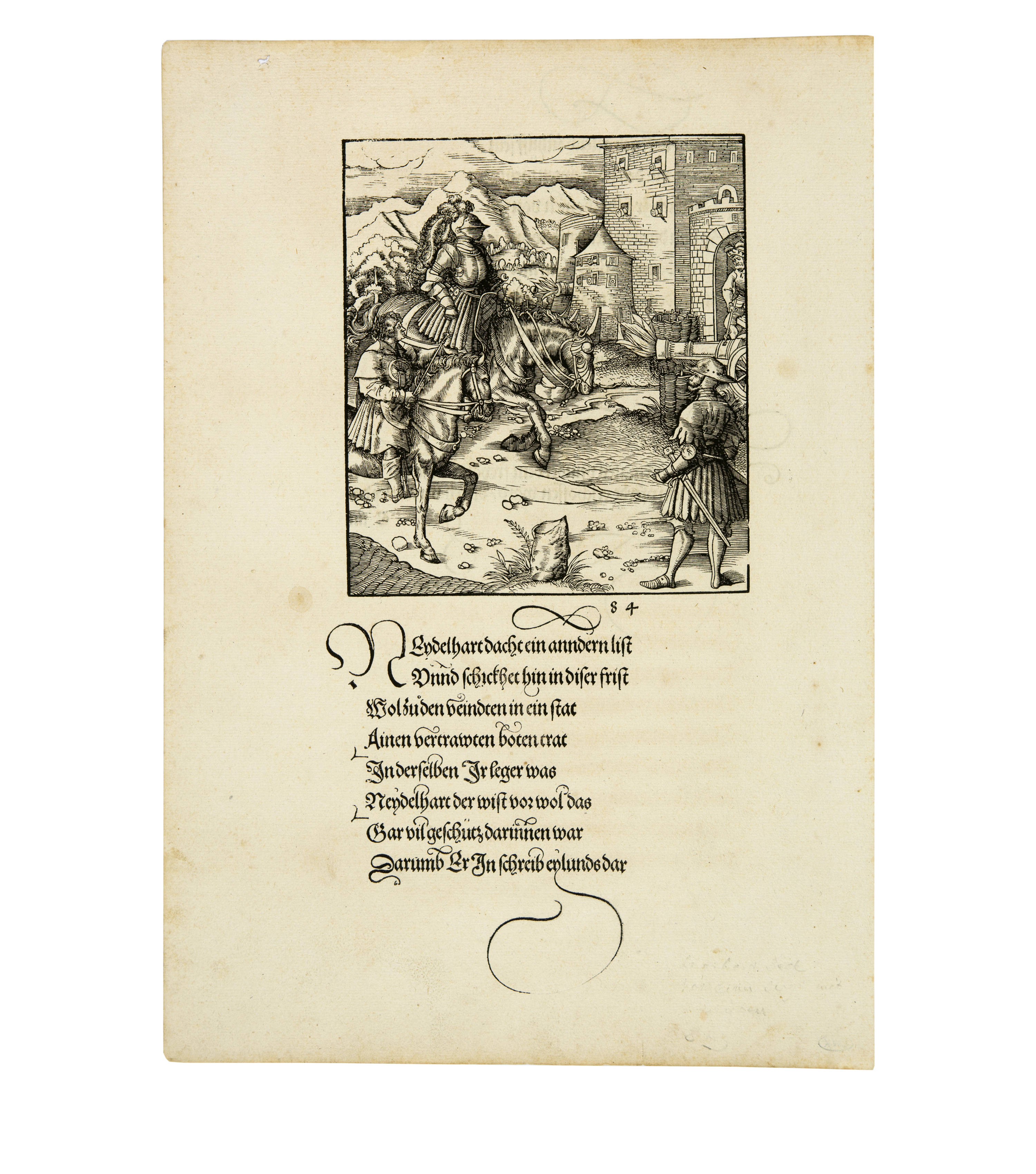 7. sheet 84, Leonhard Beck. With his visor closed and in armour, Theuerdank rides towards a town, where he is met by gunfire. Hollstein no. 333