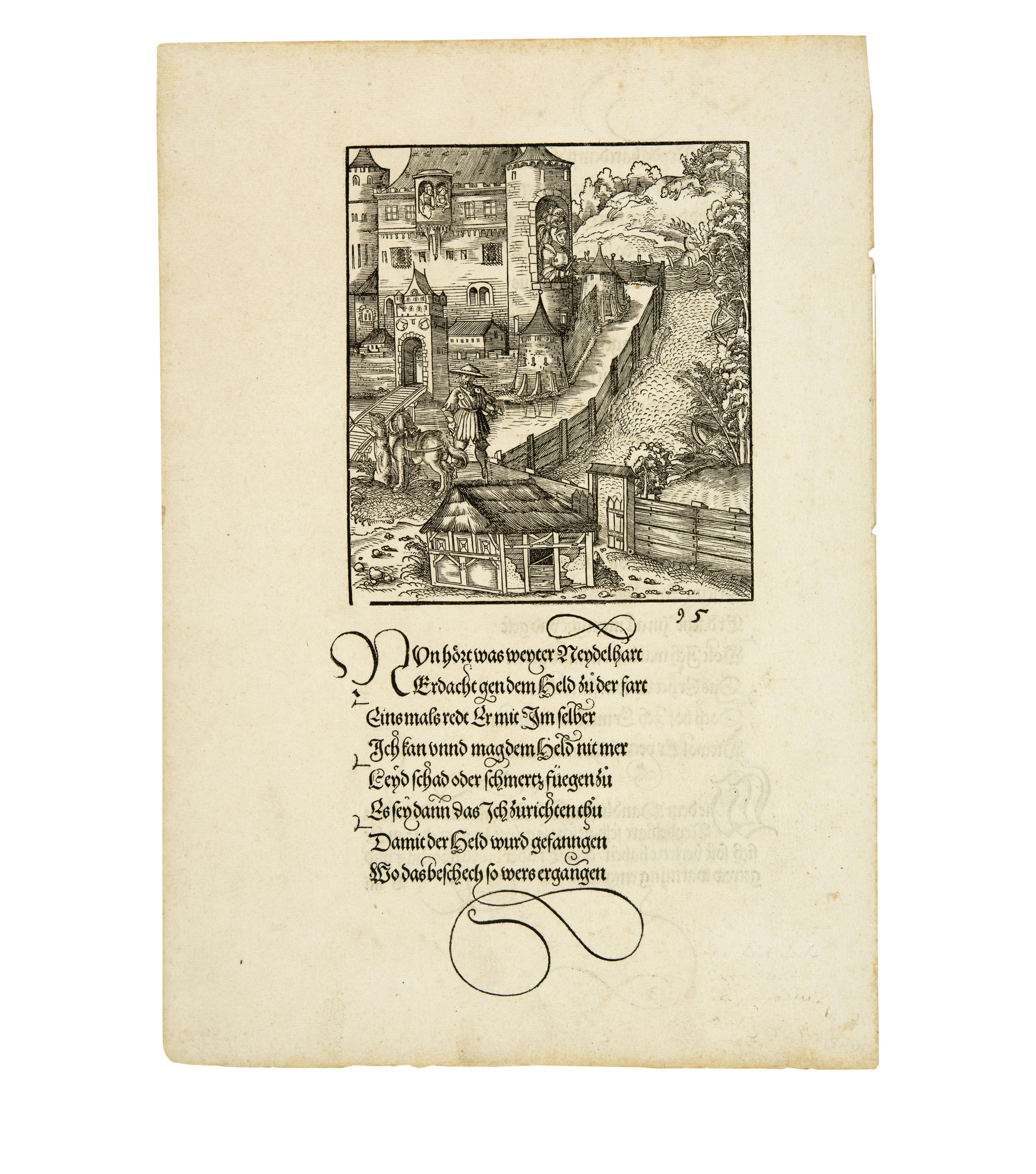 8. Blatt 95. Leonhard Beck. Theuerdank am grossen Fenster eines Turms in einer befestigten Stadt, in die ihn Neydelhart hinein gelockt hat. Hollstein