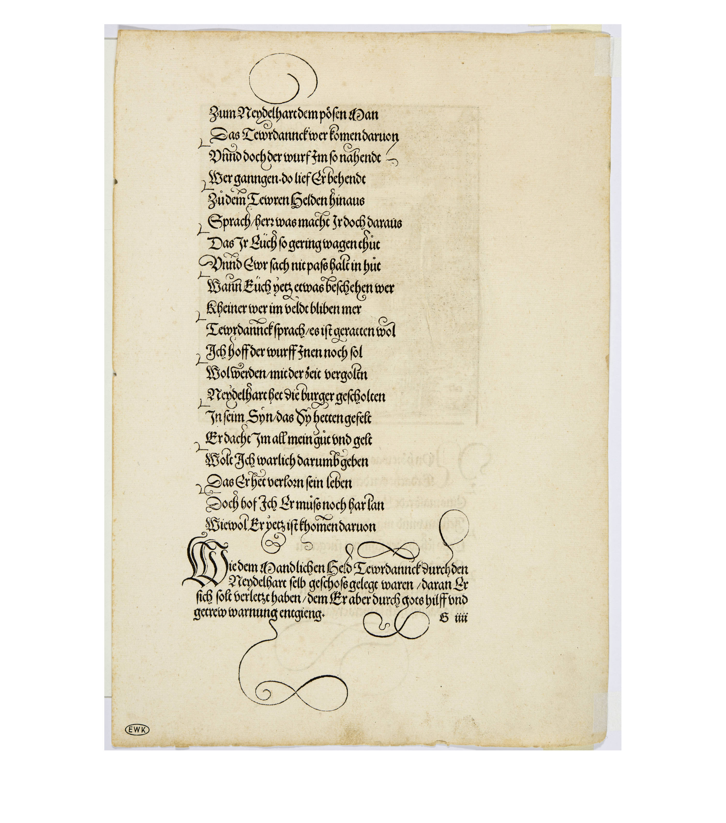 Der "Theuerdank" gehört zu den Prachtwerken mit Holzschnittfolgen, mit denen Kaiser Maximilian I. seinen Nachruhm sicherstellen wollte. In 116 Versen werden die Heldentaten geschildert, die er auf der Brautreise zu Maria von Burgund im Jahre 1477 nach Gent zu bestehen hatte. Die Planung begann 1505, der fertige Text lag 1512 vor. Die erste Ausgabe kam nicht in den Handel, sie war lediglich für Geschenkzwecke gedacht.