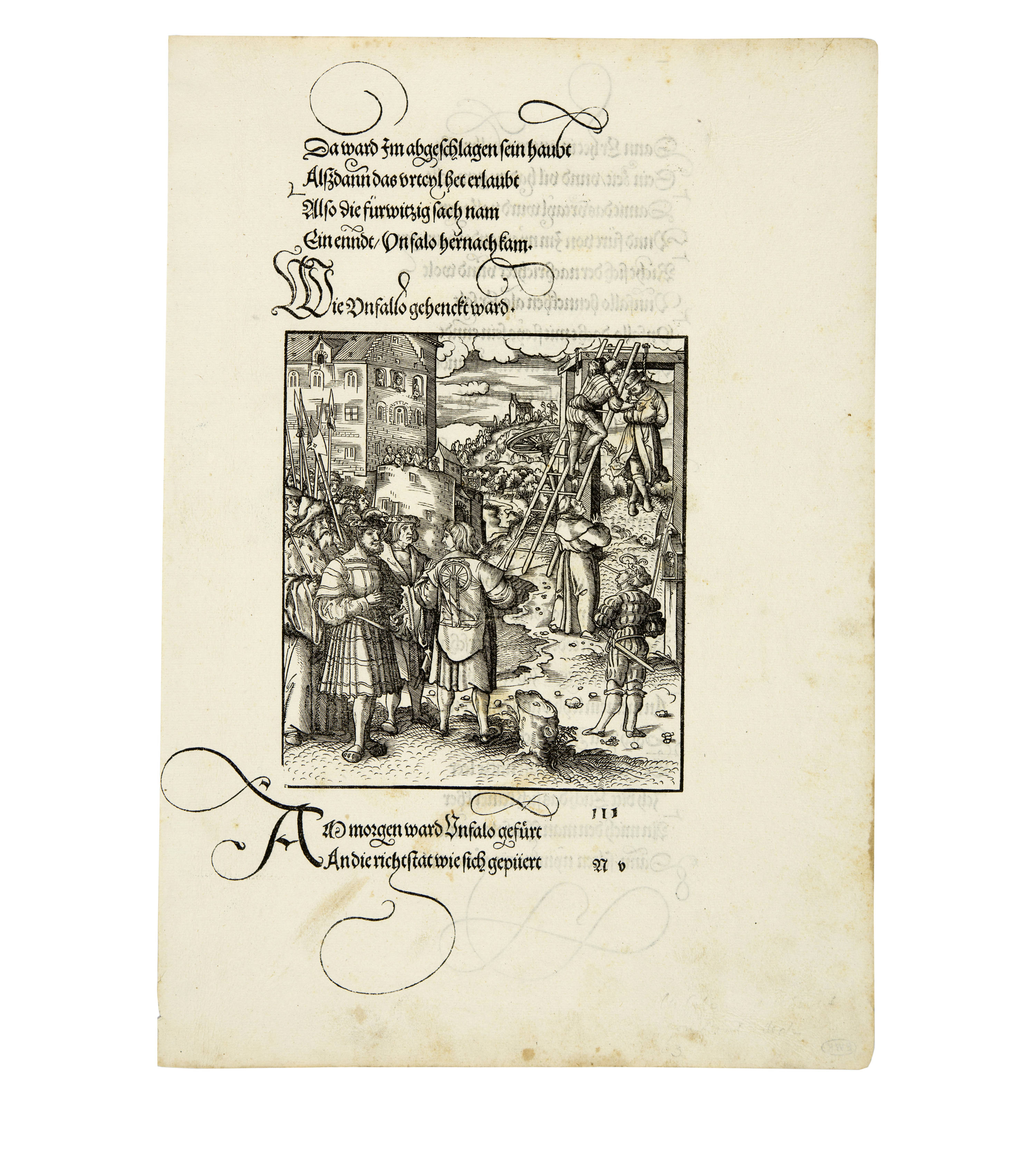 10. sheet 111 Leonhard Beck. Unfalo is hanged outside the city walls. Hollstein no. 356