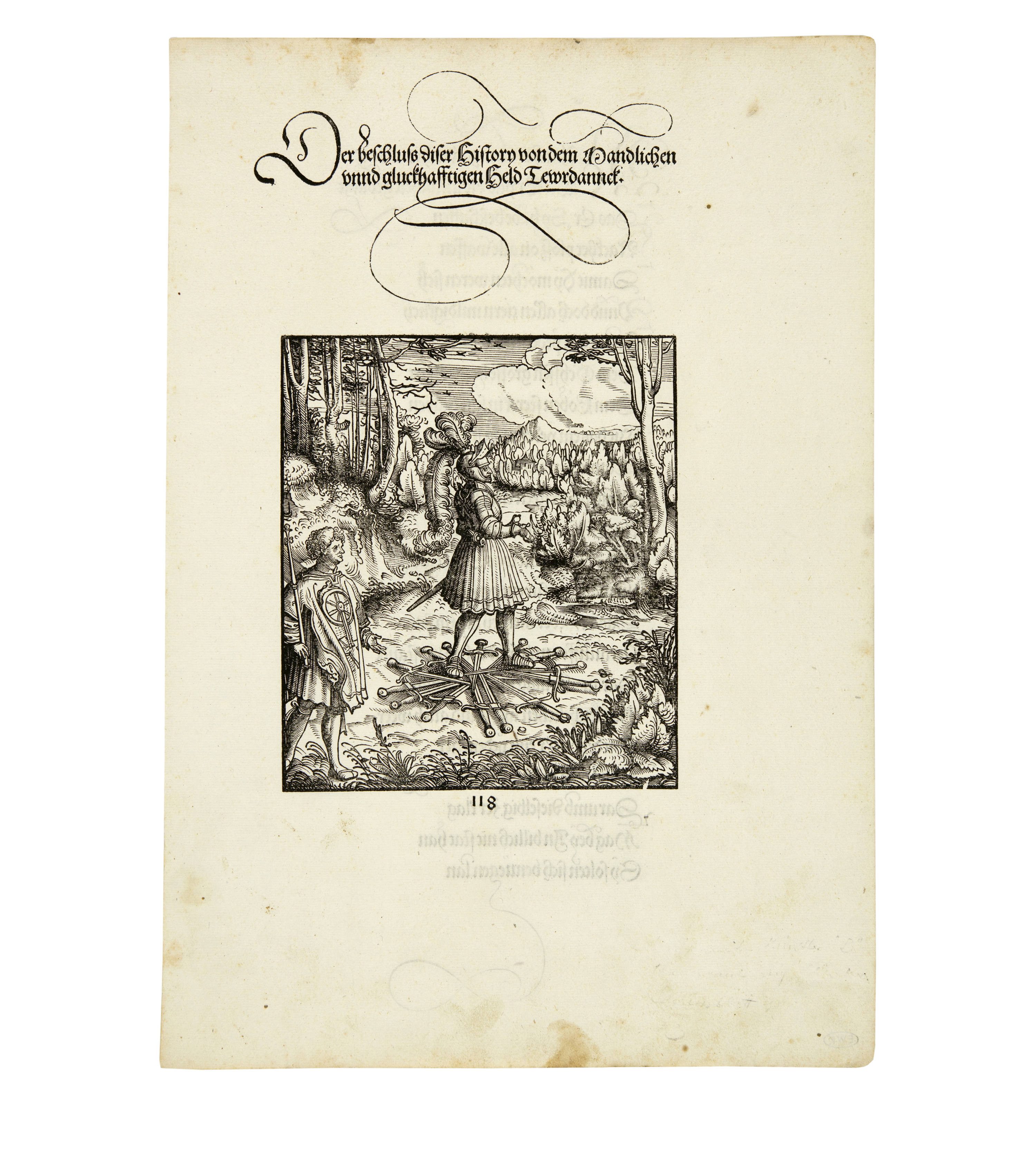 12. sheet 118 Hans Burgkmair. Theuerdank stands on 14 swords, which are brought together to form a wheel, as the conqueror of Fortuna's wheel of fortune. Hollstein no. 428