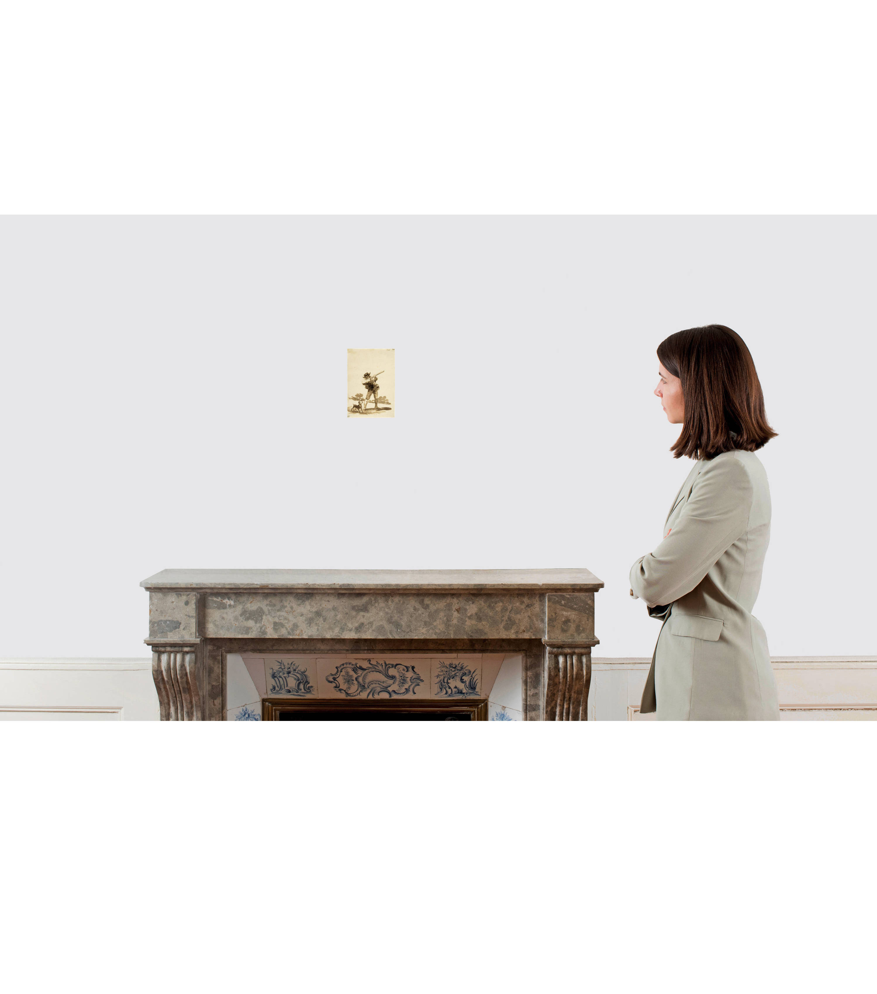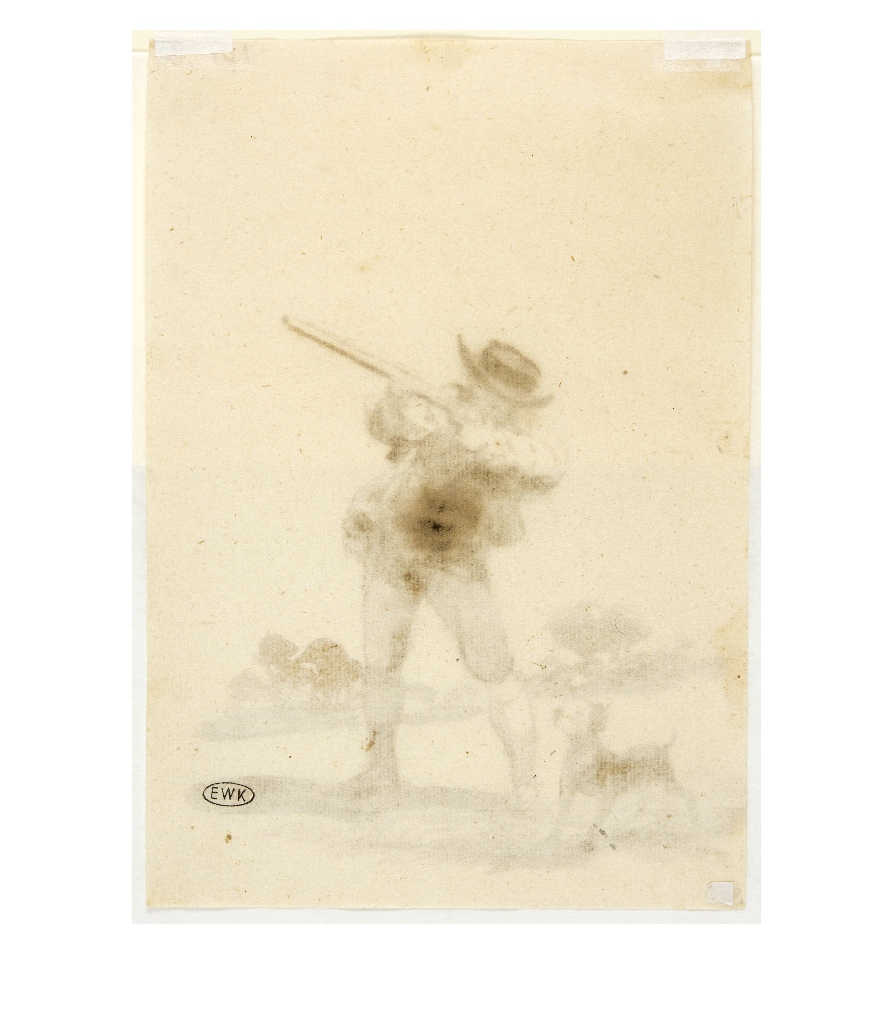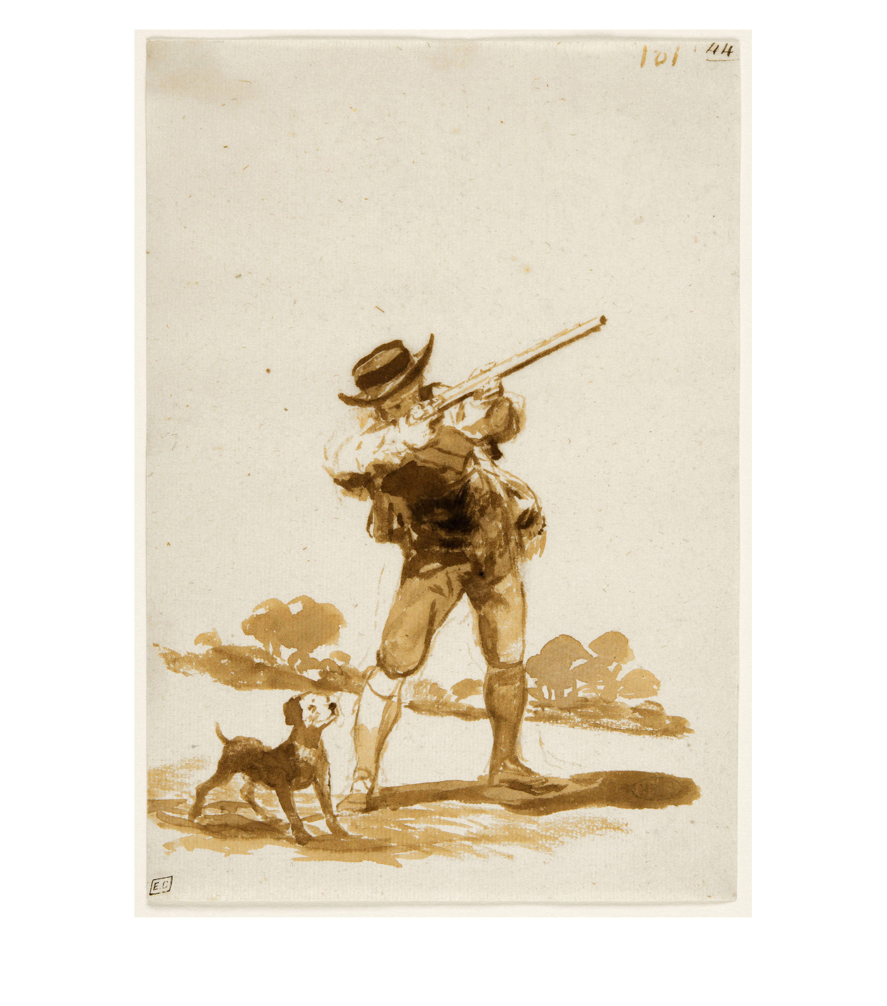 Album F ends with a group of eleven hunting scenes. Goya himself was a passionate hunter in his youth. The experience he gained during this period is reflected in these drawings. Drawing no. 101 in the album accurately depicts the pose of a hunter with a cocked rifle, presumably aiming at birds, accompanied by his dog, which is attentively following the action. The trees suggest the landscape setting. Goya has succeeded in capturing the moment of concentration between the dog and the hunter. Their target is outside the picture. The effects of light and shadow and the trees in the background, blurred in the diffuse light, are almost impressionistic.