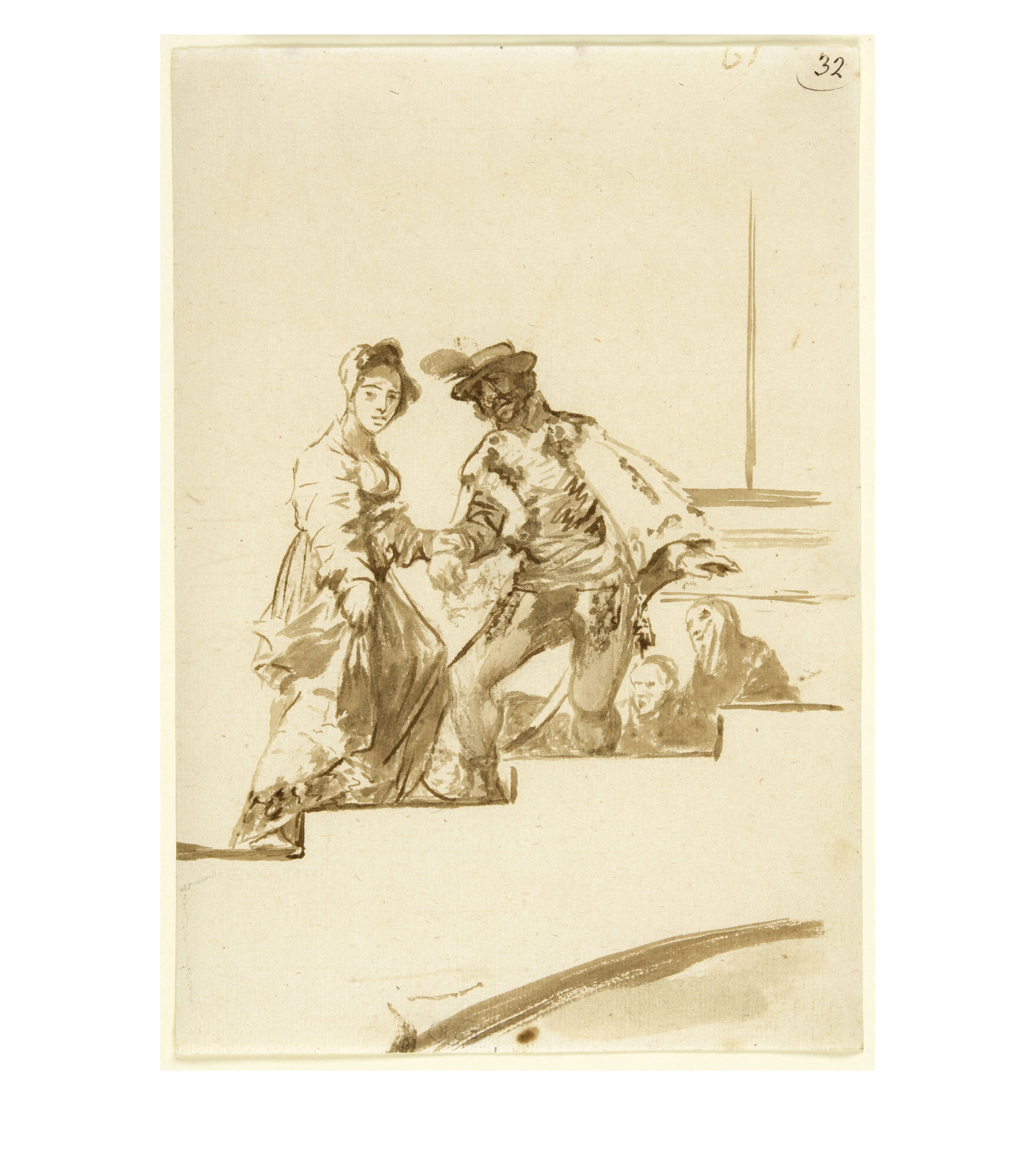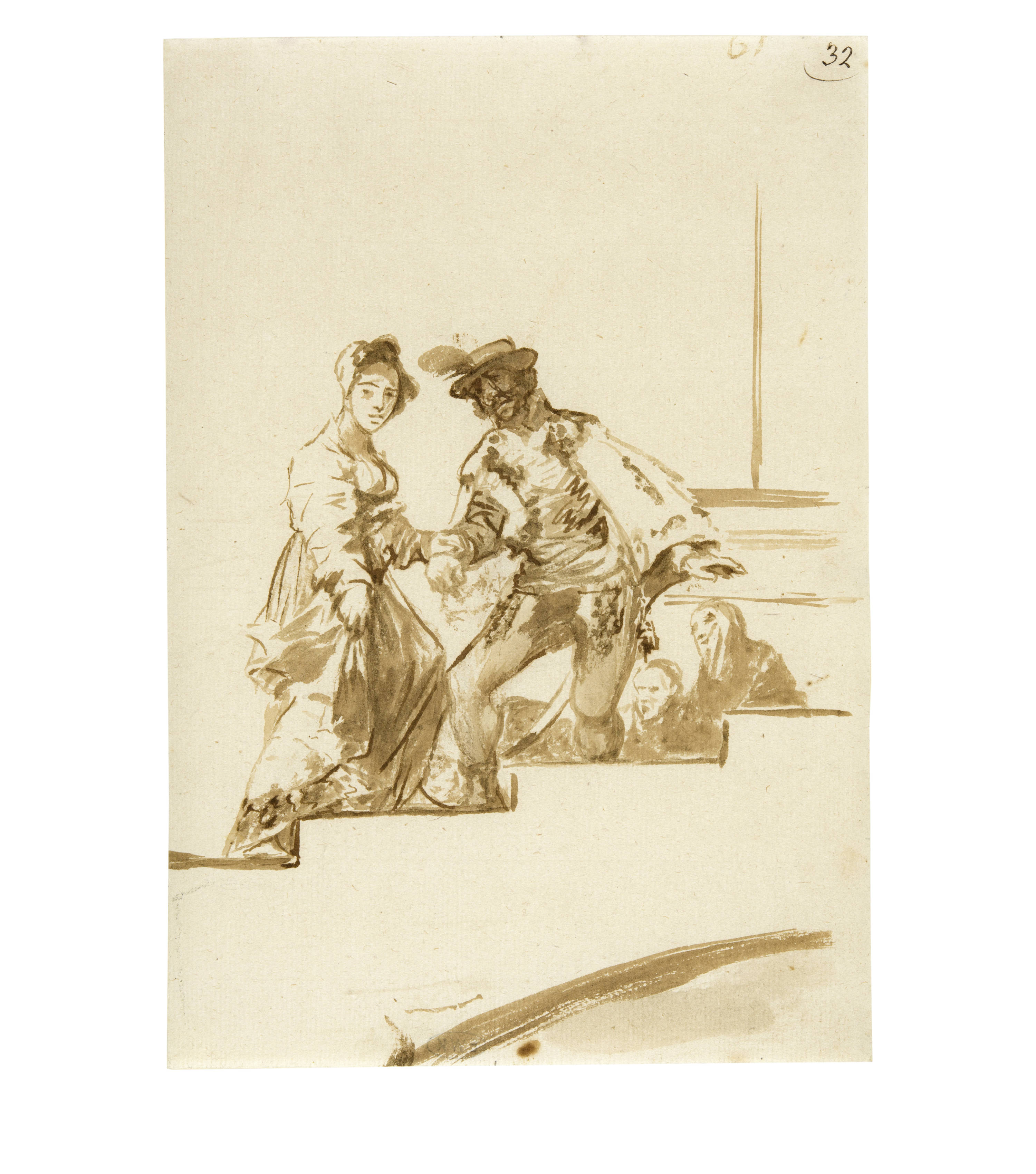 Drawing no. 61 of album F shows a gentleman helping a lady up the stairs. The horizontal and vertical lines of the steps and the background, which cannot be precisely named, contrast with the implied arch at the bottom of the page. On the staircase, which spans the room like a bridge, a young lady strides up the steps. The staircase has no banisters, so that the lady must be supported by an elderly nobleman in old-fashioned clothing. The precariousness of the situation is expressed in the sometimes shimmering style of the drawing, for example in the dabbed spots on the clothes. Goya demonstrates his mastery of the medium by skilfully incorporating the white of the paper into his composition.