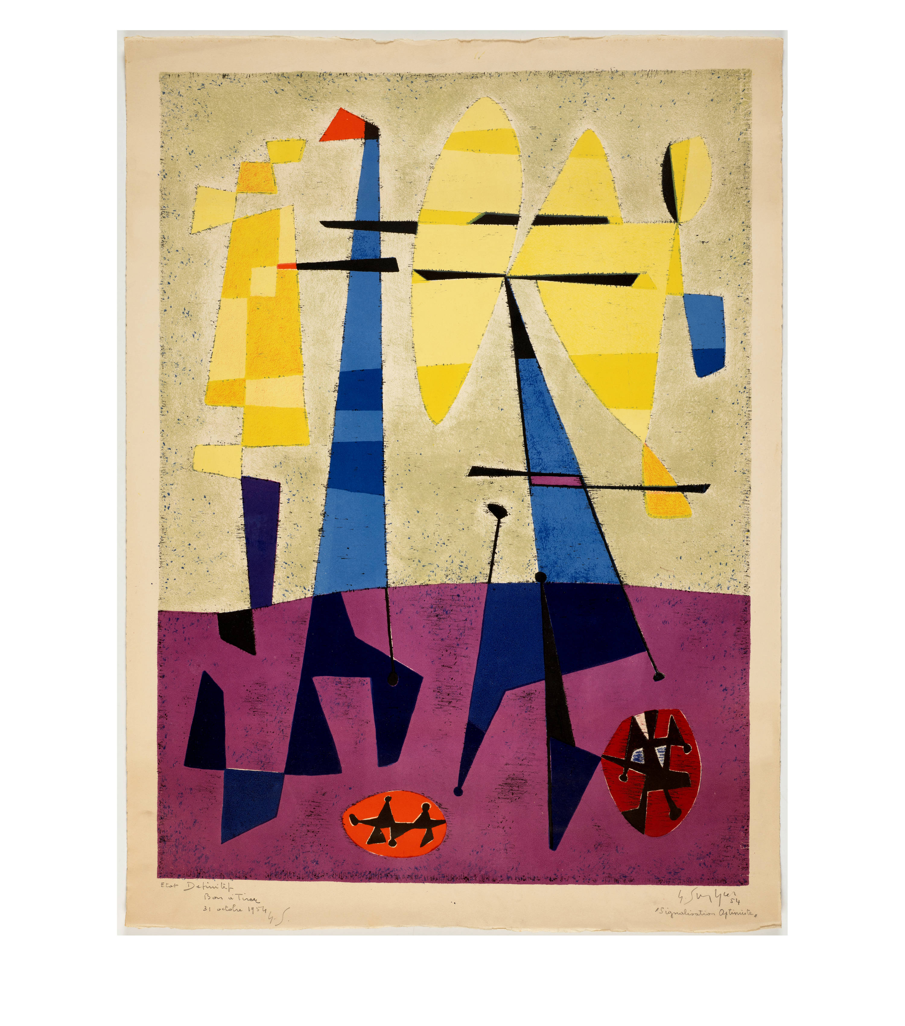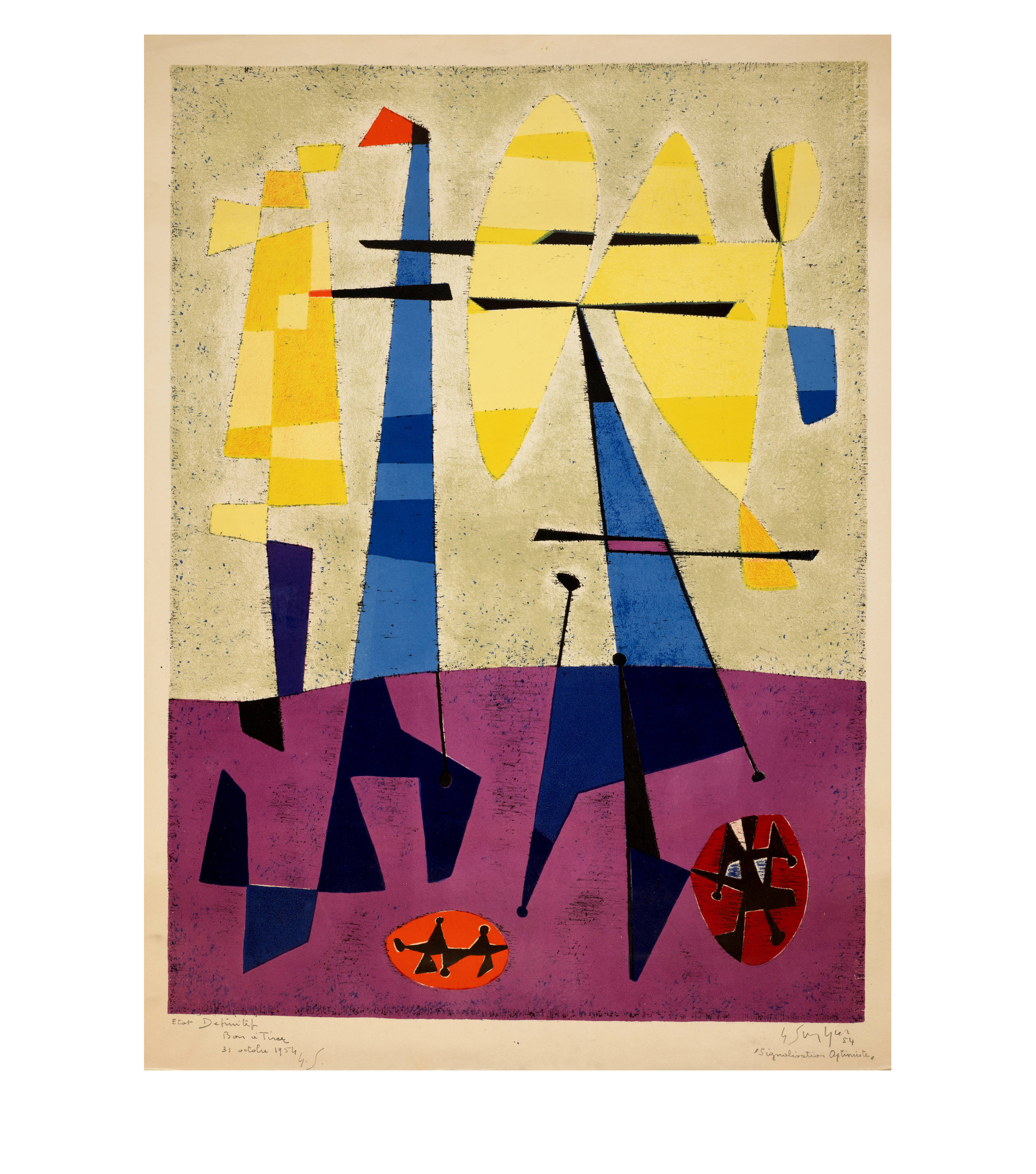 Unten rechts vom Künstler in Bleistift signiert, datiert und betitelt "G. Singier / 54 / Signalisation Optimiste", links bezeichnet "Etat Definitif / Bon à Tirer / 31 octobre 1954 / G.S."