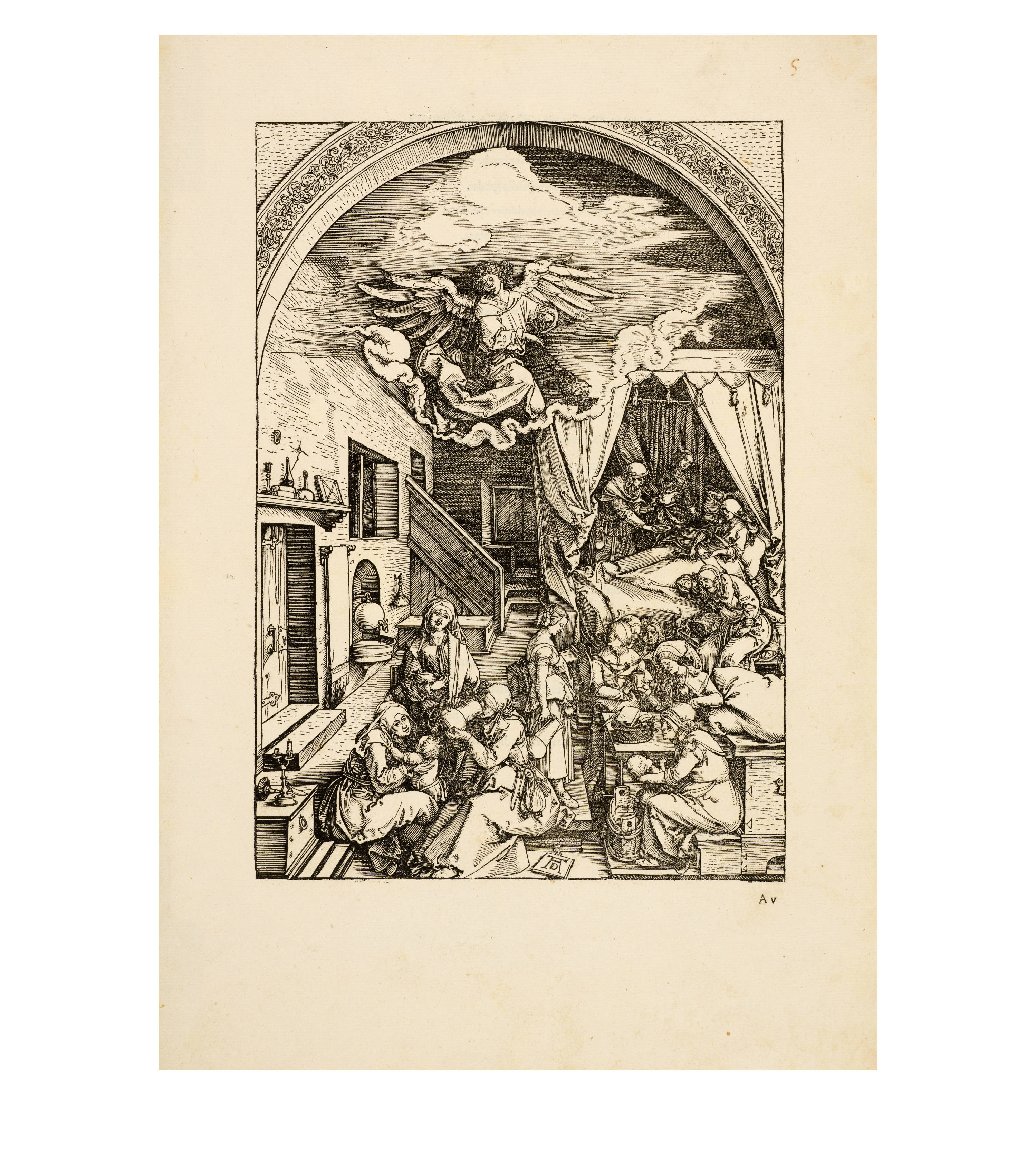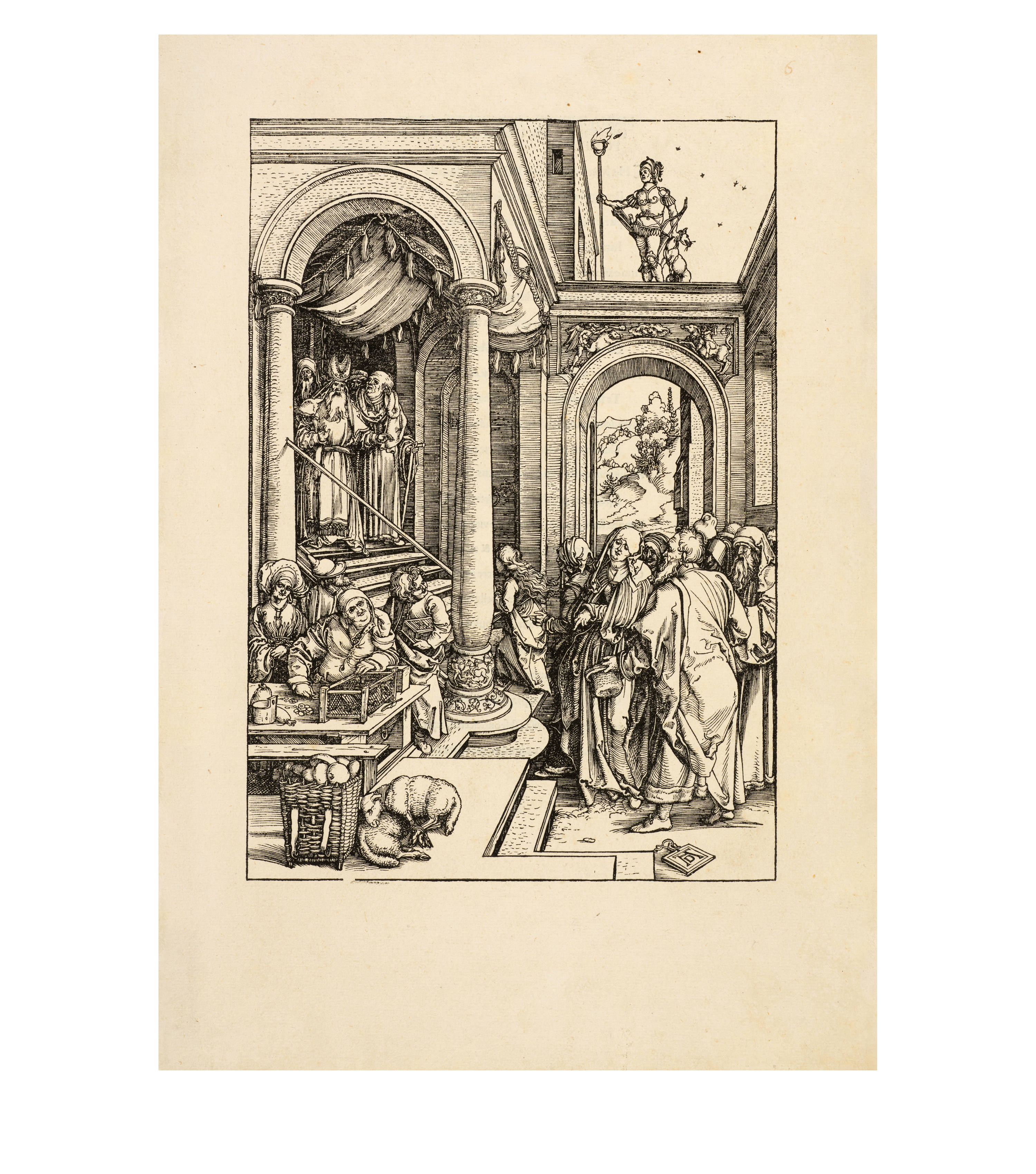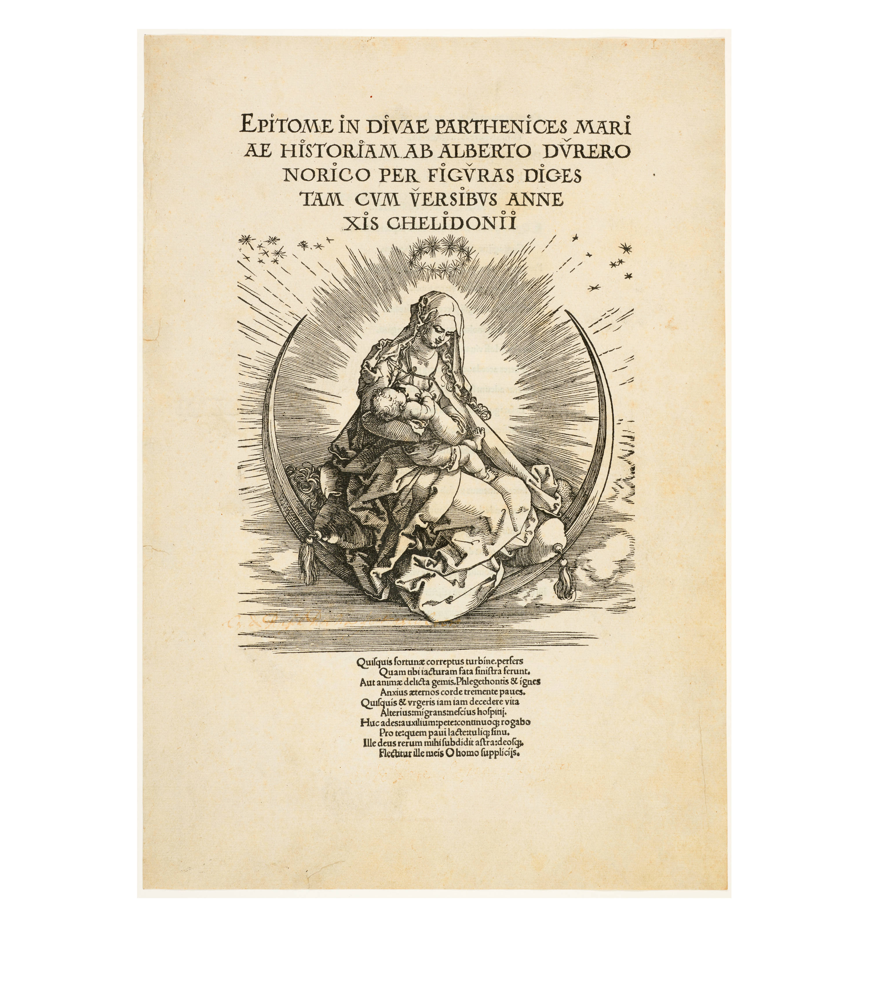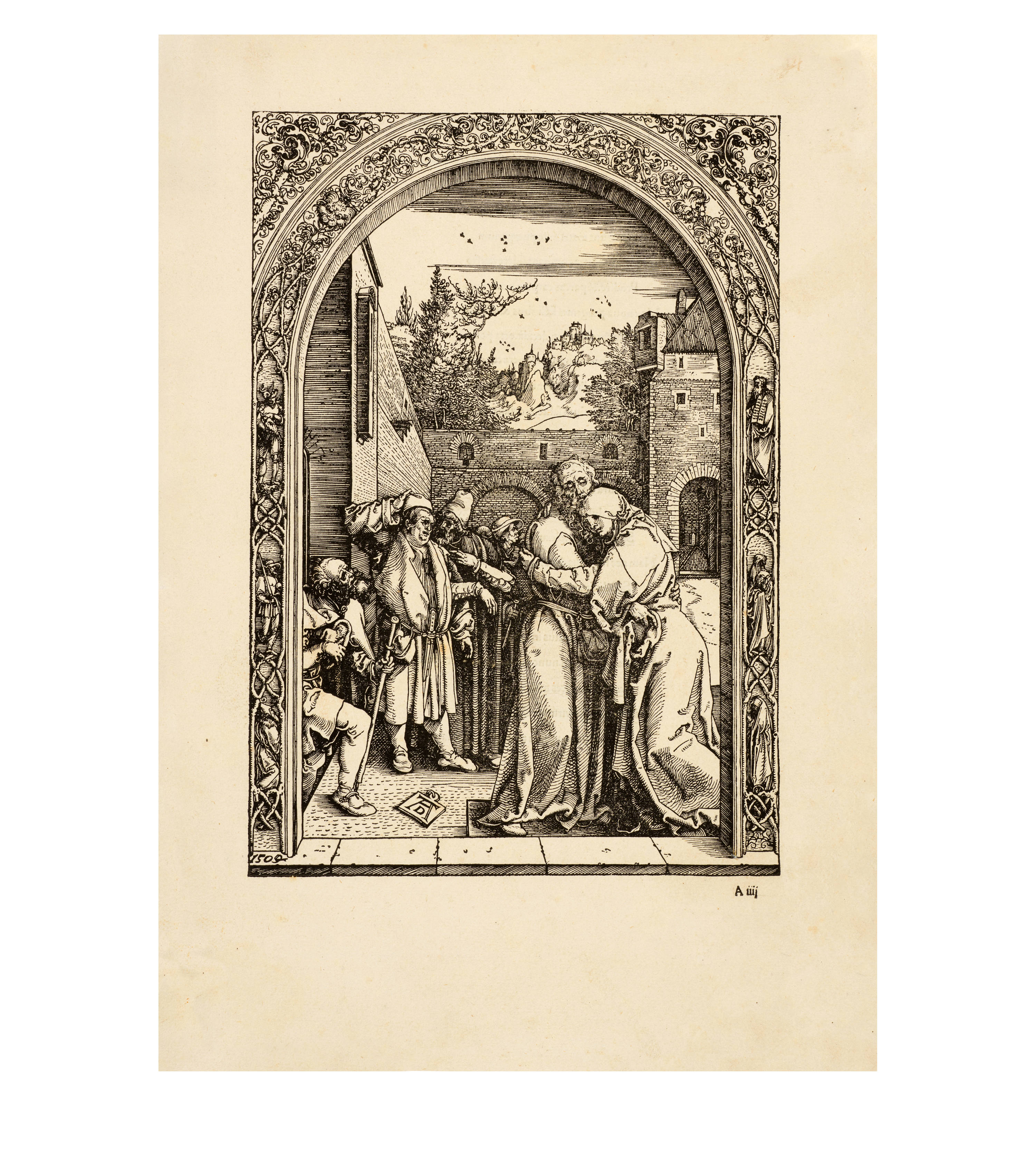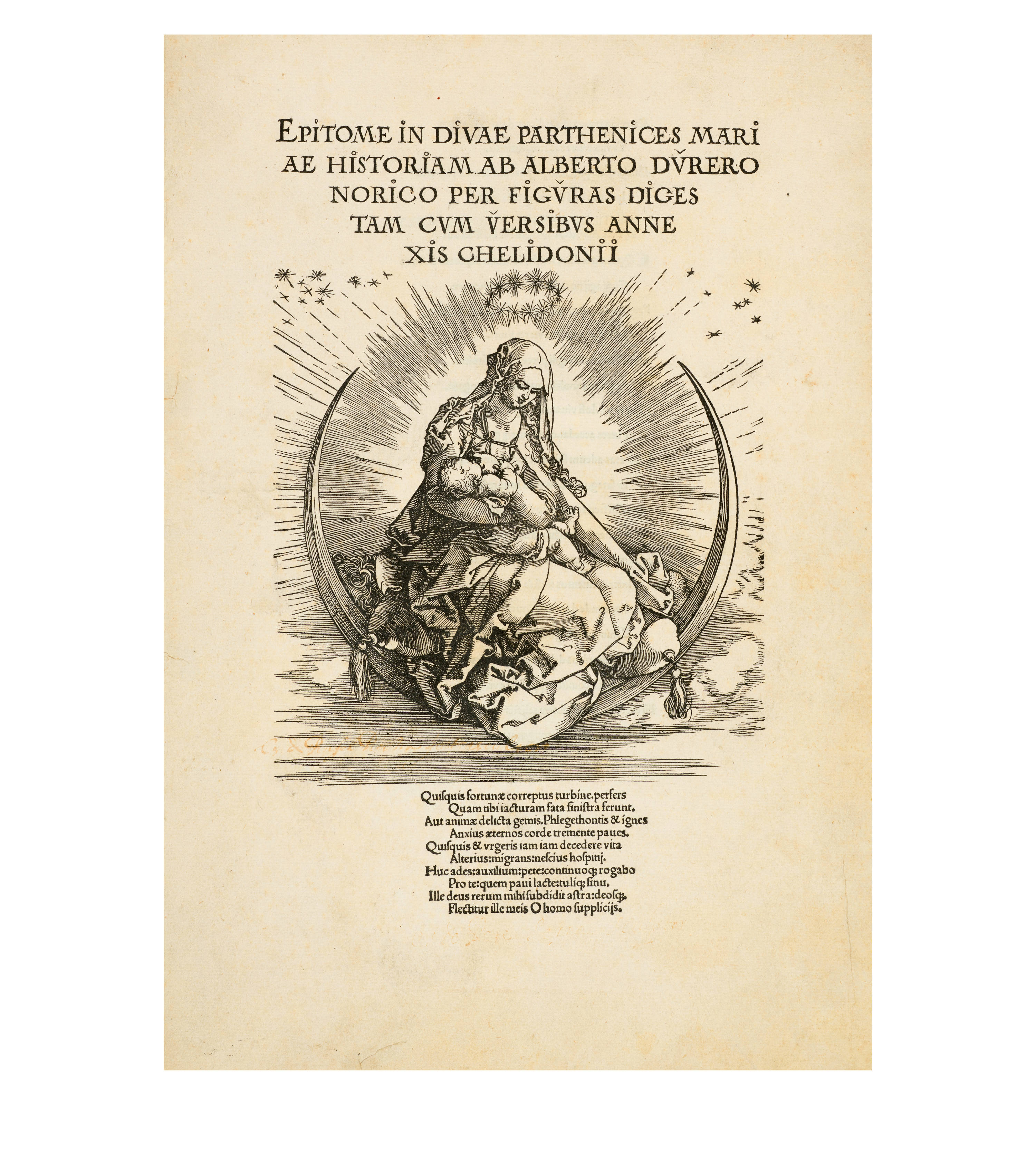 Dürer accompanied his sheets with Latin verses by Benedikt Schwalbe, a learned monk at the Benedictine monastery of St. Egidien in Nuremberg, which after 1500 was a center of humanism. In keeping with the custom of the time, he Latinized his name to "Benedictus Chelidonius" In the book version, the texts are placed opposite the respective images, so that on the reverse of the woodcuts are the descriptions of the following image. Since the life of Mary is only mentioned incidentally in the Bible, Dürer and Chelidonius turned to other sources for image and text. In particular, the apocryphal "Protoevangelium des Jakobus" attributed to the disciple James, and the "Legenda aurea" by Jacobus de Voragine should be mentioned. The latter further embellished the account of Mary's life in the Protoevangelium and placed it at the beginning of his book, before moving on to the lives and martyrdoms of numerous saints. "Das Marienleben" has long been considered the most mature creation among Dürer's woodcut series.