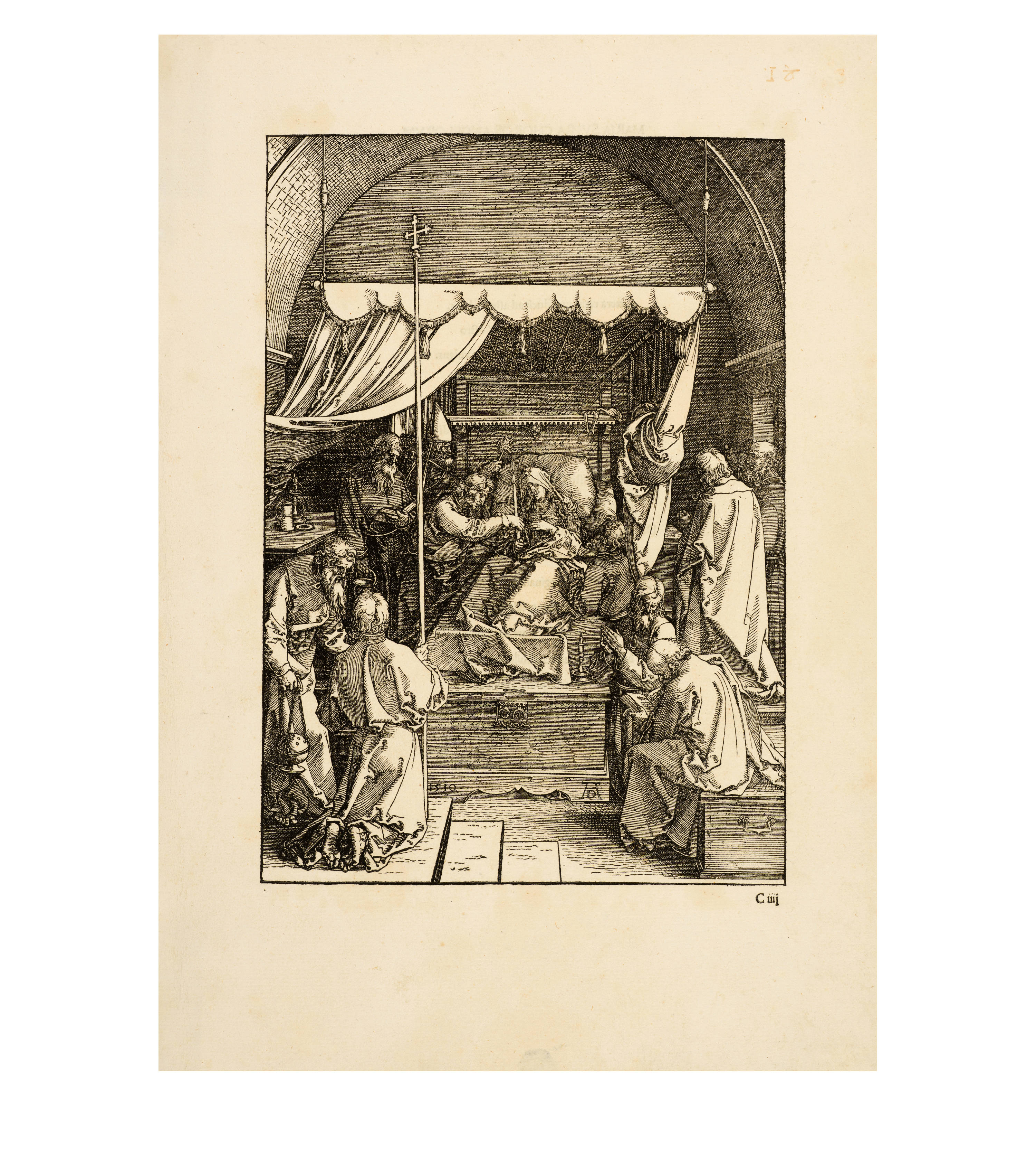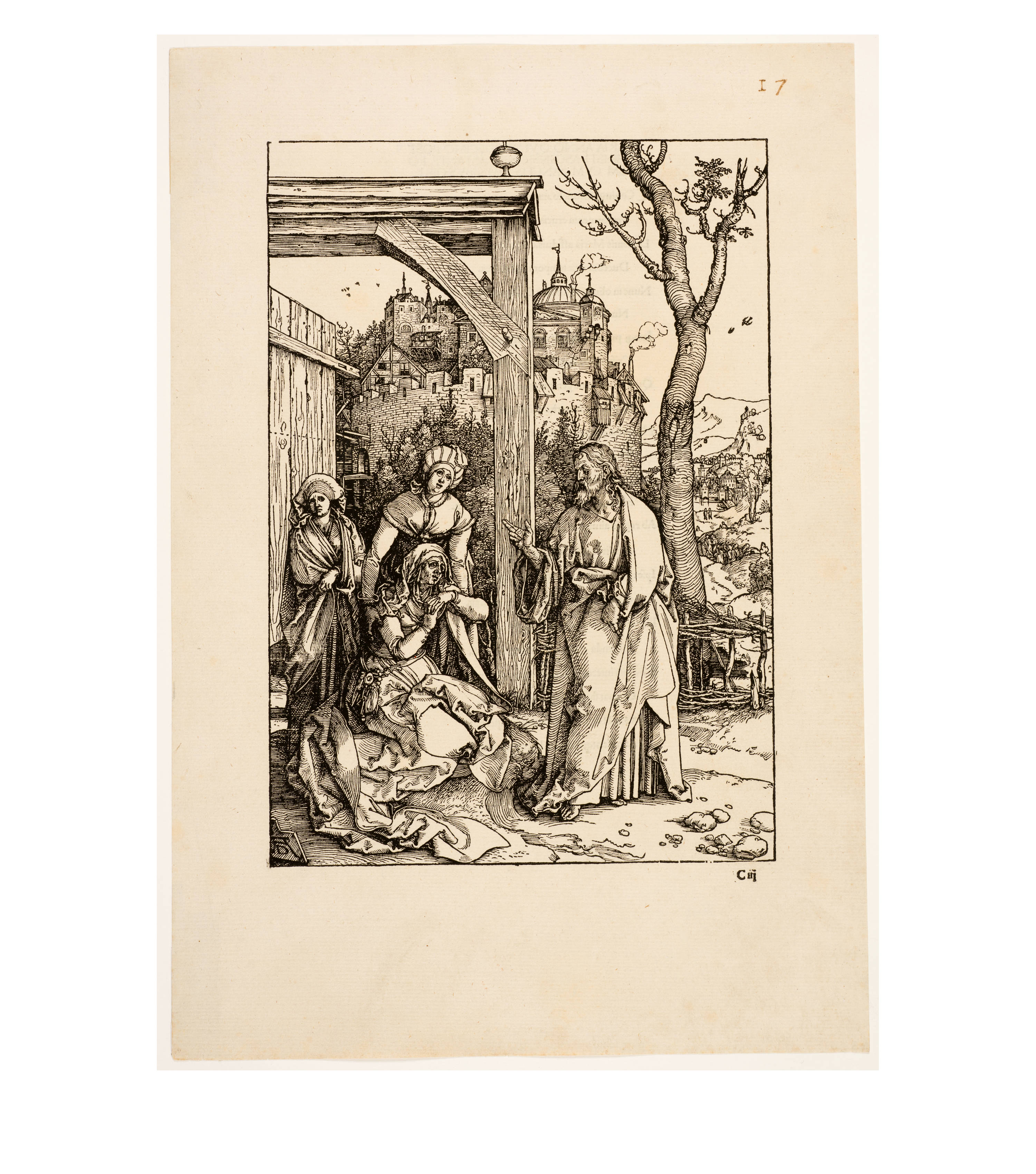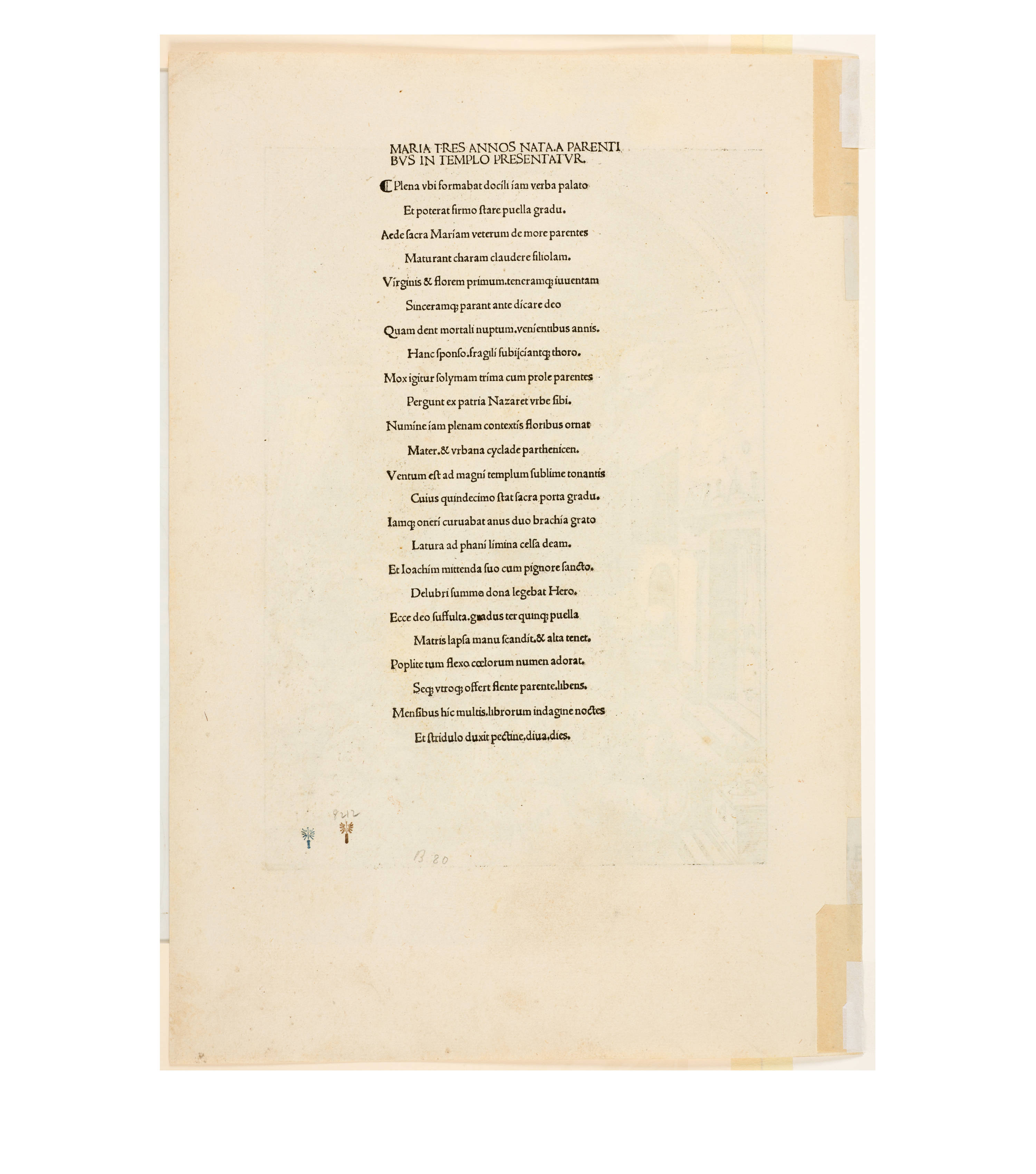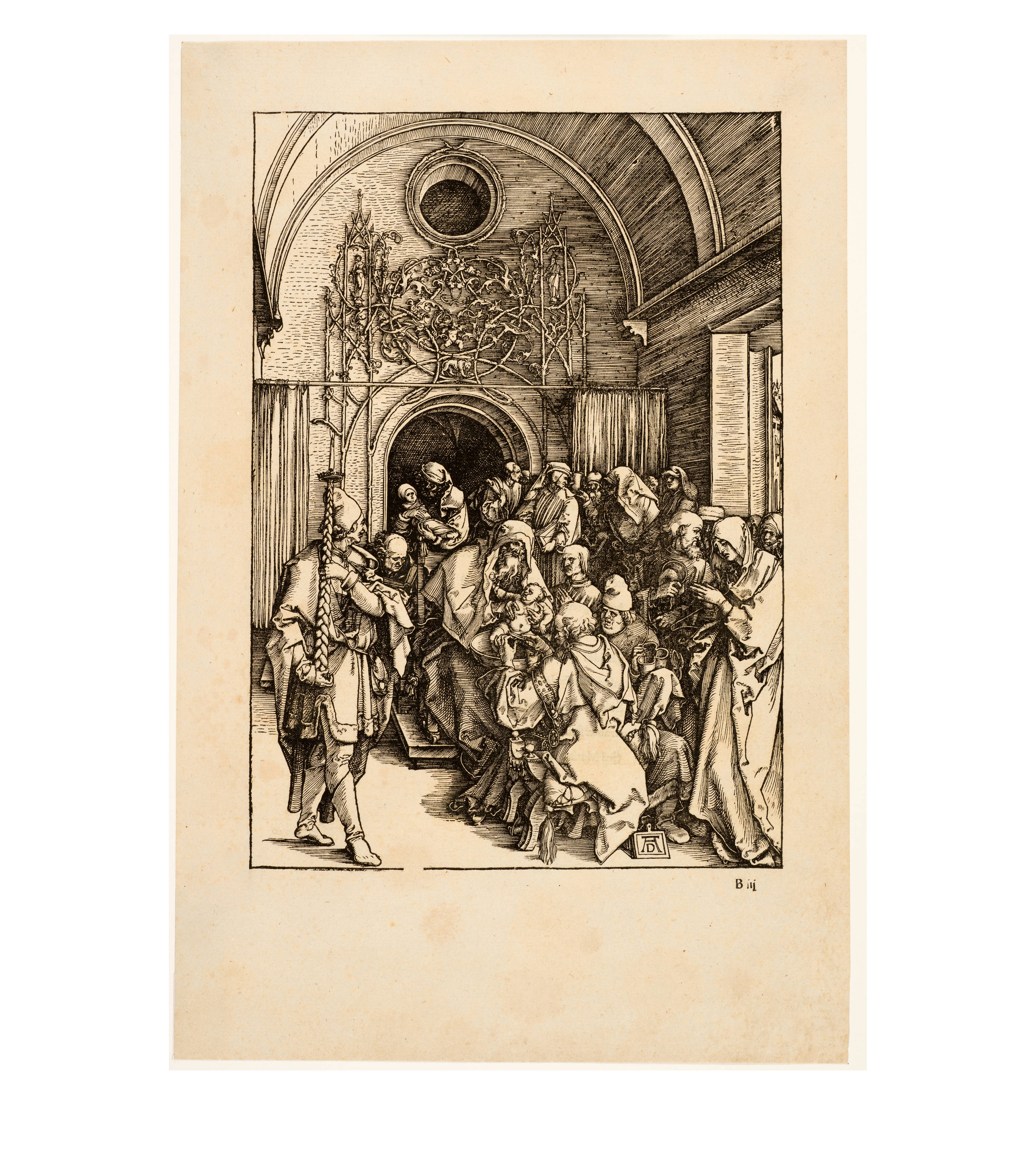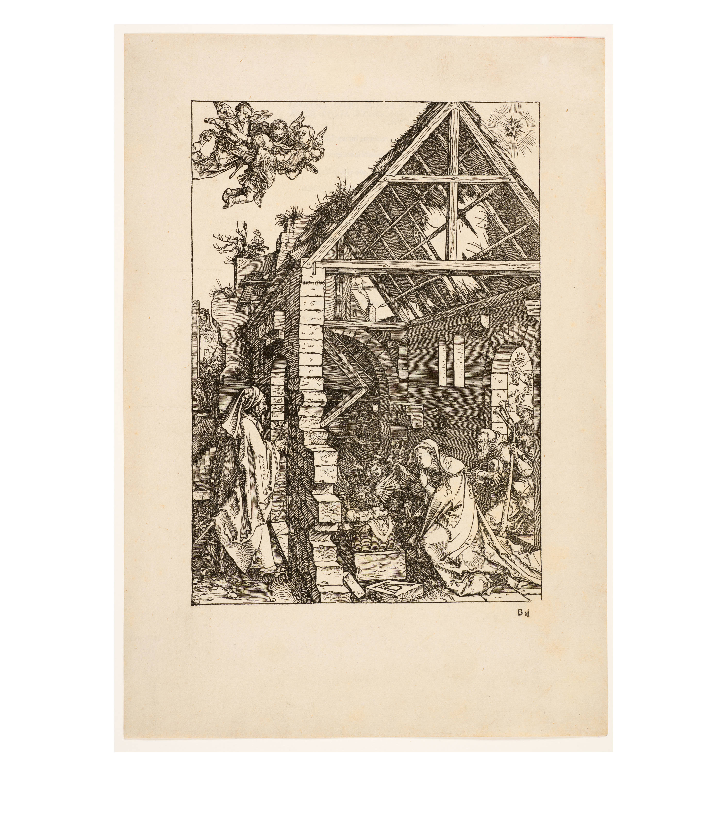 Dürer accompanied his sheets with Latin verses by Benedikt Schwalbe, a learned monk at the Benedictine monastery of St. Egidien in Nuremberg, which after 1500 was a center of humanism. In keeping with the custom of the time, he Latinized his name to "Benedictus Chelidonius" In the book version, the texts are placed opposite the respective images, so that on the reverse of the woodcuts are the descriptions of the following image. Since the life of Mary is only mentioned incidentally in the Bible, Dürer and Chelidonius turned to other sources for image and text. In particular, the apocryphal "Protoevangelium des Jakobus" attributed to the disciple James, and the "Legenda aurea" by Jacobus de Voragine should be mentioned. The latter further embellished the account of Mary's life in the Protoevangelium and placed it at the beginning of his book, before moving on to the lives and martyrdoms of numerous saints. "Das Marienleben" has long been considered the most mature creation among Dürer's woodcut series.