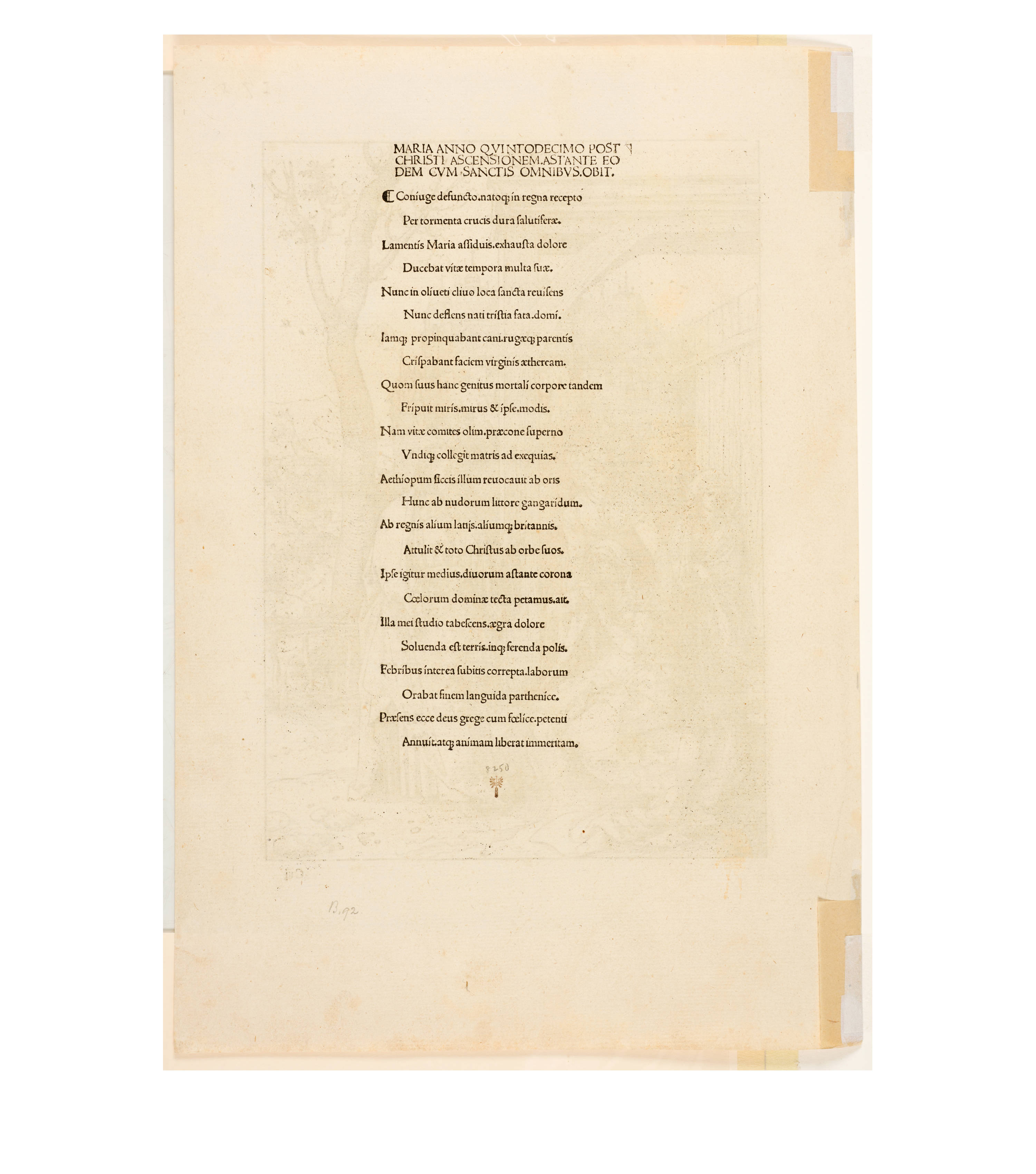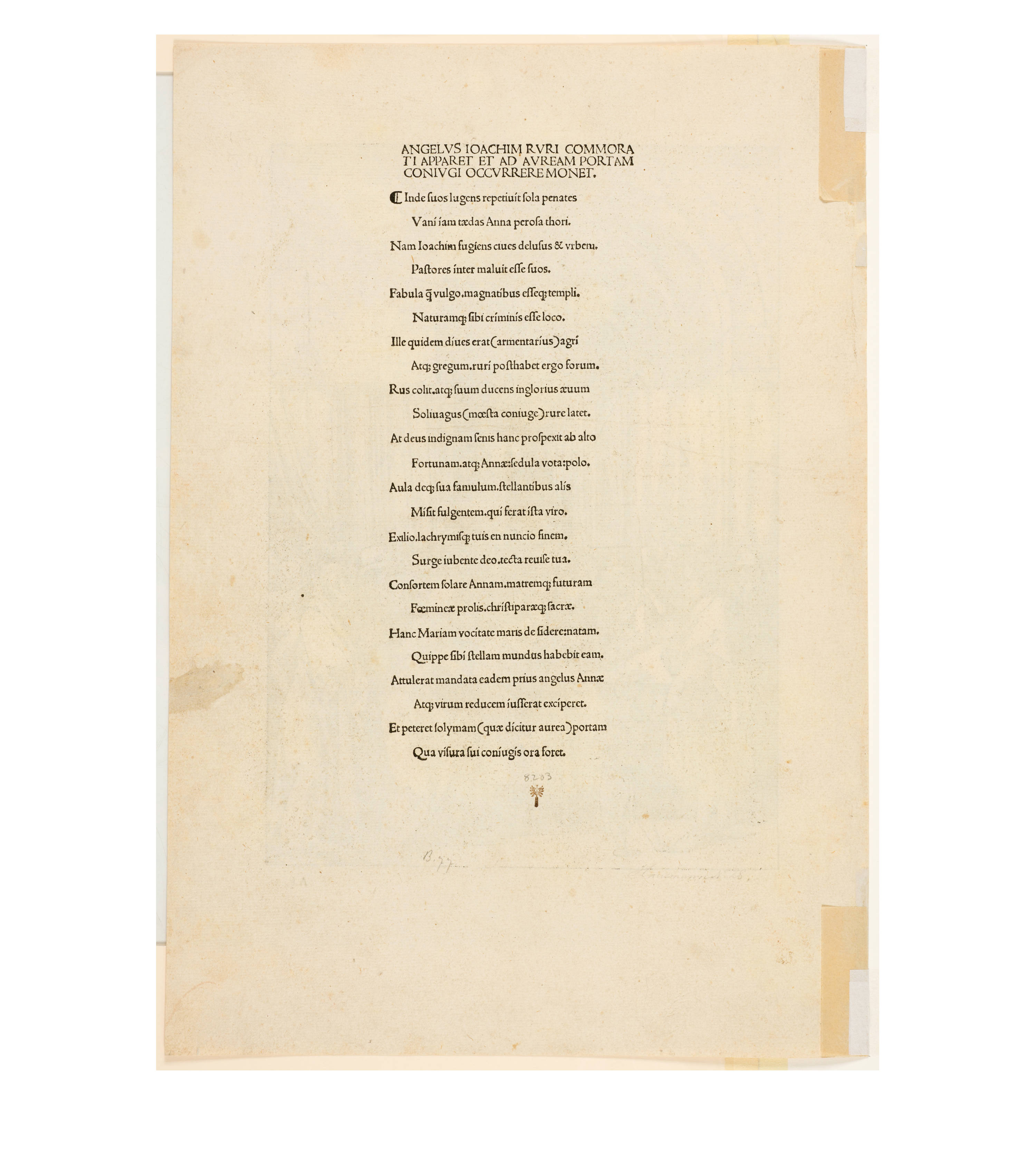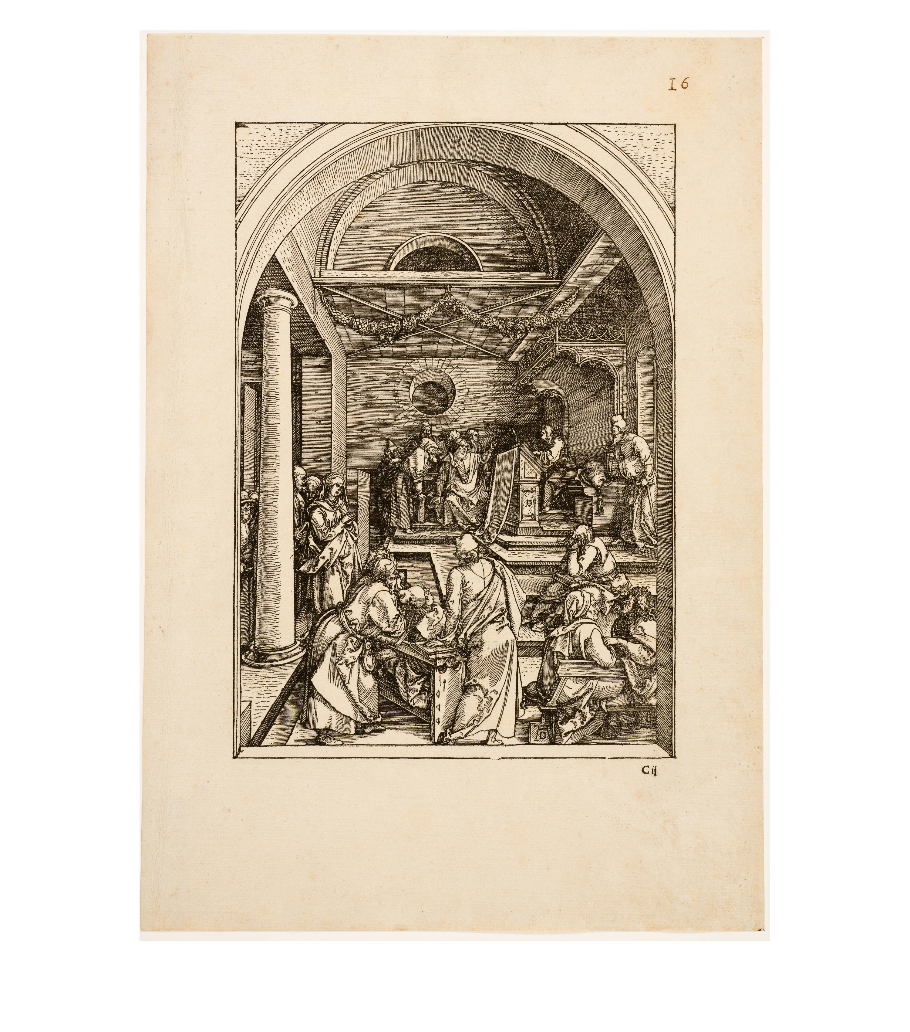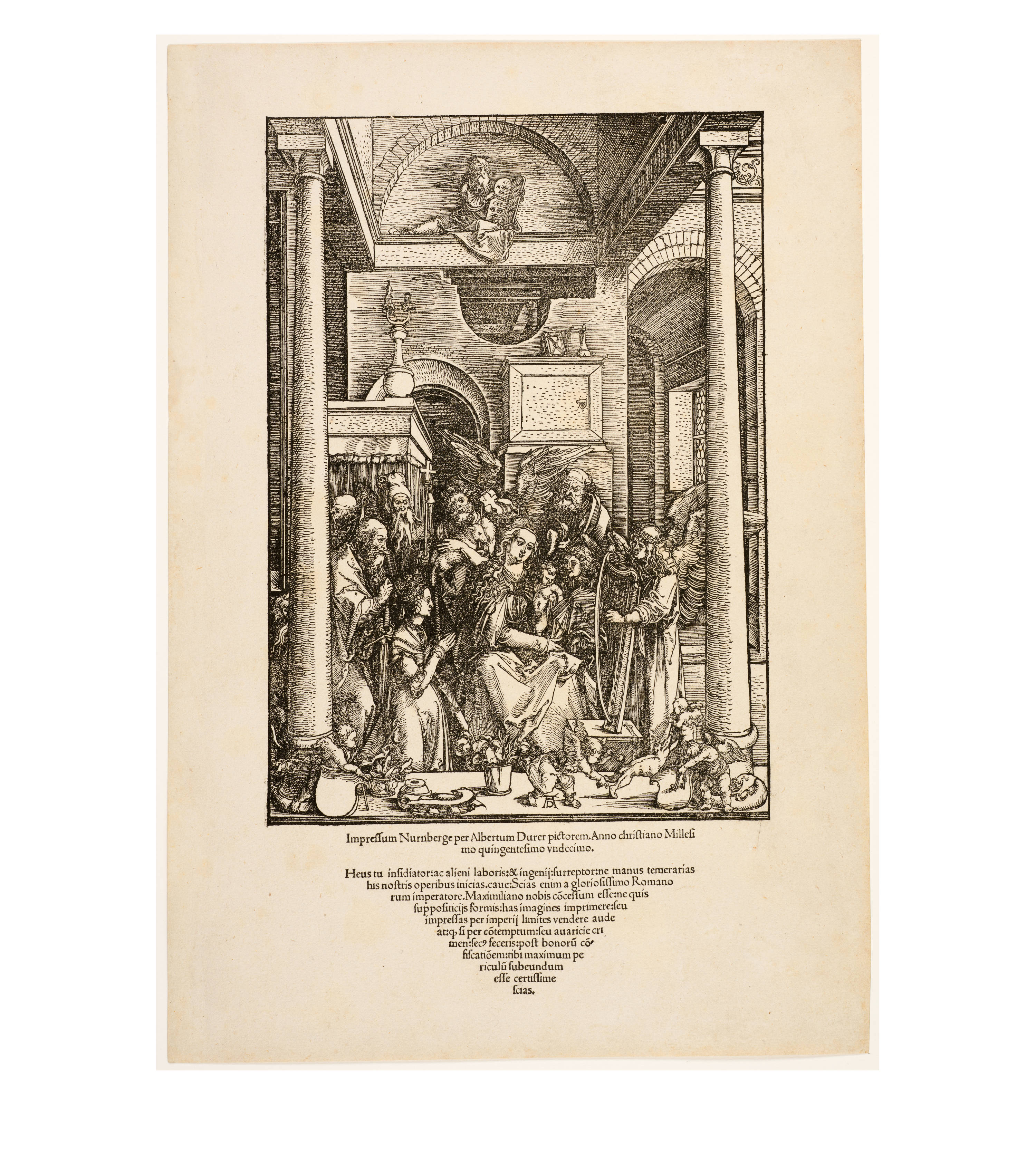 Dürer accompanied his sheets with Latin verses by Benedikt Schwalbe, a learned monk at the Benedictine monastery of St. Egidien in Nuremberg, which after 1500 was a center of humanism. In keeping with the custom of the time, he Latinized his name to "Benedictus Chelidonius" In the book version, the texts are placed opposite the respective images, so that on the reverse of the woodcuts are the descriptions of the following image. Since the life of Mary is only mentioned incidentally in the Bible, Dürer and Chelidonius turned to other sources for image and text. In particular, the apocryphal "Protoevangelium des Jakobus" attributed to the disciple James, and the "Legenda aurea" by Jacobus de Voragine should be mentioned. The latter further embellished the account of Mary's life in the Protoevangelium and placed it at the beginning of his book, before moving on to the lives and martyrdoms of numerous saints. "Das Marienleben" has long been considered the most mature creation among Dürer's woodcut series.