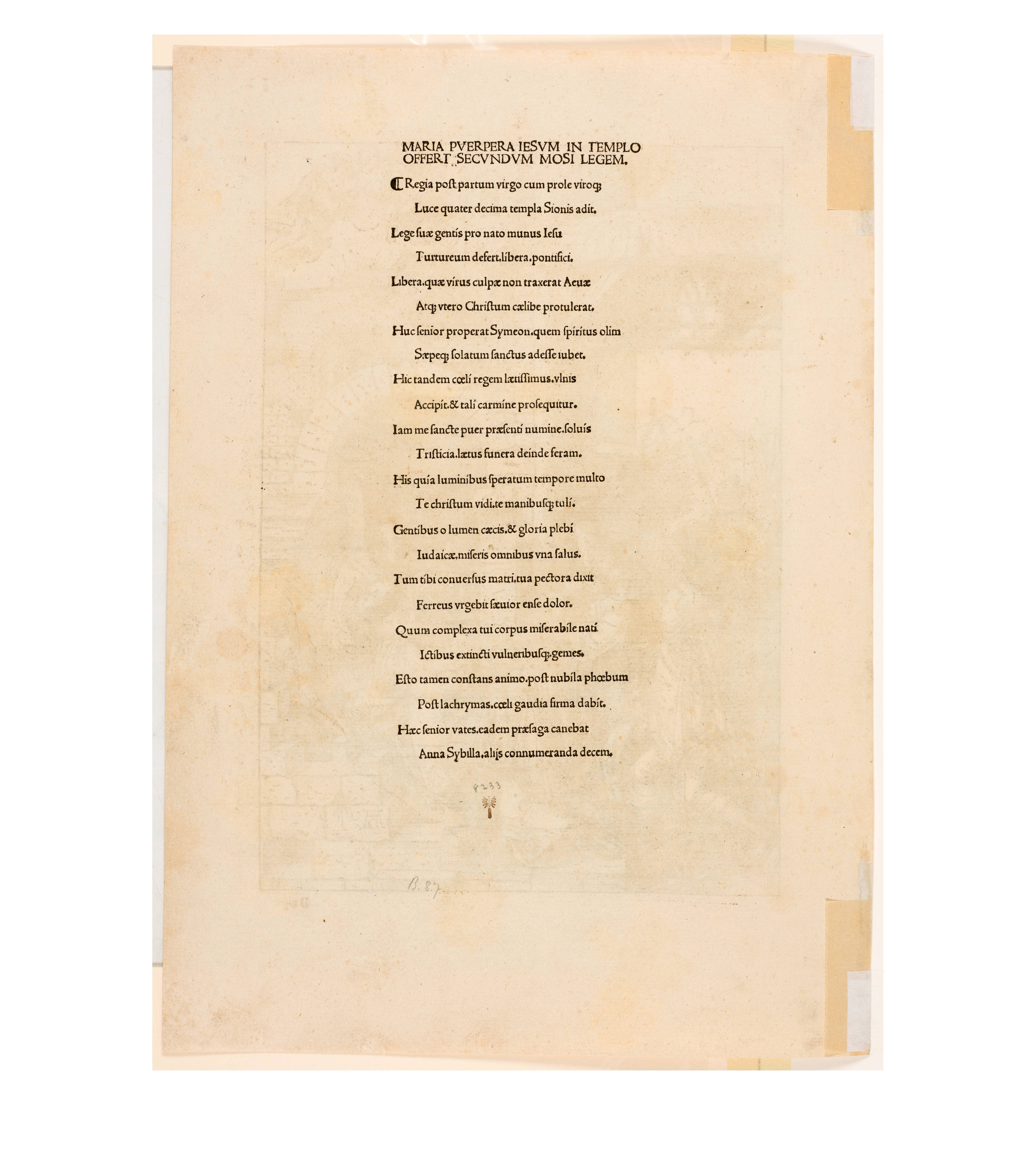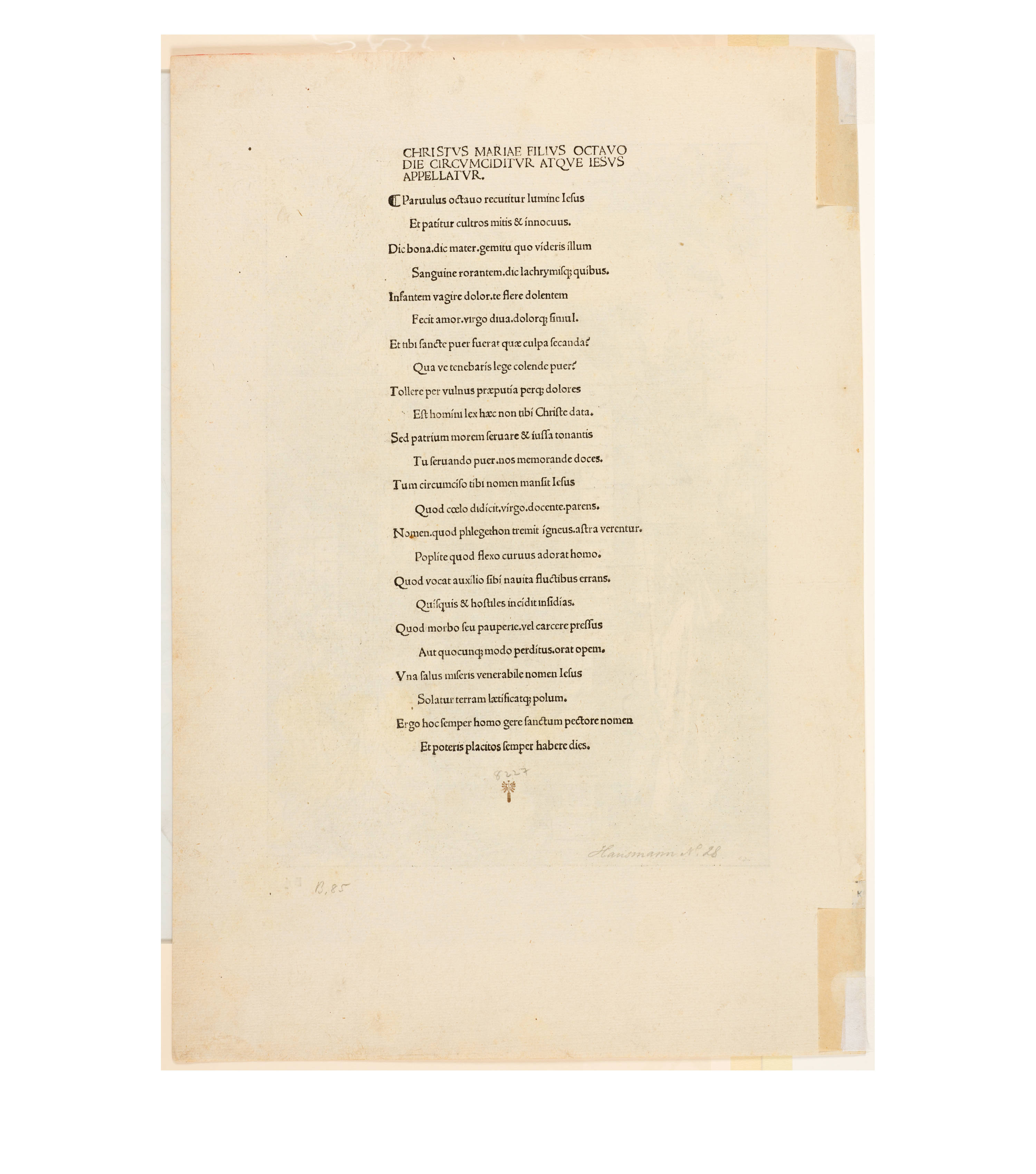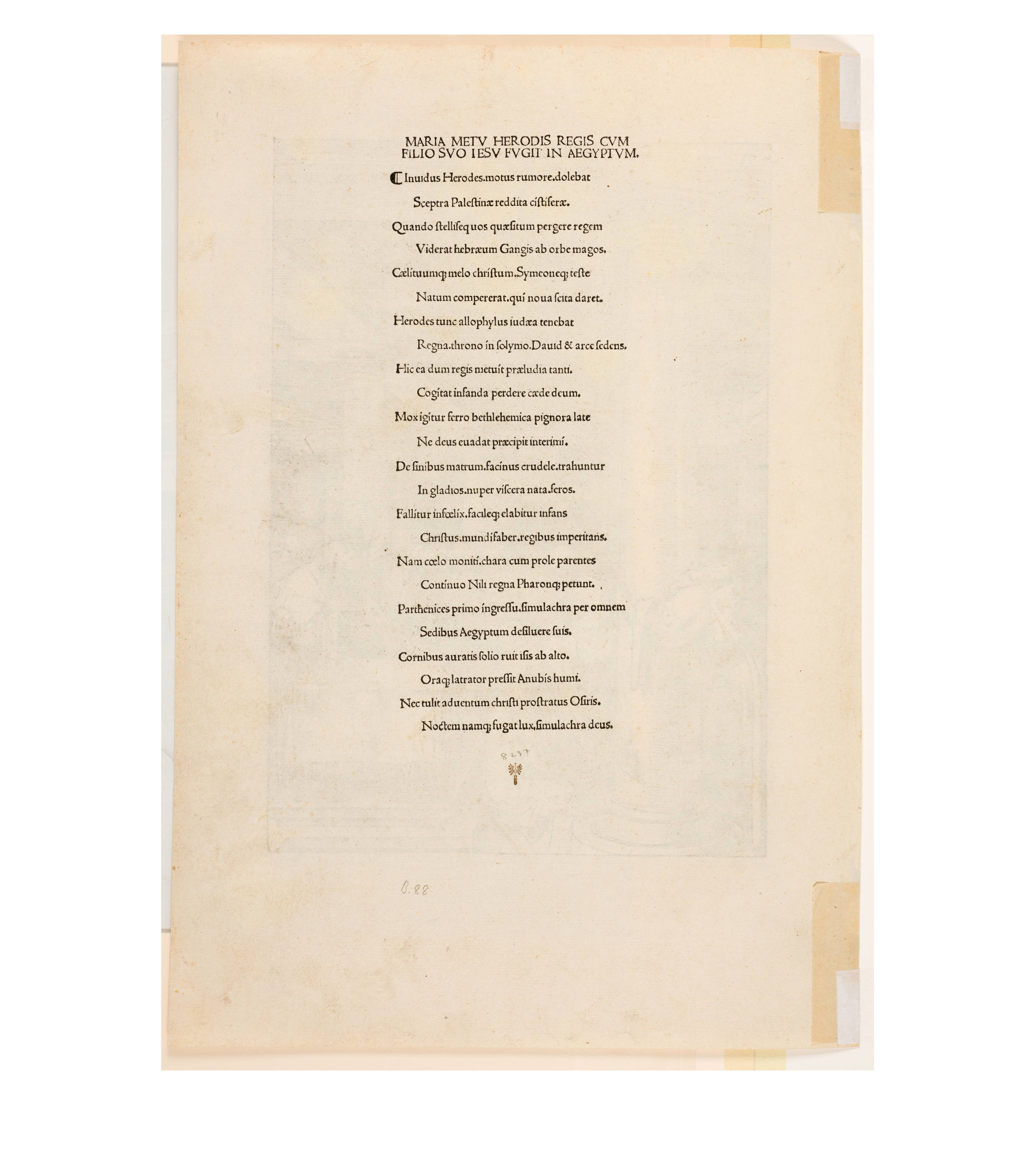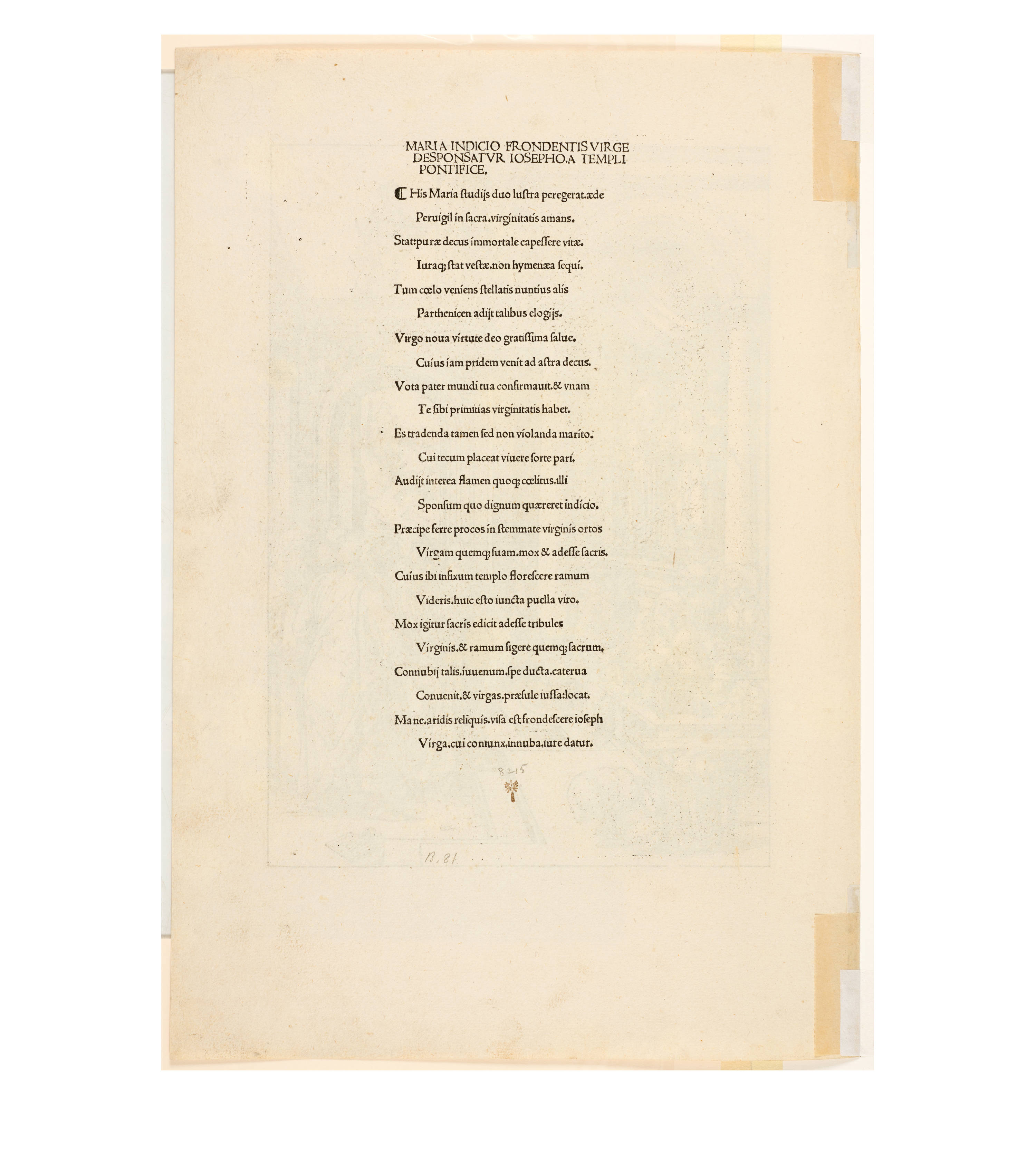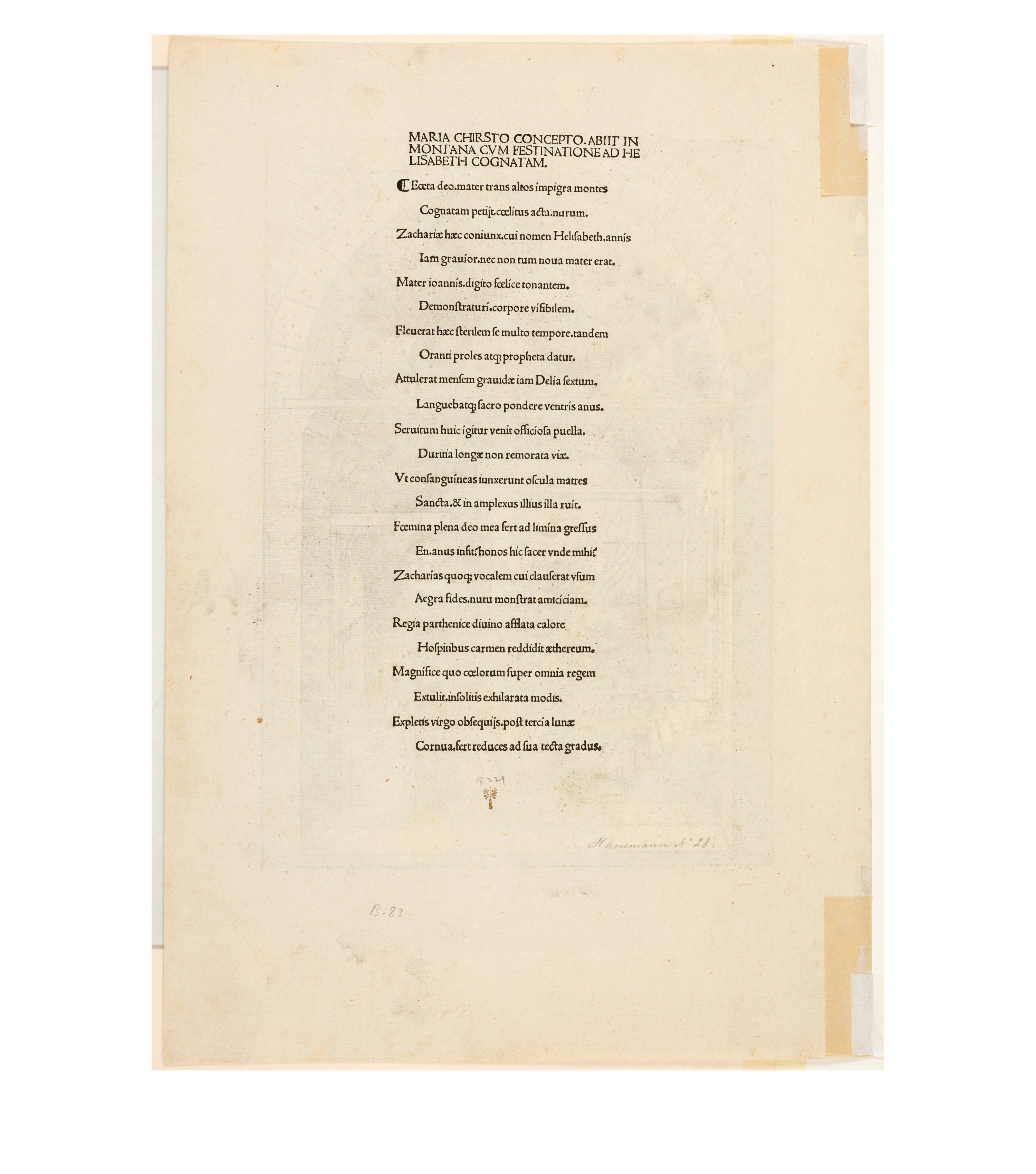 Dürer accompanied his sheets with Latin verses by Benedikt Schwalbe, a learned monk at the Benedictine monastery of St. Egidien in Nuremberg, which after 1500 was a center of humanism. In keeping with the custom of the time, he Latinized his name to "Benedictus Chelidonius" In the book version, the texts are placed opposite the respective images, so that on the reverse of the woodcuts are the descriptions of the following image. Since the life of Mary is only mentioned incidentally in the Bible, Dürer and Chelidonius turned to other sources for image and text. In particular, the apocryphal "Protoevangelium des Jakobus" attributed to the disciple James, and the "Legenda aurea" by Jacobus de Voragine should be mentioned. The latter further embellished the account of Mary's life in the Protoevangelium and placed it at the beginning of his book, before moving on to the lives and martyrdoms of numerous saints. "Das Marienleben" has long been considered the most mature creation among Dürer's woodcut series.