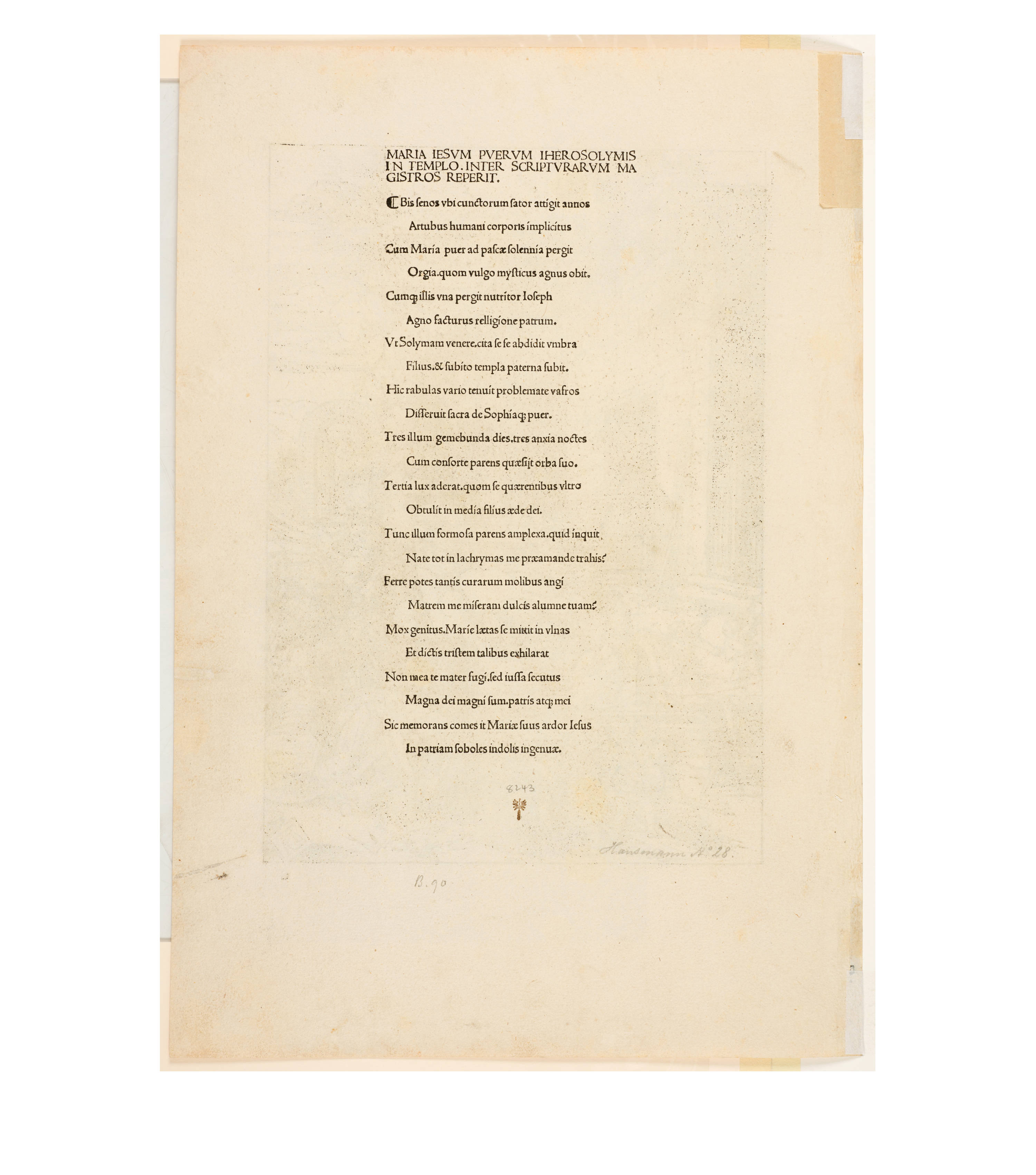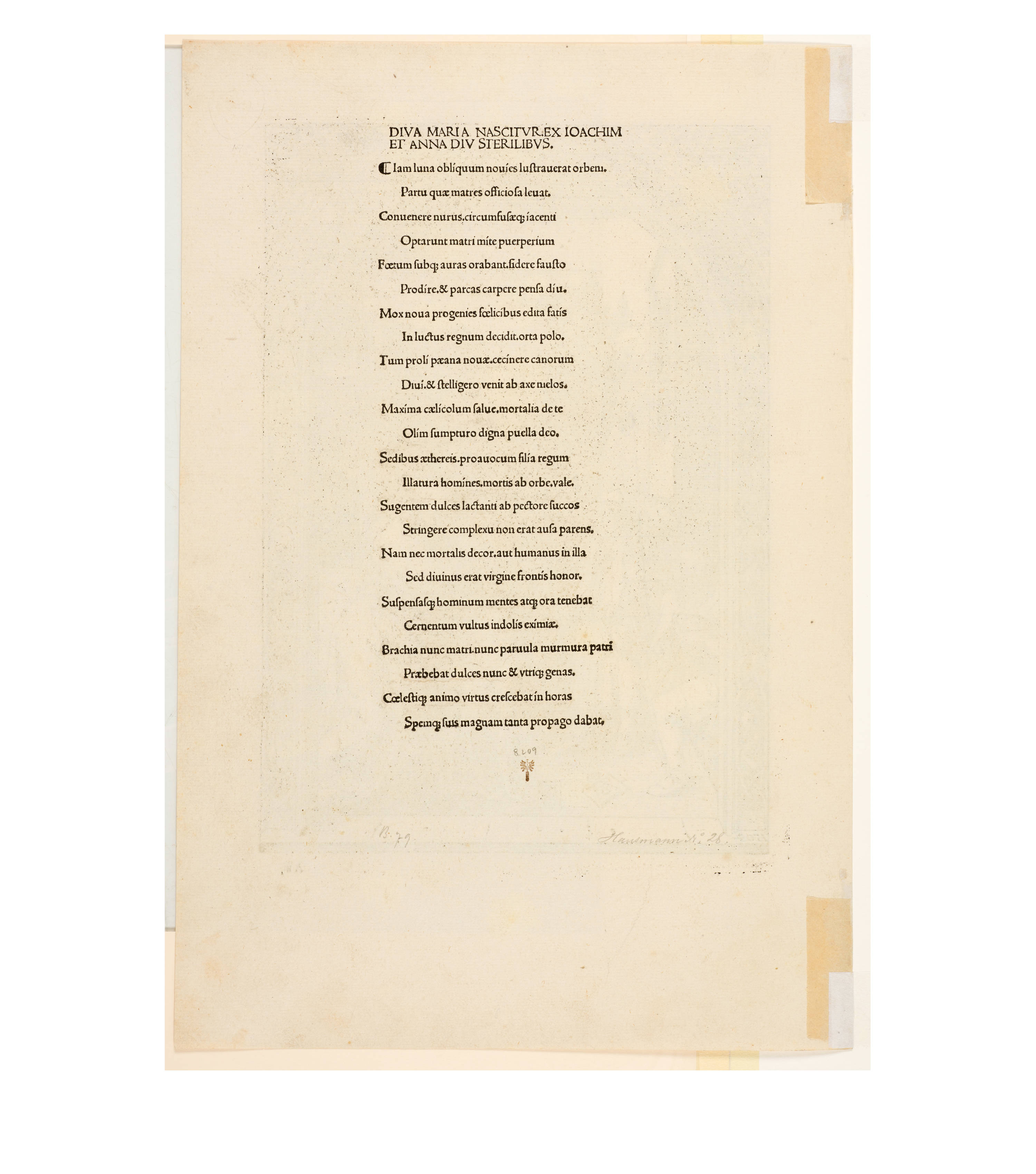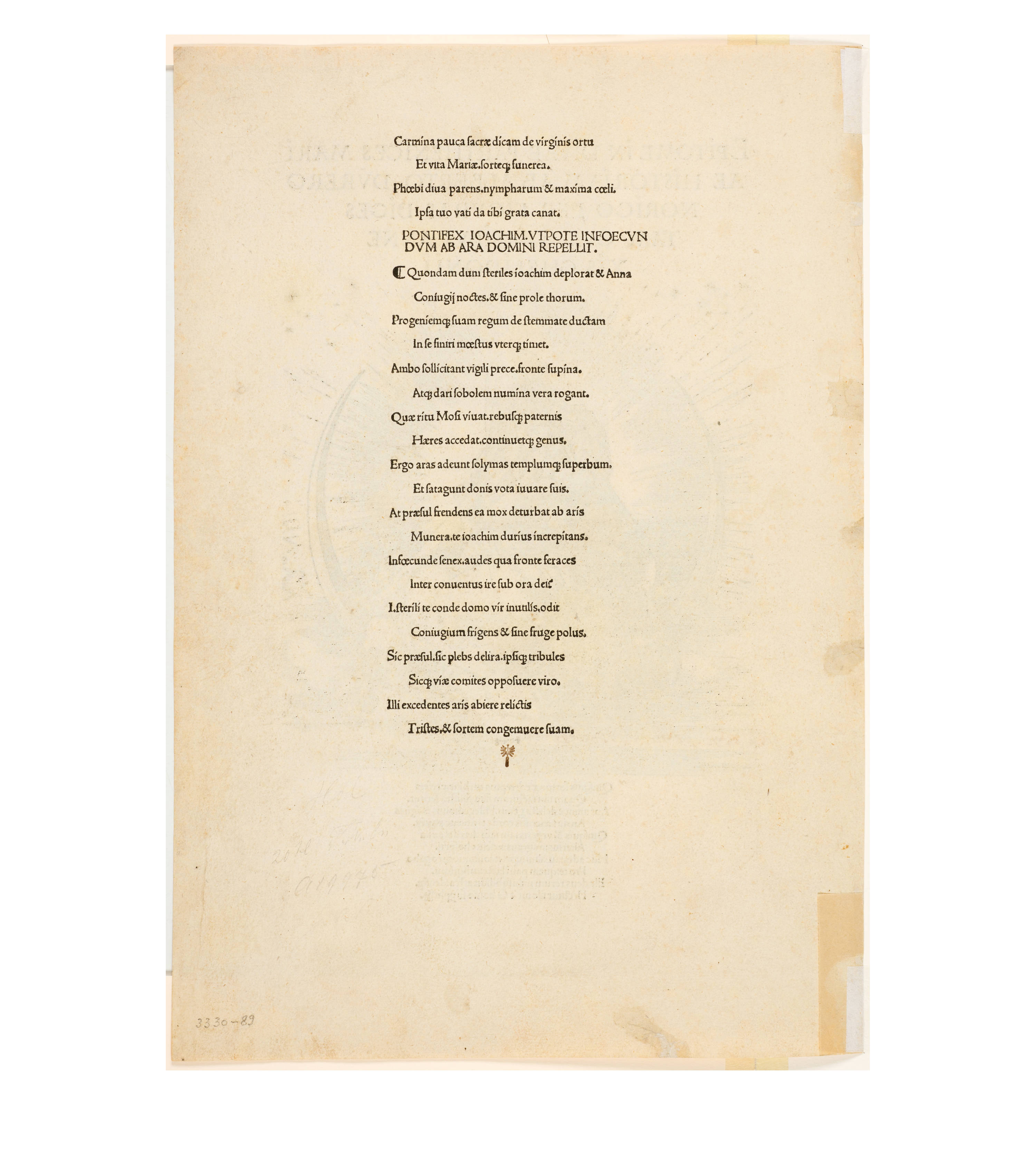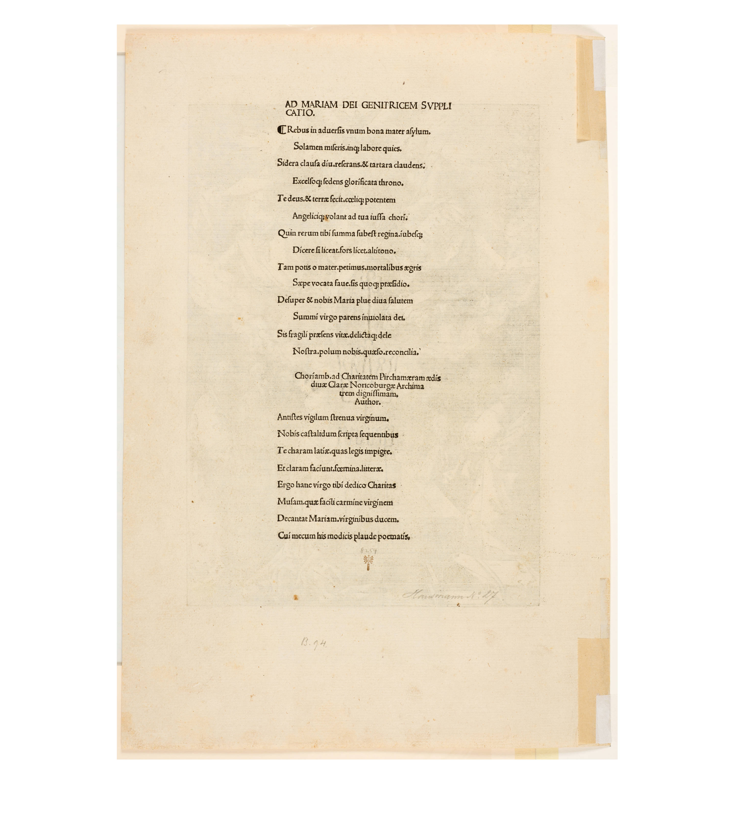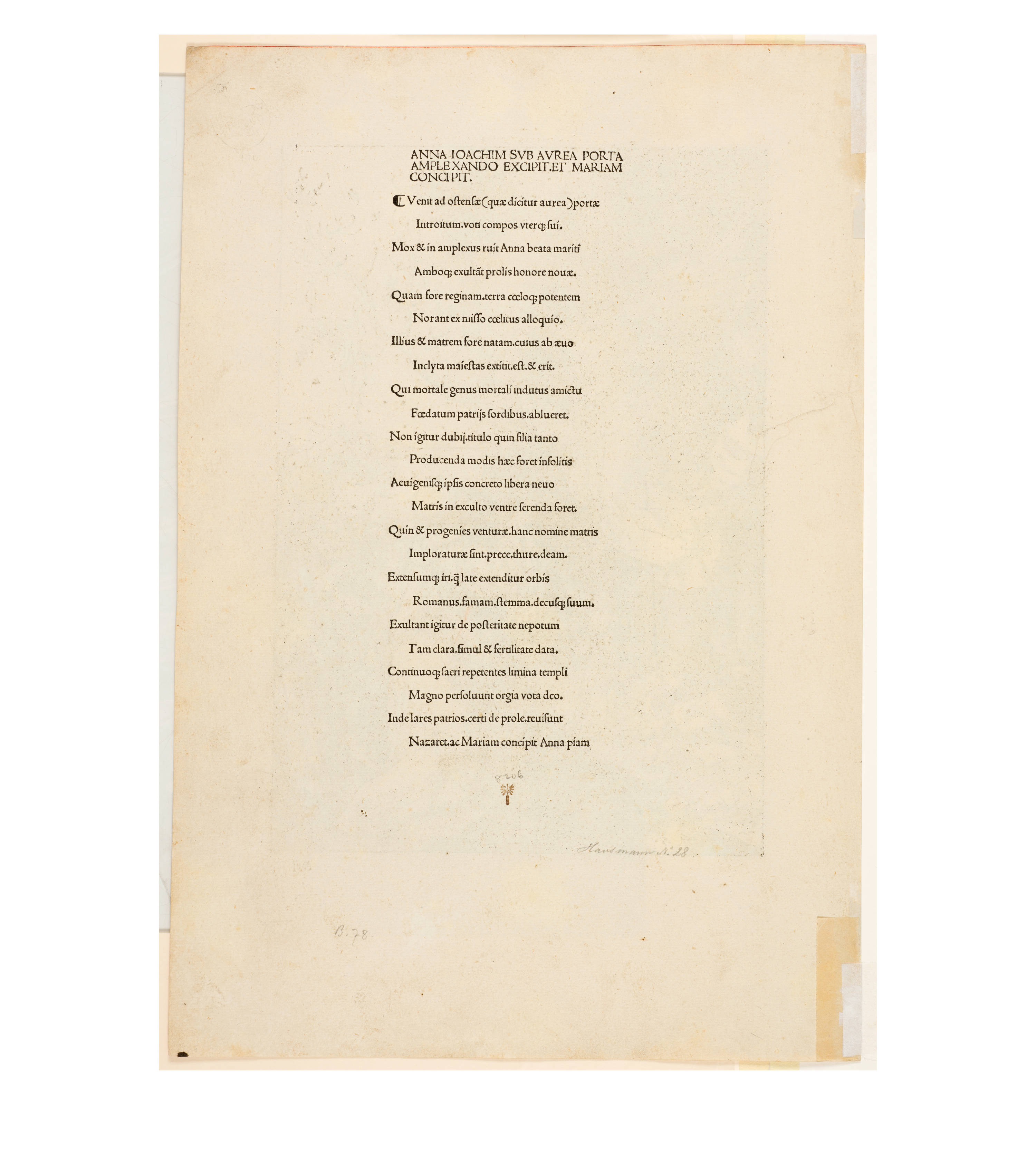 Dürer accompanied his sheets with Latin verses by Benedikt Schwalbe, a learned monk at the Benedictine monastery of St. Egidien in Nuremberg, which after 1500 was a center of humanism. In keeping with the custom of the time, he Latinized his name to "Benedictus Chelidonius" In the book version, the texts are placed opposite the respective images, so that on the reverse of the woodcuts are the descriptions of the following image. Since the life of Mary is only mentioned incidentally in the Bible, Dürer and Chelidonius turned to other sources for image and text. In particular, the apocryphal "Protoevangelium des Jakobus" attributed to the disciple James, and the "Legenda aurea" by Jacobus de Voragine should be mentioned. The latter further embellished the account of Mary's life in the Protoevangelium and placed it at the beginning of his book, before moving on to the lives and martyrdoms of numerous saints. "Das Marienleben" has long been considered the most mature creation among Dürer's woodcut series.