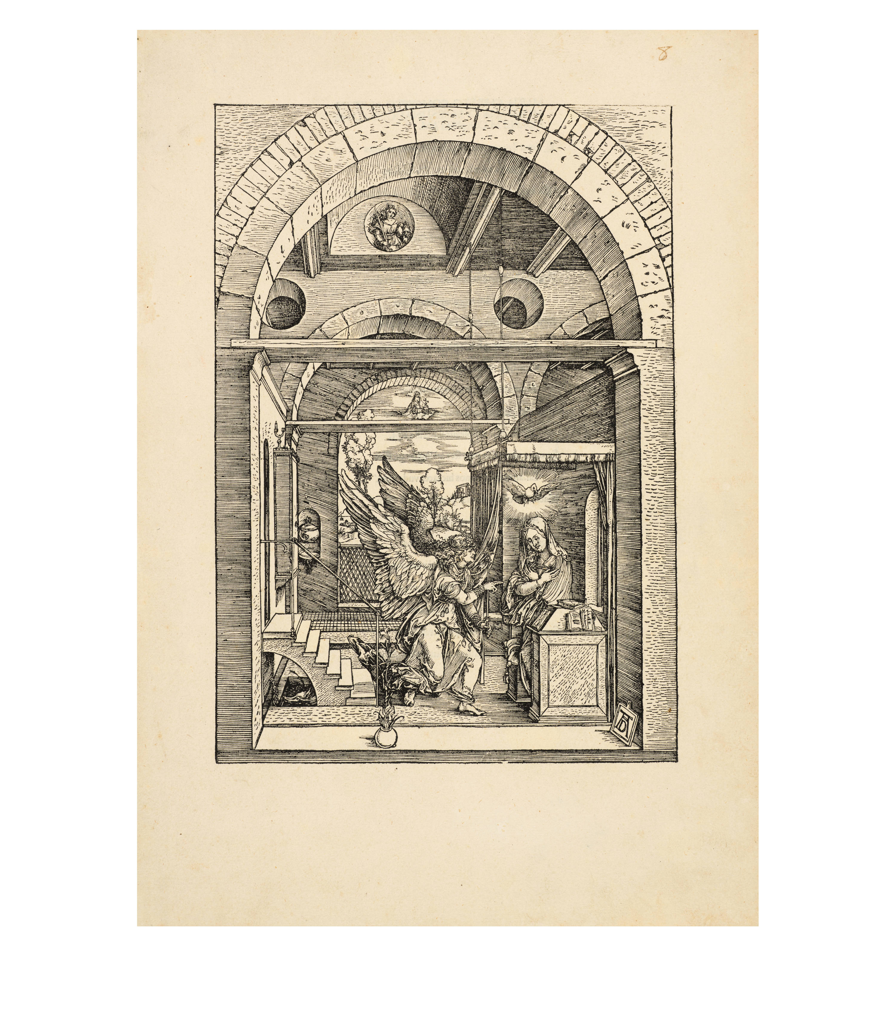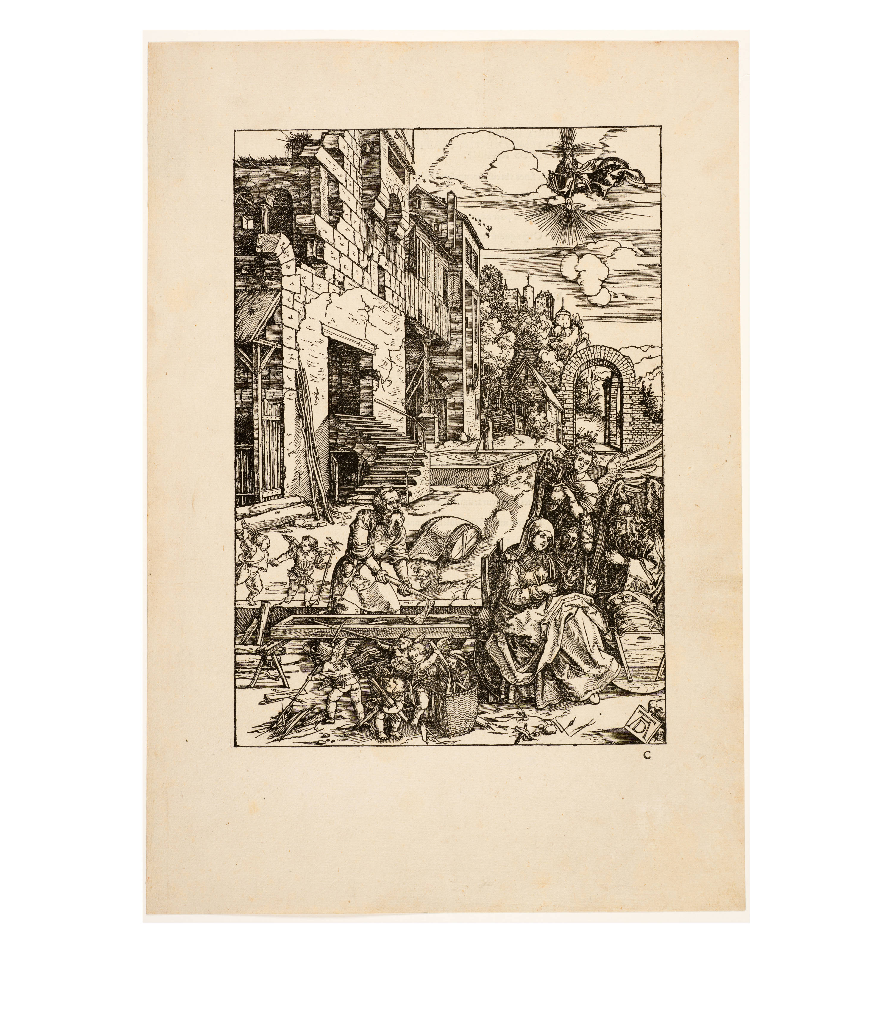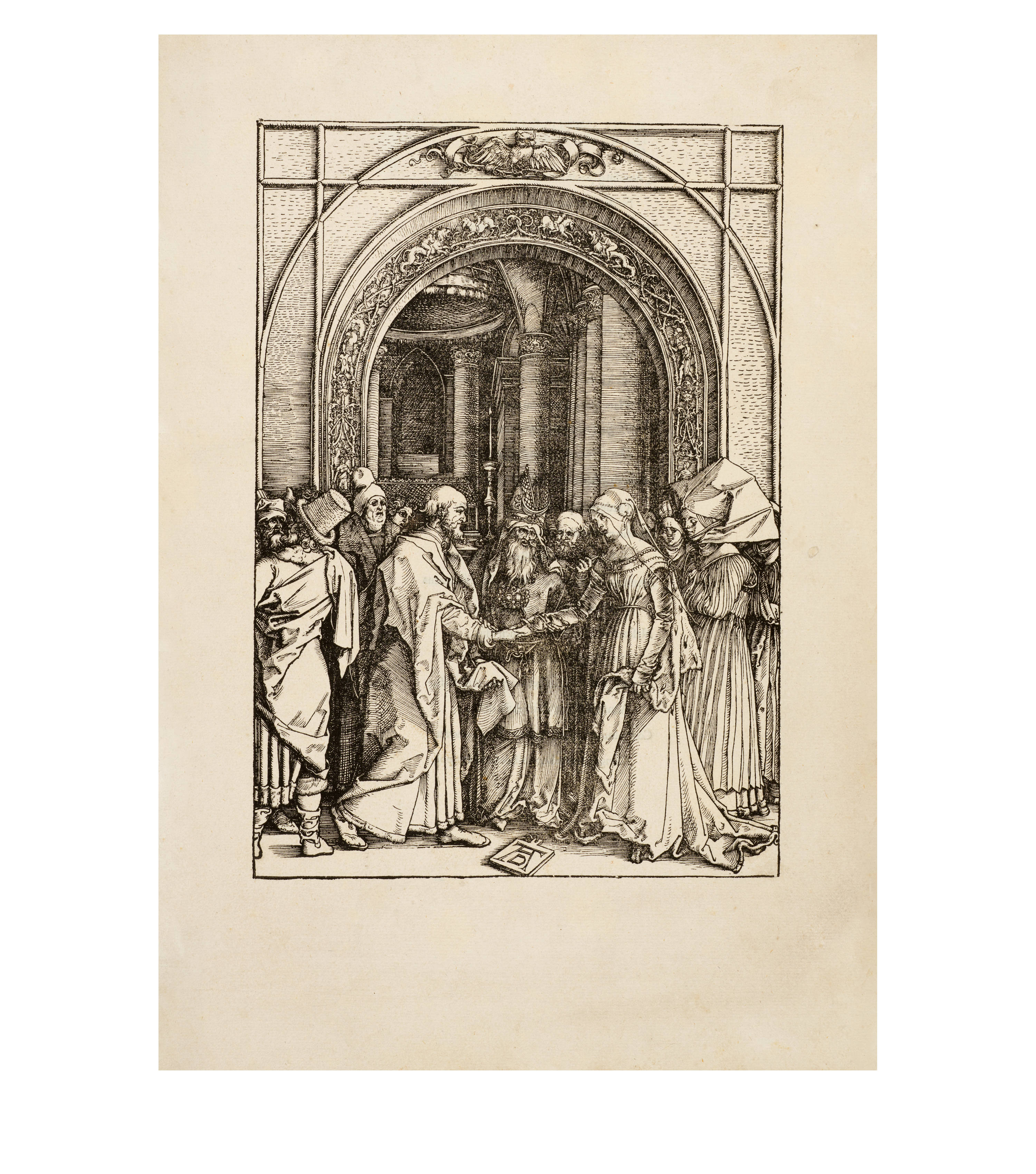 Dürer began work on his series "Das Marienleben" in 1502, which was completed and published in 1511. By 1505, 17 of the woodcuts had already been finished, and he took copies of these with him on his journey to Venice, which enabled Marc Antonio Raimondi to reproduce them as engravings. The exact date of creation of the sheets must be largely reconstructed through stylistic analysis due to the lack of dating information. Art history follows the idea that the chronological development moves from multi-part and complex compositions to simpler pictorial structures with the main protagonists positioned in the foreground. The great significance of architecture in Dürer's "Marienleben" is evidence of his engagement with the principles of perspective and Italian art.