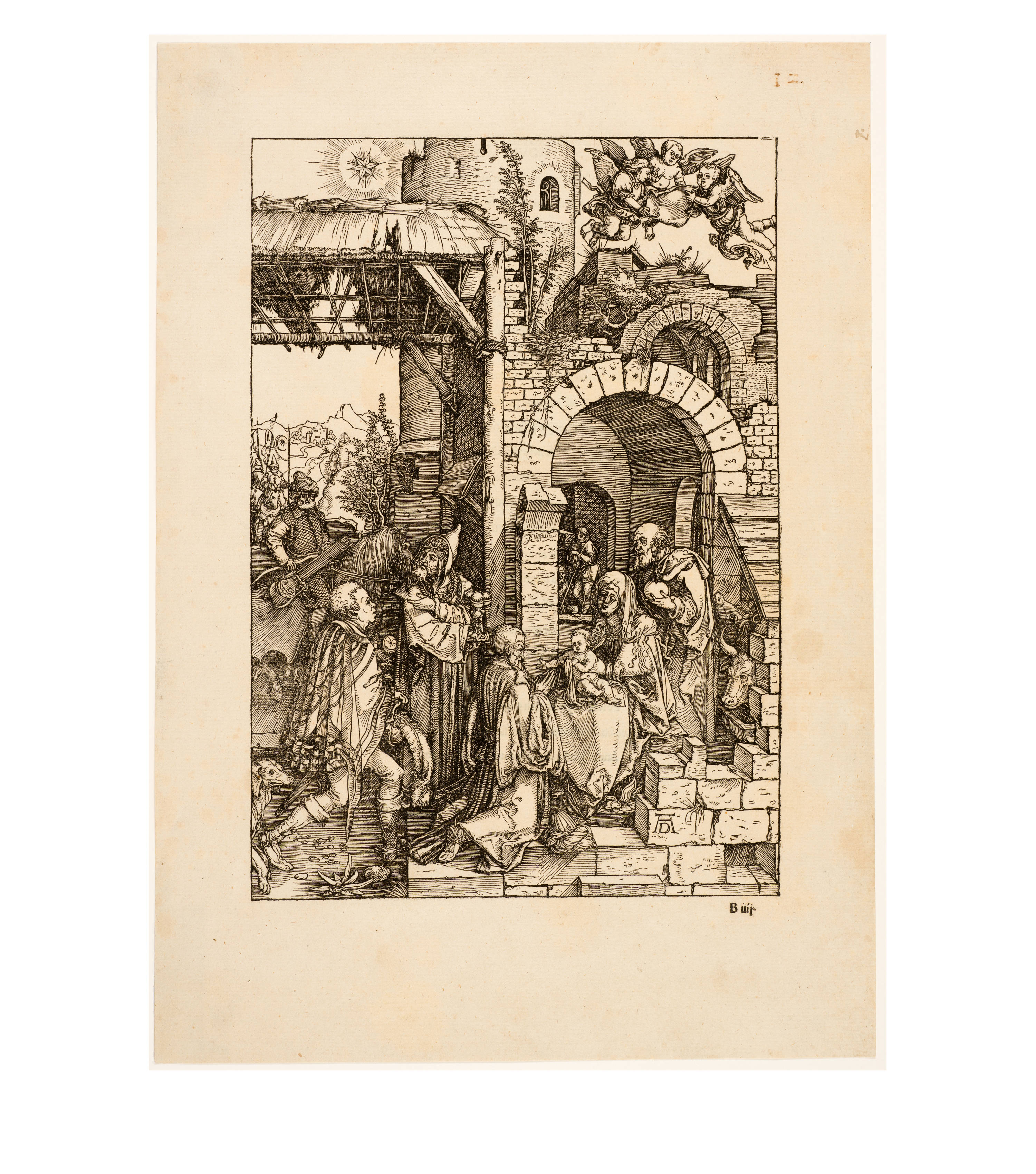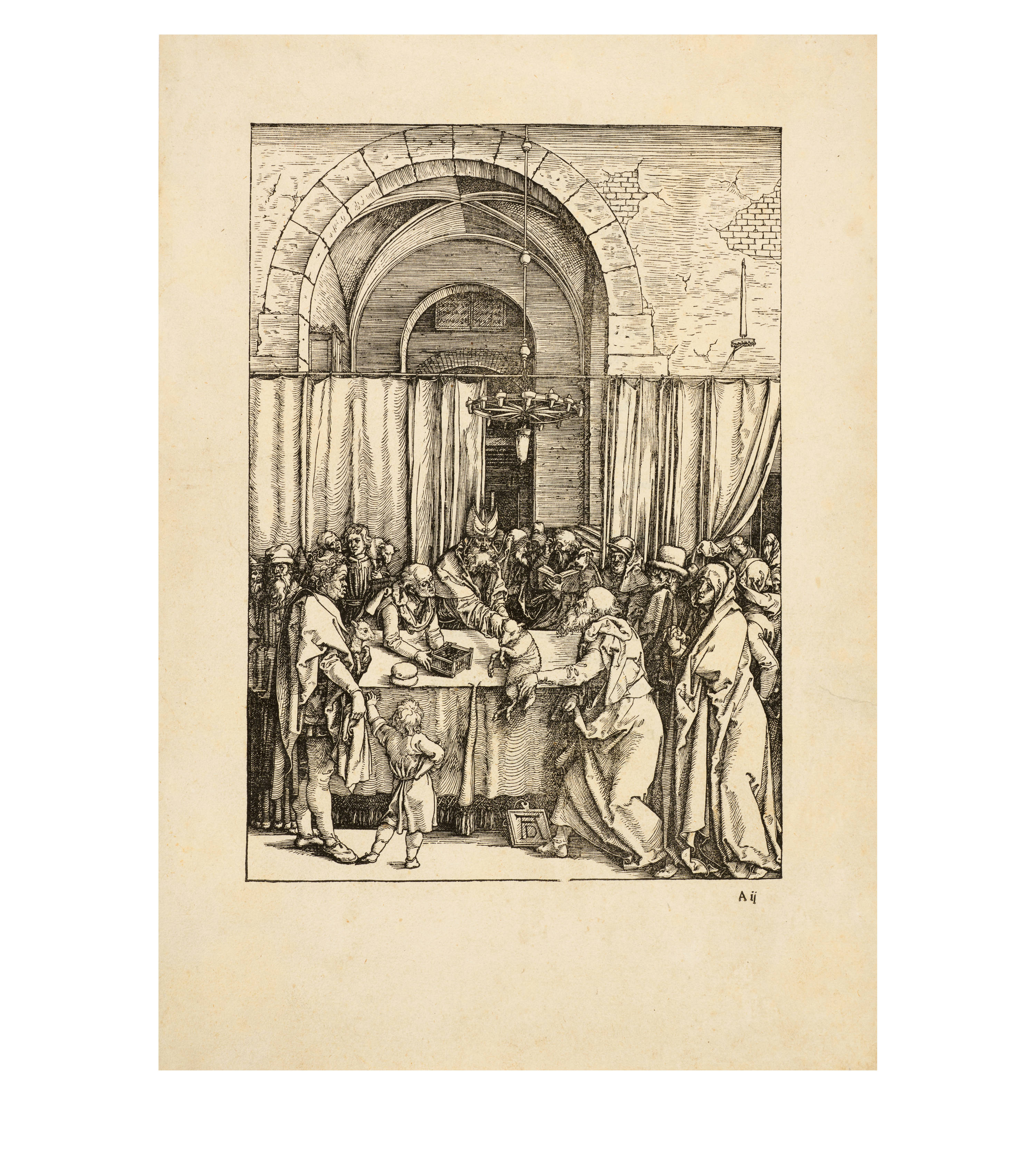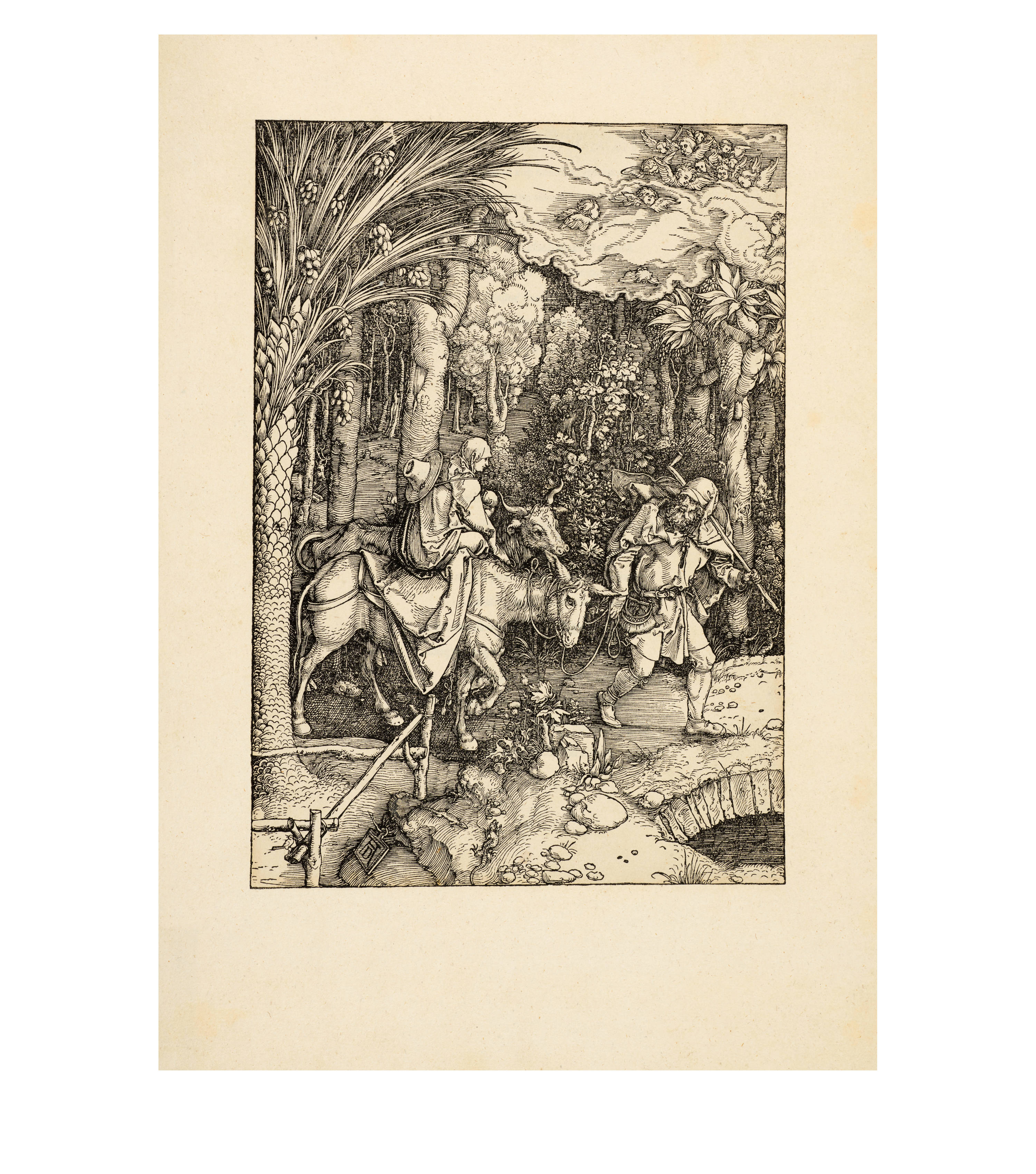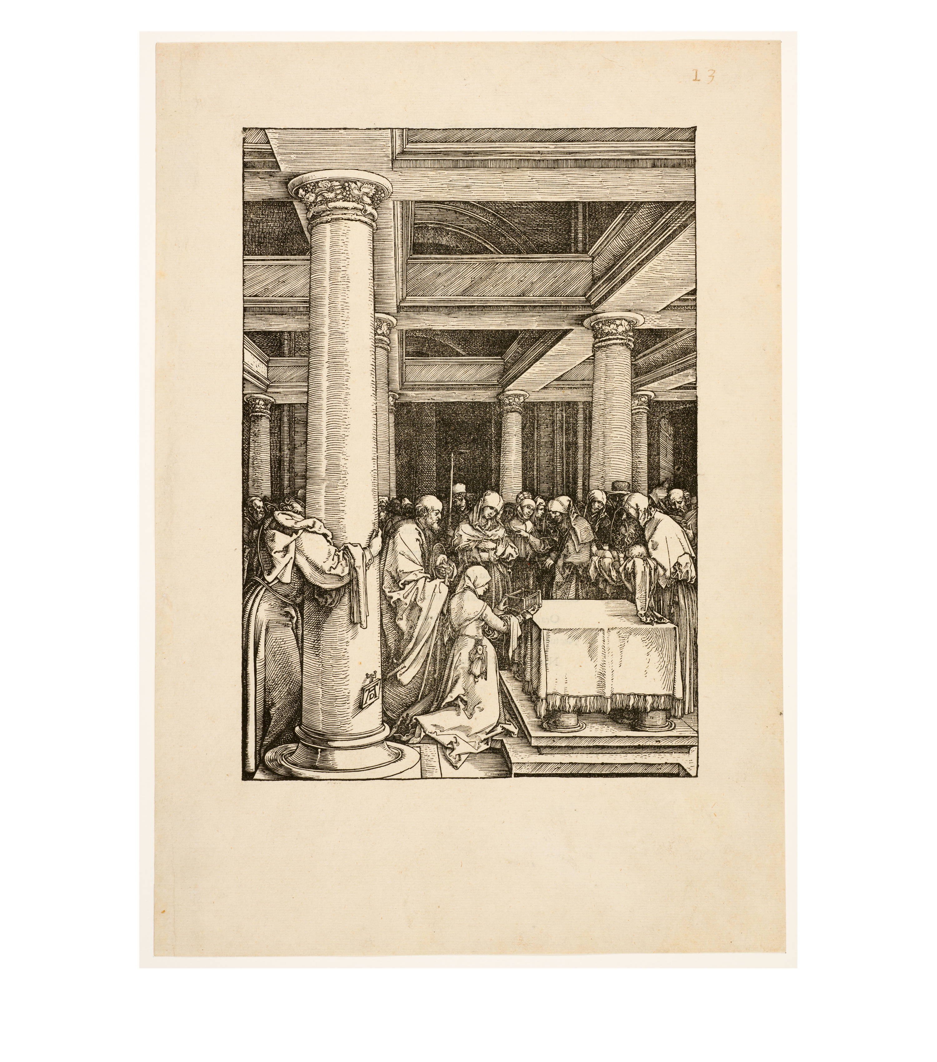 Dürer began work on his series "Das Marienleben" in 1502, which was completed and published in 1511. By 1505, 17 of the woodcuts had already been finished, and he took copies of these with him on his journey to Venice, which enabled Marc Antonio Raimondi to reproduce them as engravings. The exact date of creation of the sheets must be largely reconstructed through stylistic analysis due to the lack of dating information. Art history follows the idea that the chronological development moves from multi-part and complex compositions to simpler pictorial structures with the main protagonists positioned in the foreground. The great significance of architecture in Dürer's "Marienleben" is evidence of his engagement with the principles of perspective and Italian art.